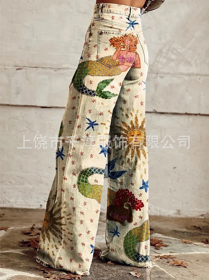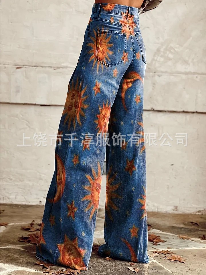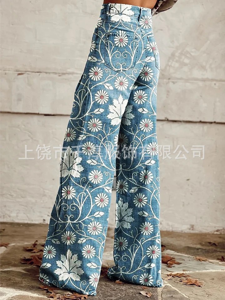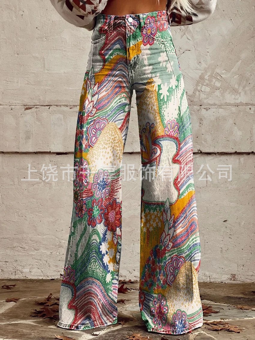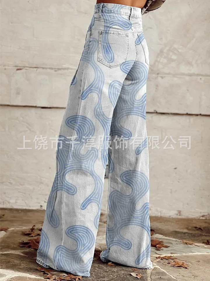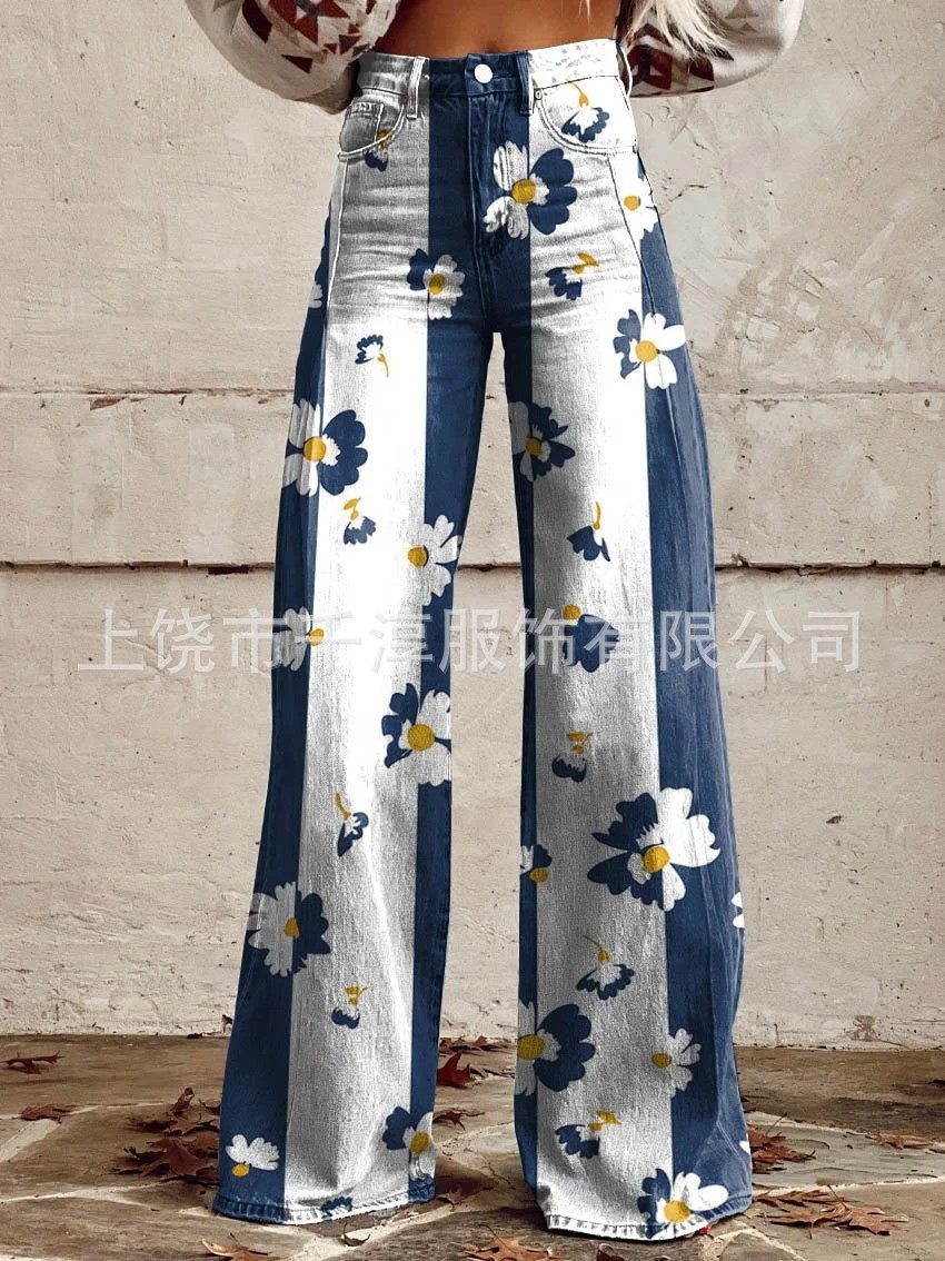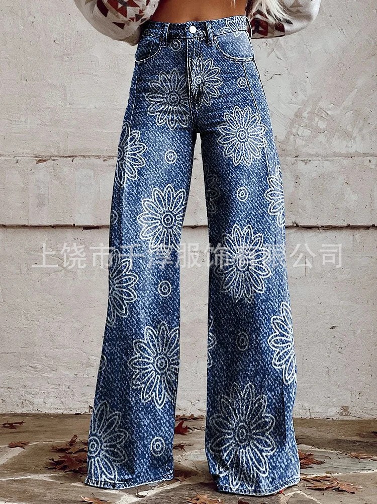 독립 스테이션 Xiyin 유럽과 미국 대외 무역 크로스 보더 여성 캐주얼 바지 프린트 모조 청바지 와이드 레그 3D 트렌디 패션 여성