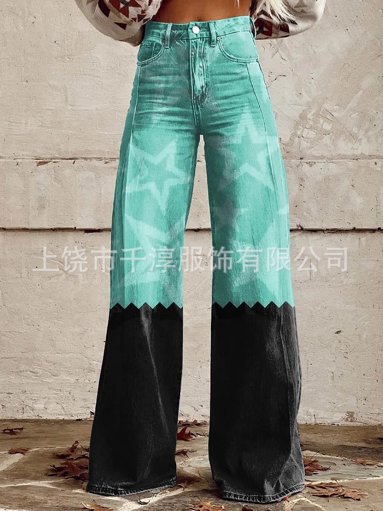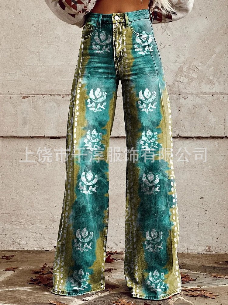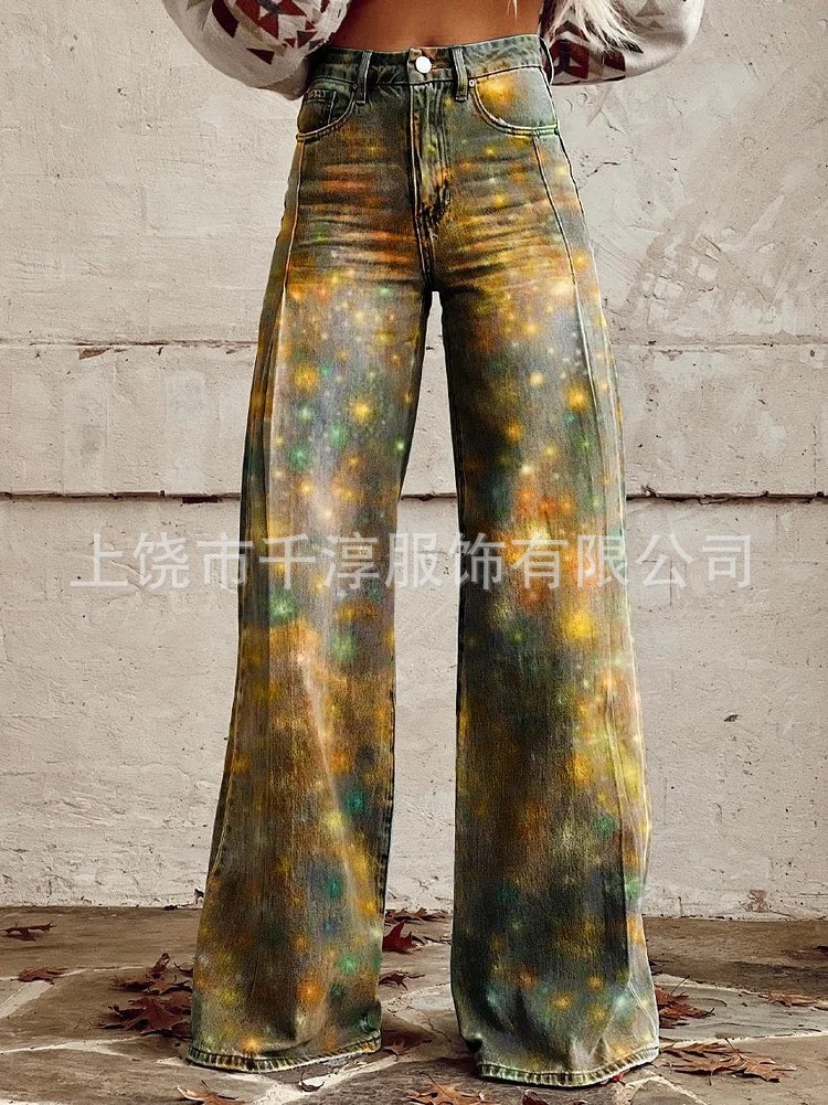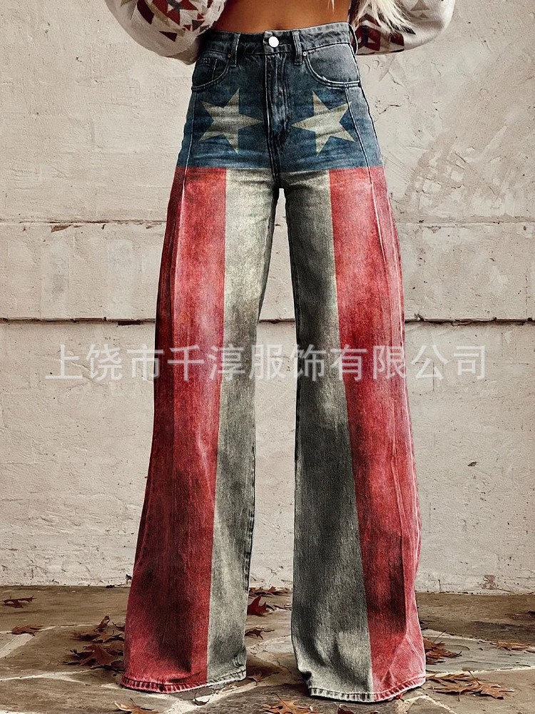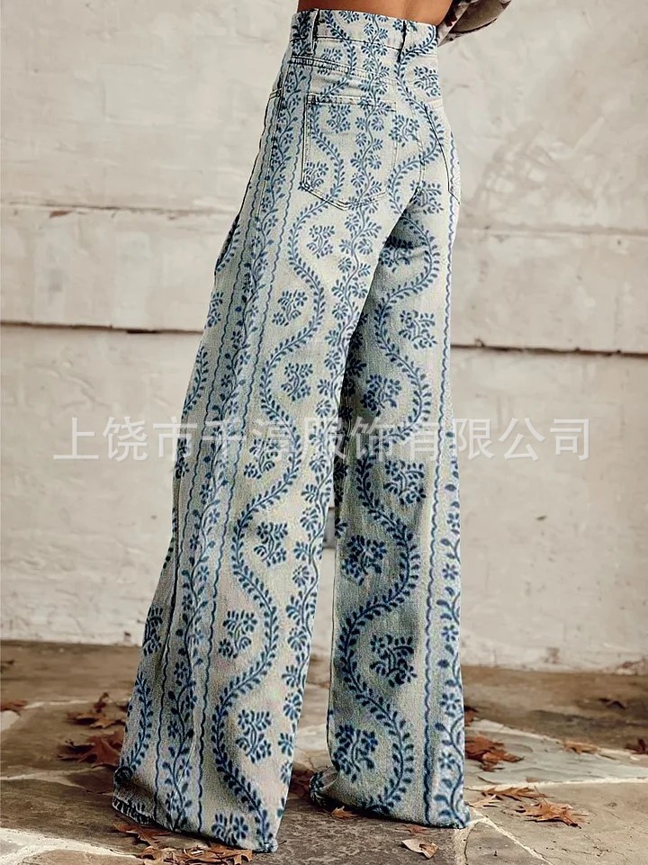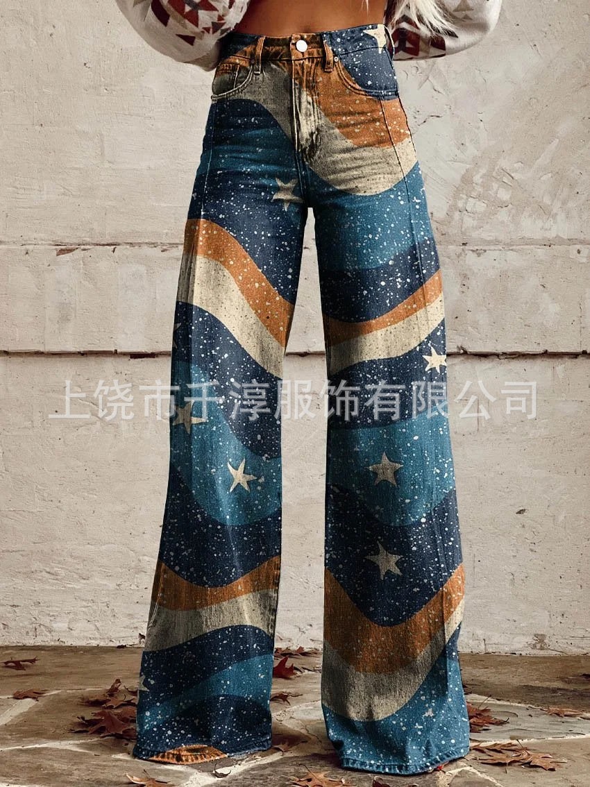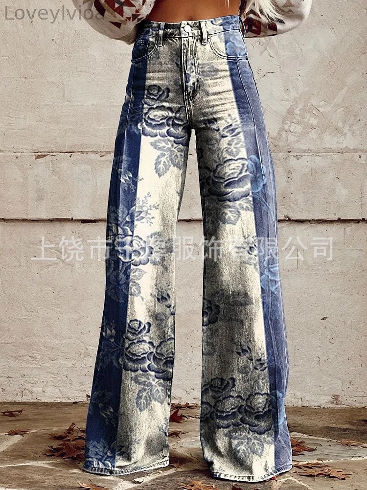 독립 스테이션 Xiyin 유럽과 미국 대외 무역 크로스 보더 여성 캐주얼 바지 프린트 모조 청바지 와이드 레그 3D 트렌디 패션 여성