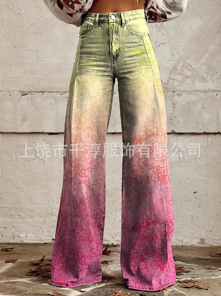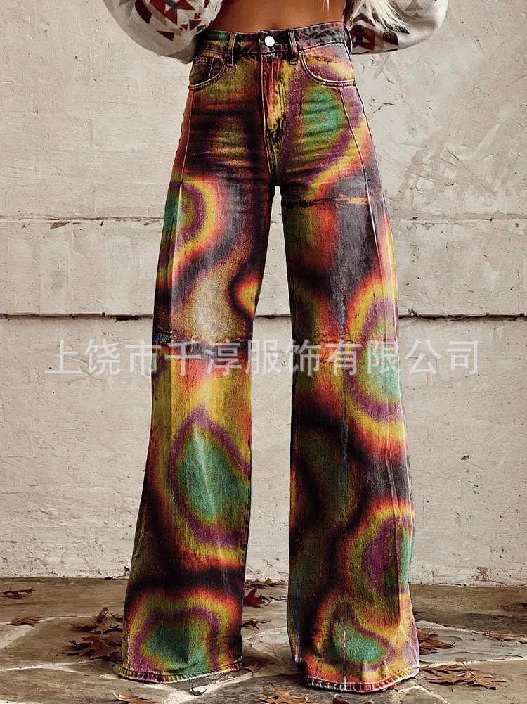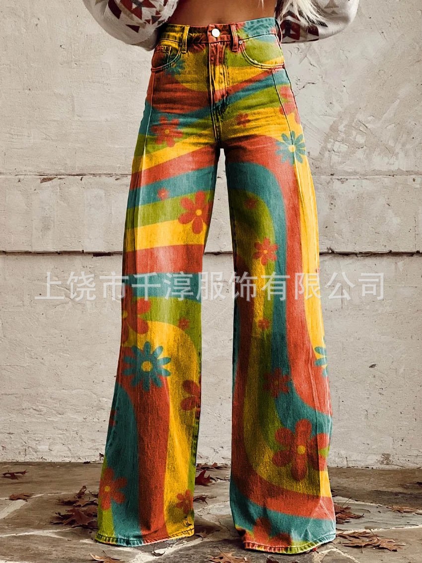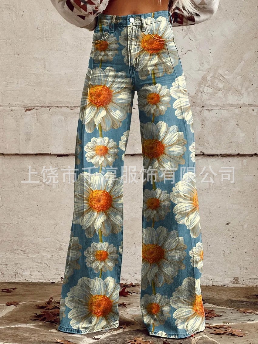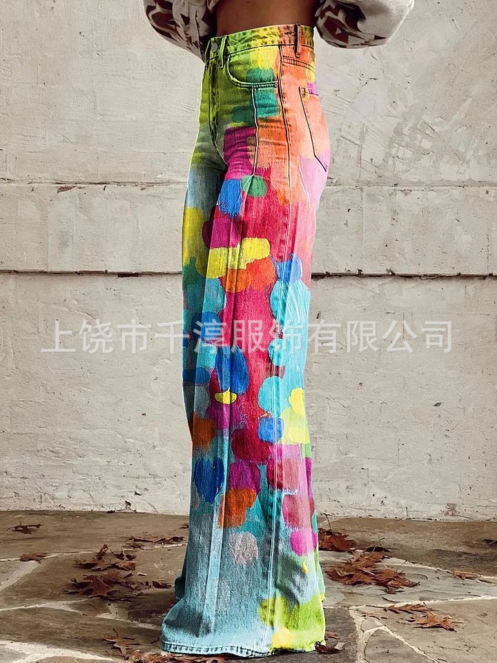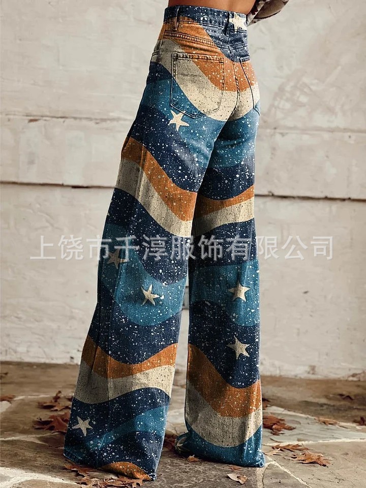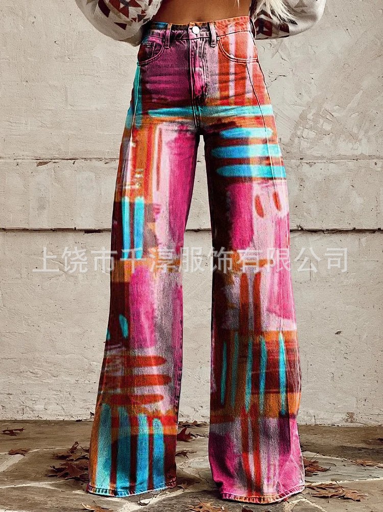 독립 스테이션 Xiyin 유럽과 미국 대외 무역 크로스 보더 여성 캐주얼 바지 프린트 모조 청바지 와이드 레그 3D 트렌디 패션 여성