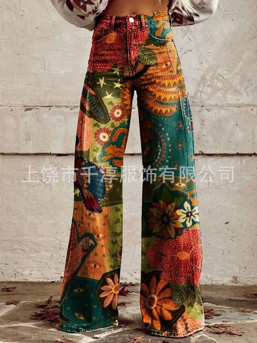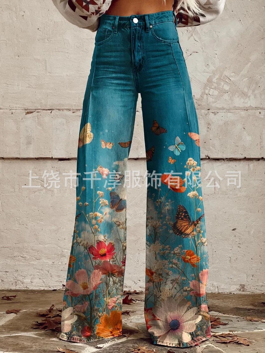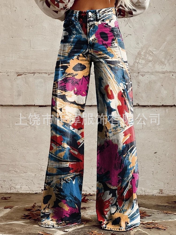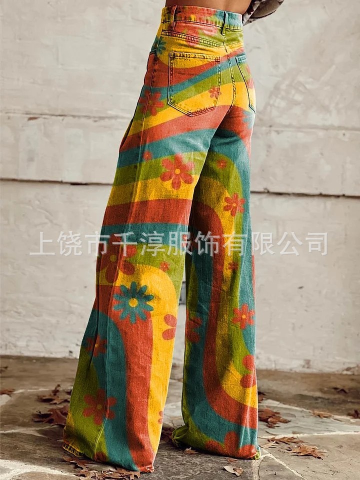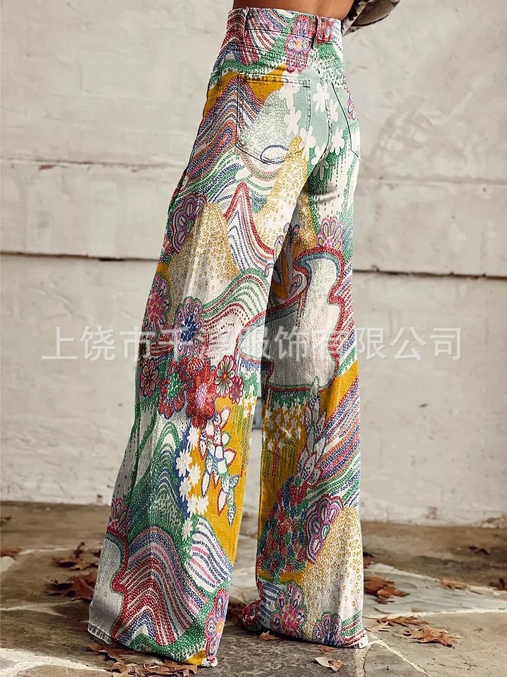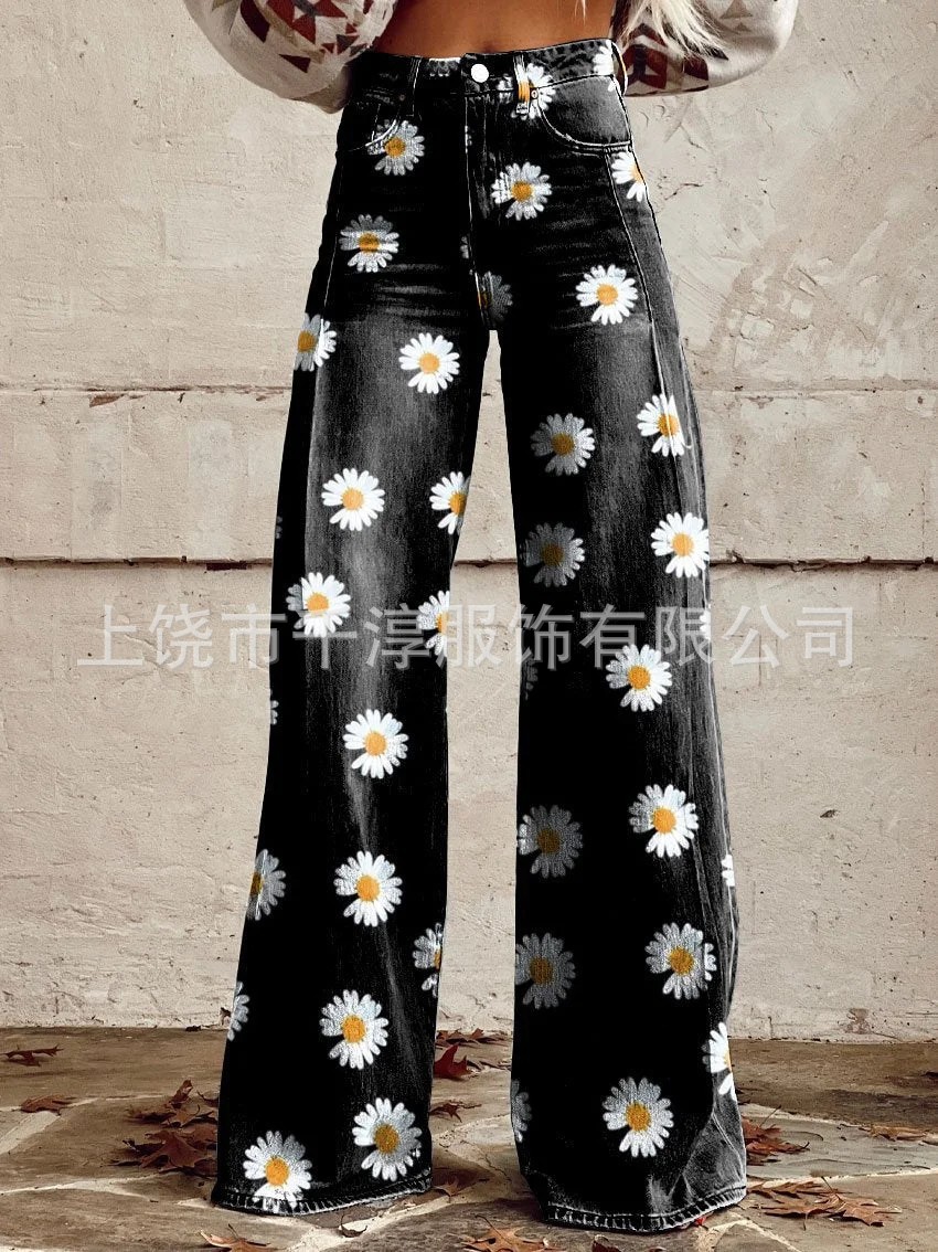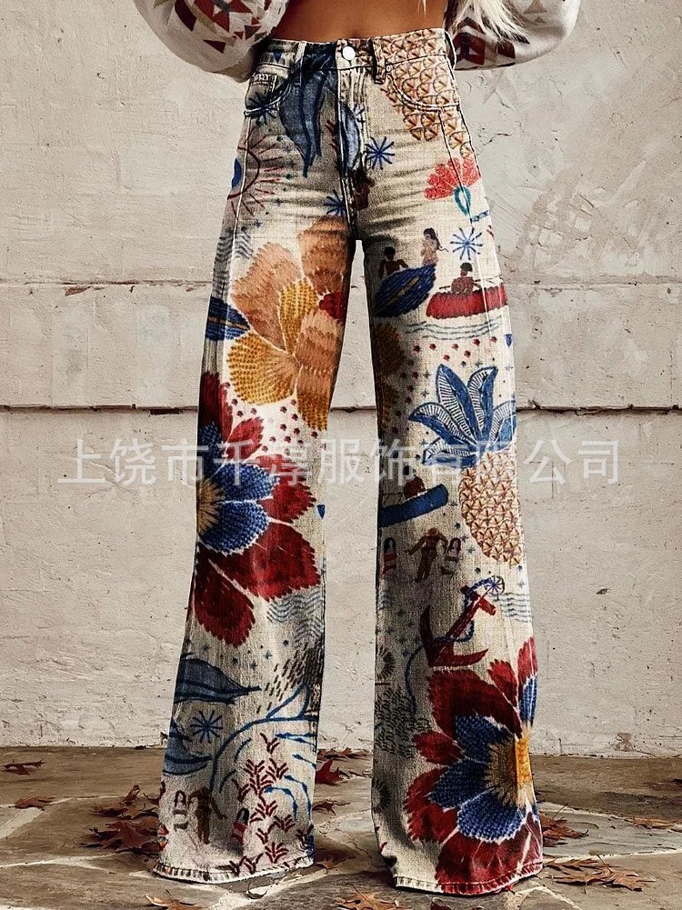 독립 스테이션 Xiyin 유럽과 미국 대외 무역 크로스 보더 여성 캐주얼 바지 프린트 모조 청바지 와이드 레그 3D 트렌디 패션 여성