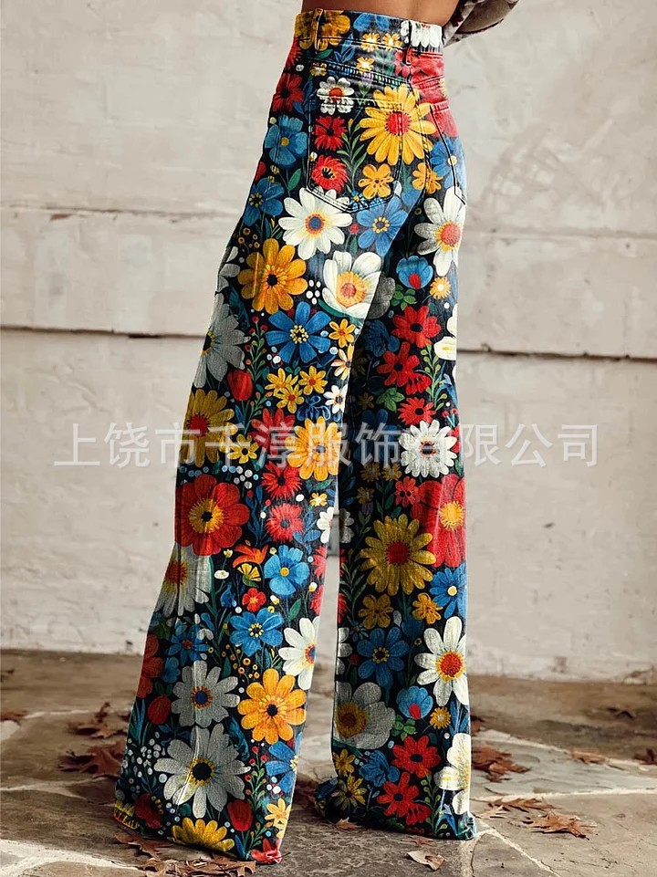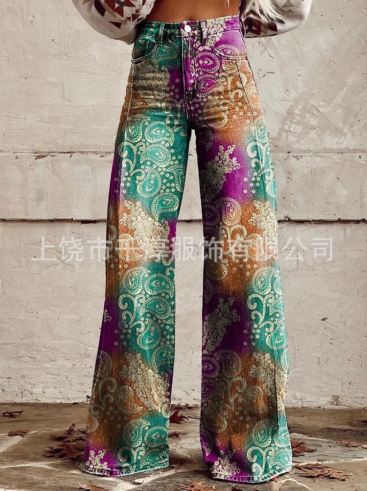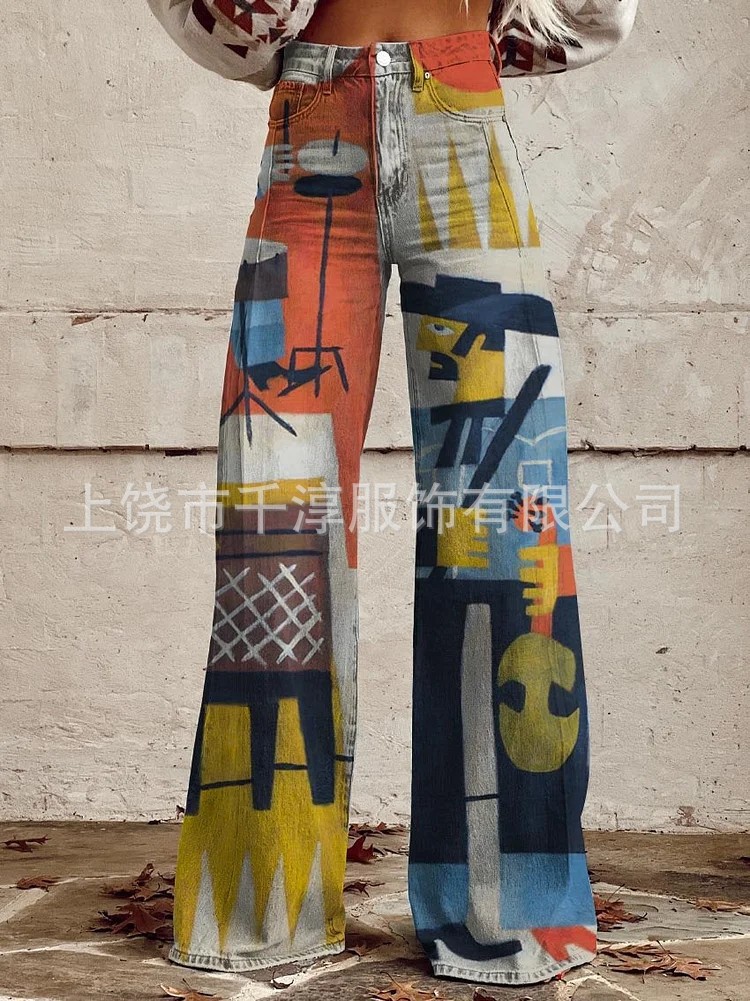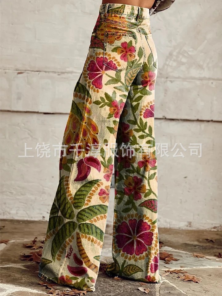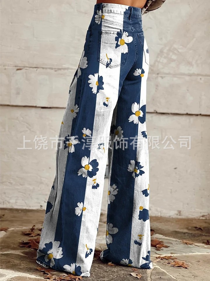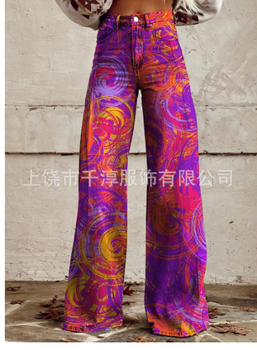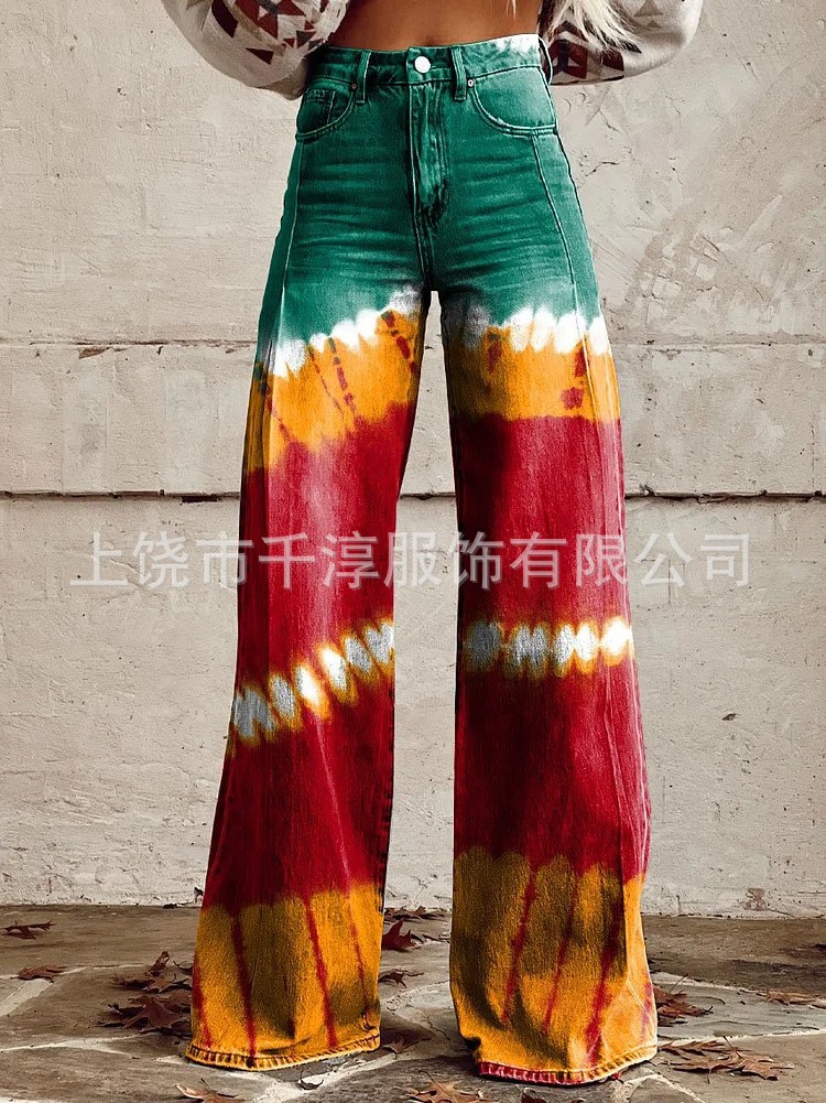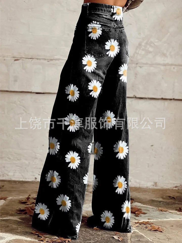 독립 스테이션 Xiyin 유럽과 미국 대외 무역 크로스 보더 여성 캐주얼 바지 프린트 모조 청바지 와이드 레그 3D 트렌디 패션 여성
