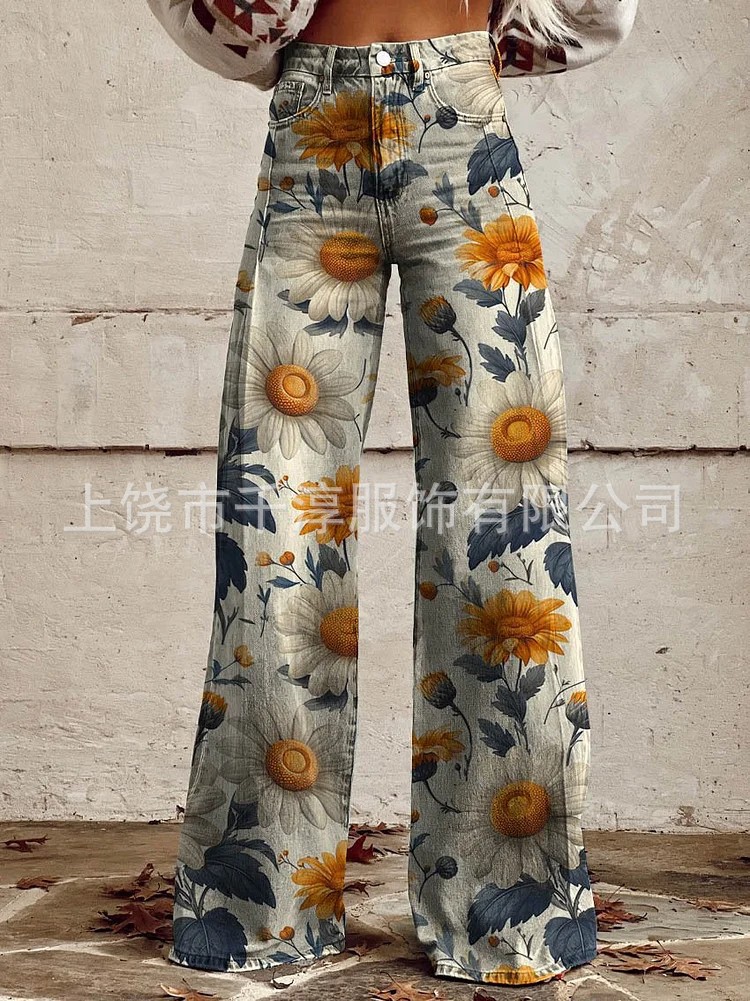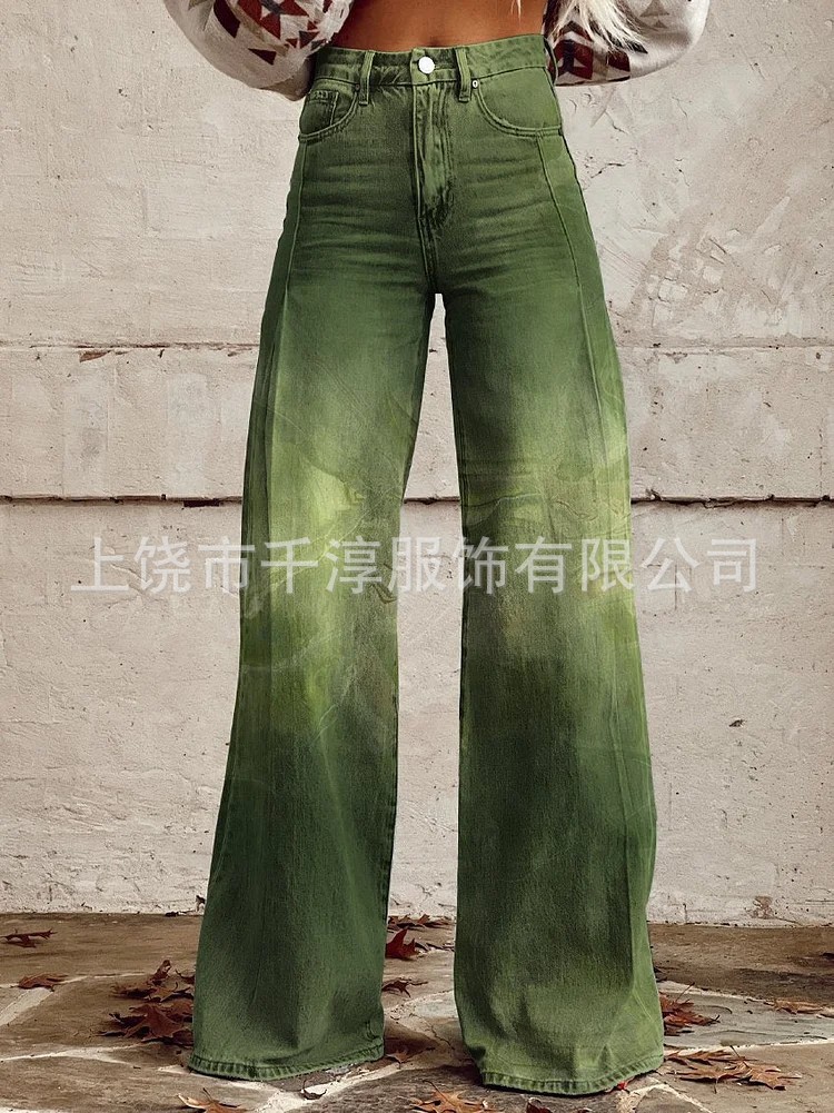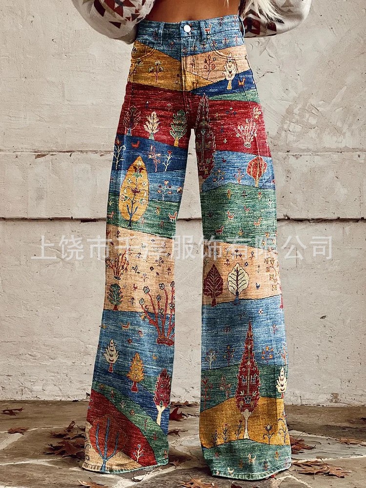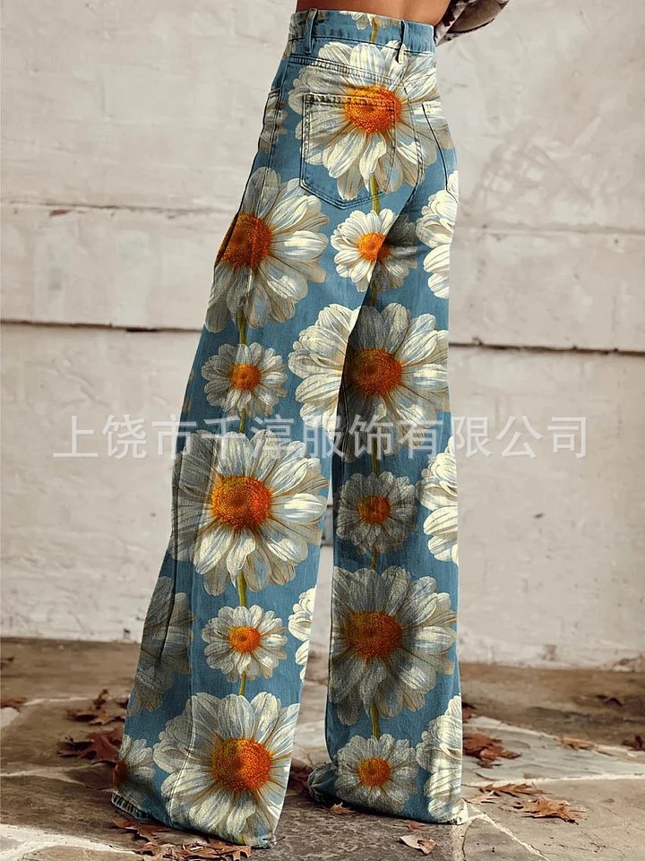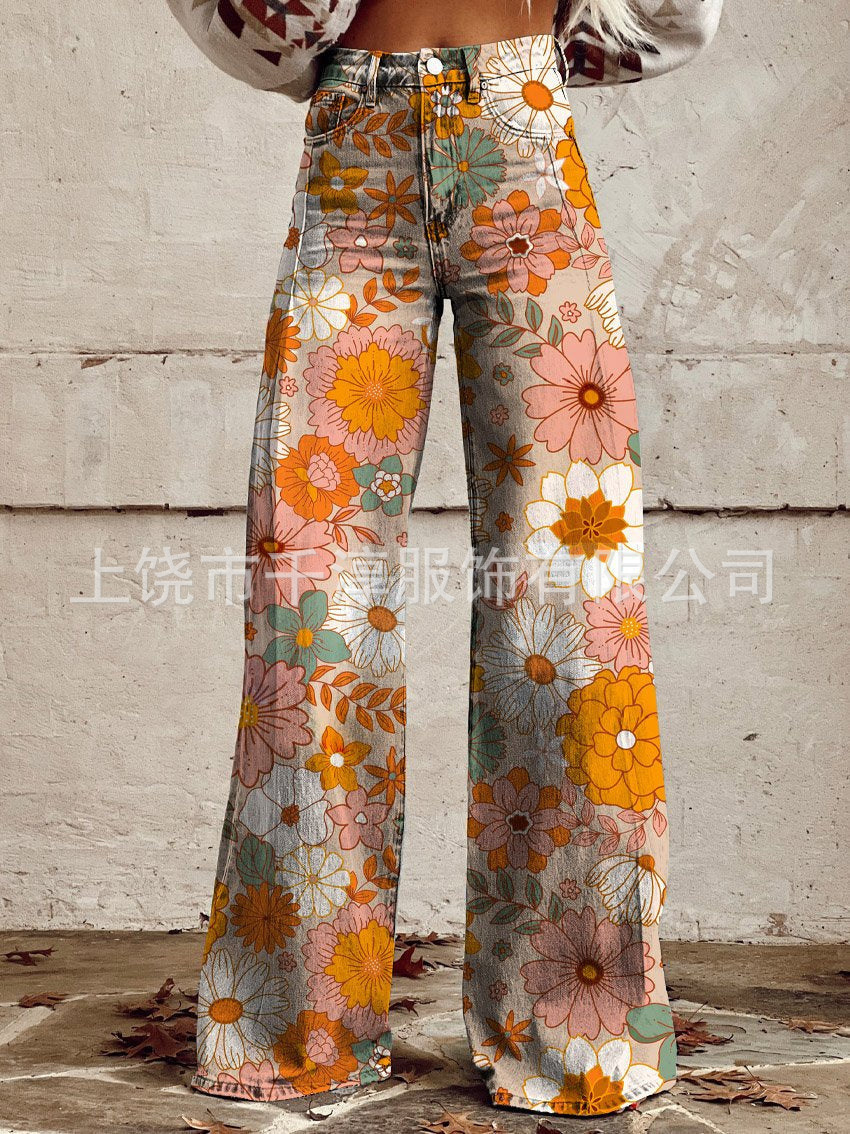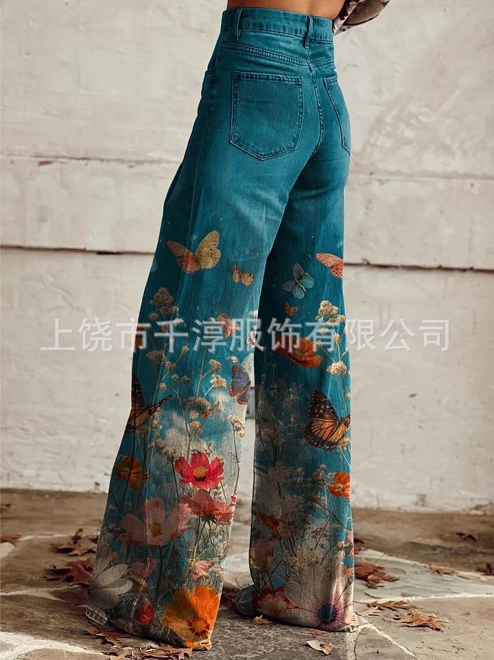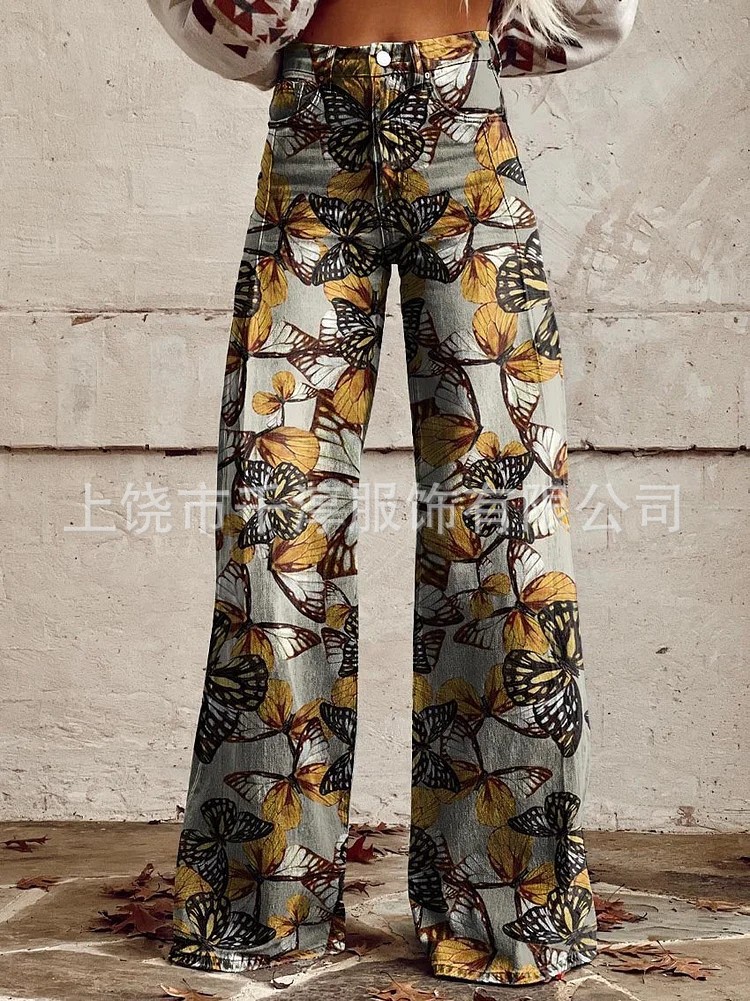 독립 스테이션 Xiyin 유럽과 미국 대외 무역 크로스 보더 여성 캐주얼 바지 프린트 모조 청바지 와이드 레그 3D 트렌디 패션 여성