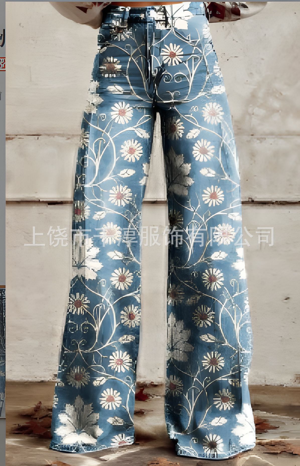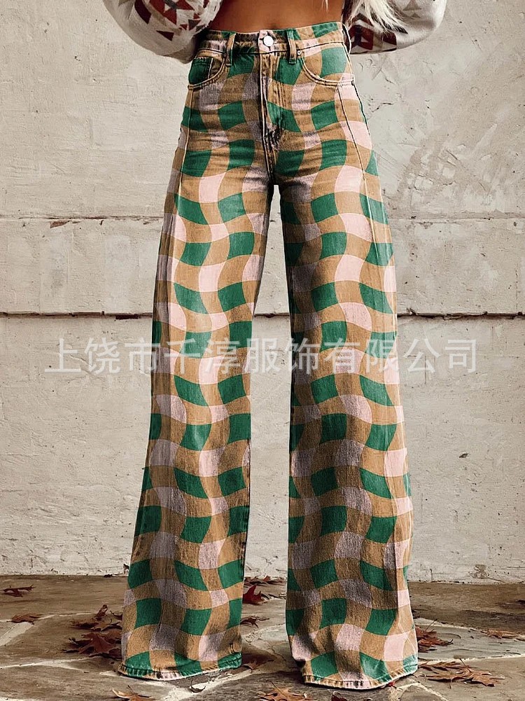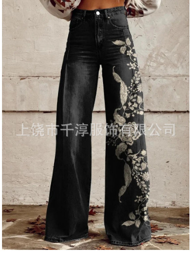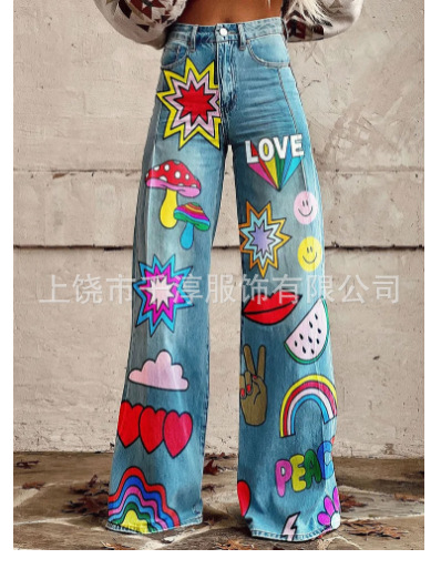 독립 스테이션 Xiyin 유럽과 미국 대외 무역 크로스 보더 여성 캐주얼 바지 프린트 모조 청바지 와이드 레그 3D 트렌디 패션 여성스토어 가기
