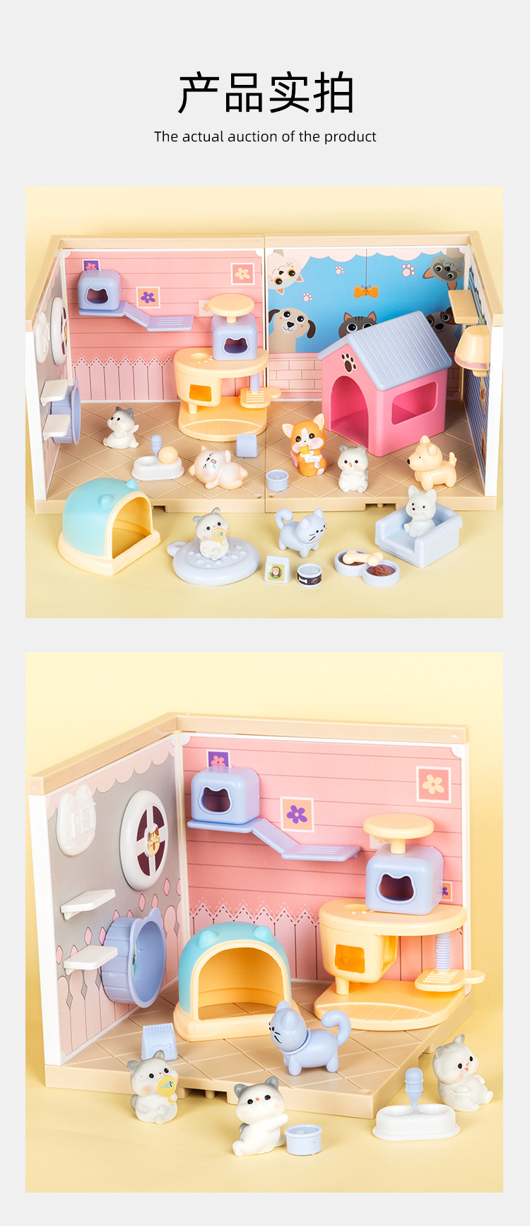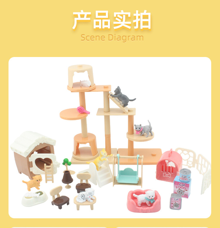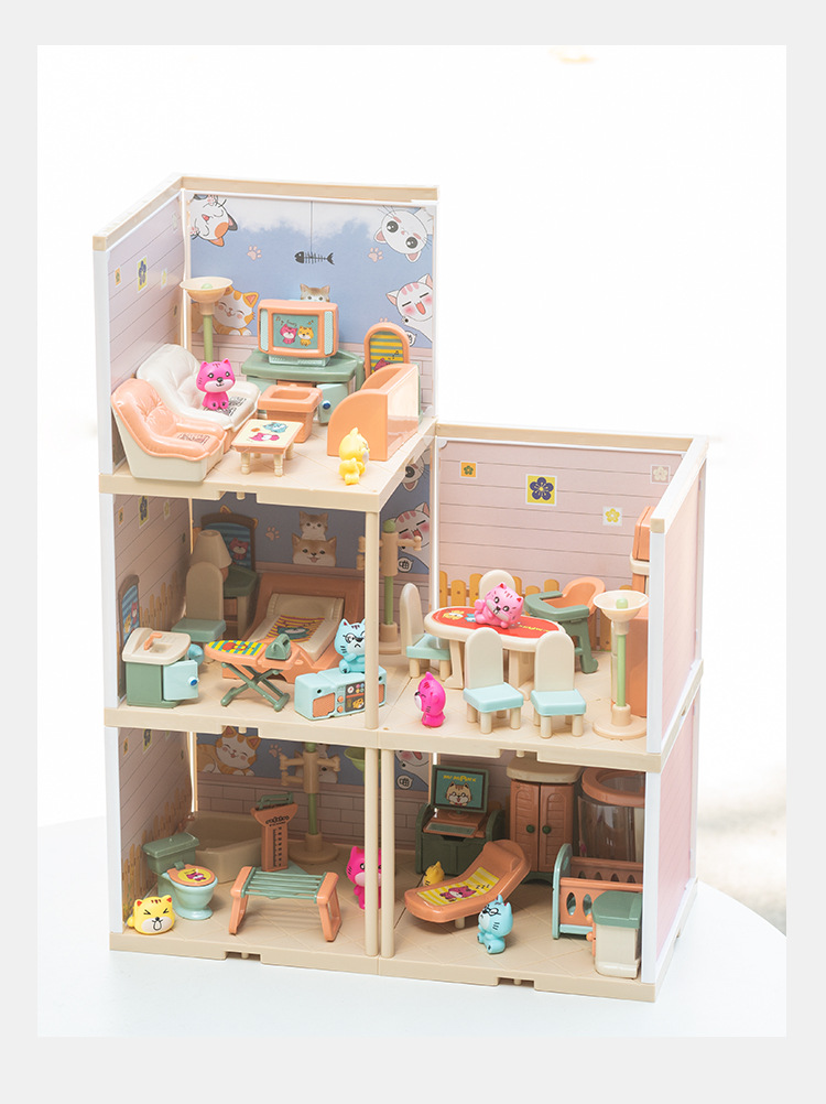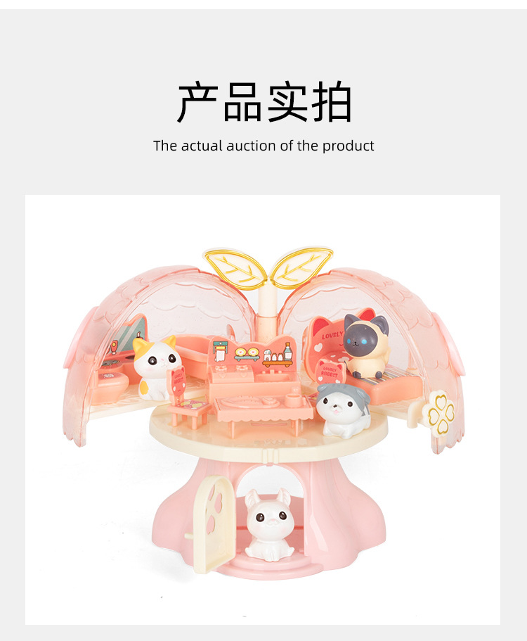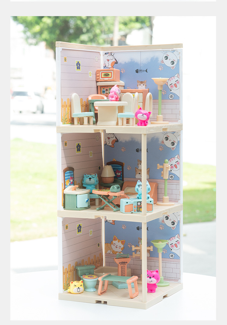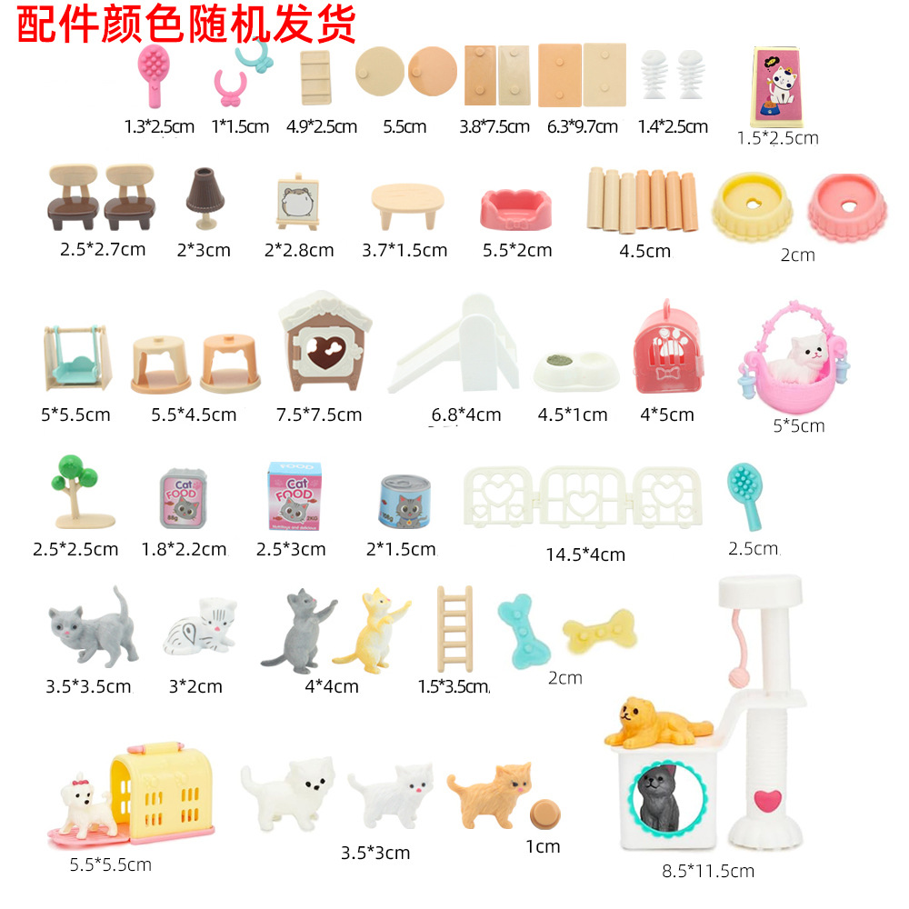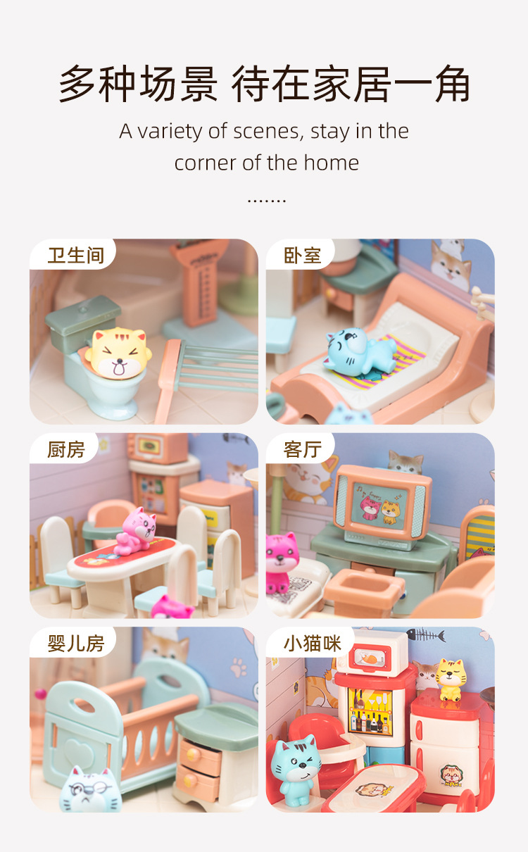 Longze 어린이 놀이 집 미니 가구 고양이 주방 장면 캐빈 하우스 애완 동물 소녀 장난감