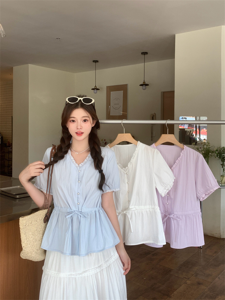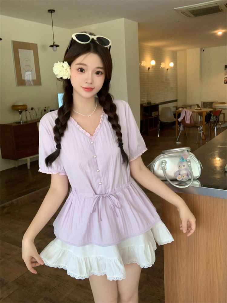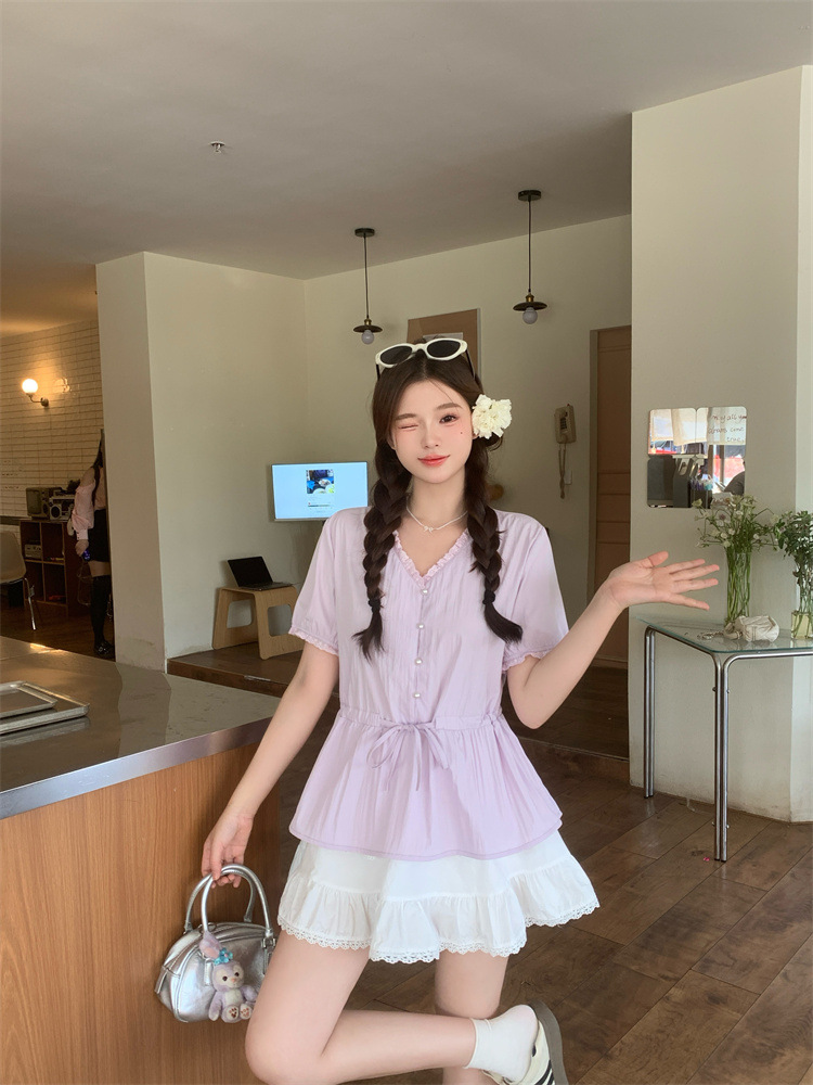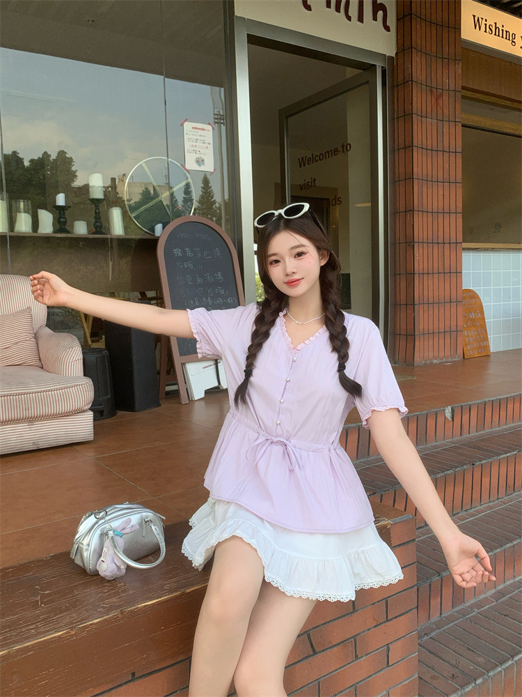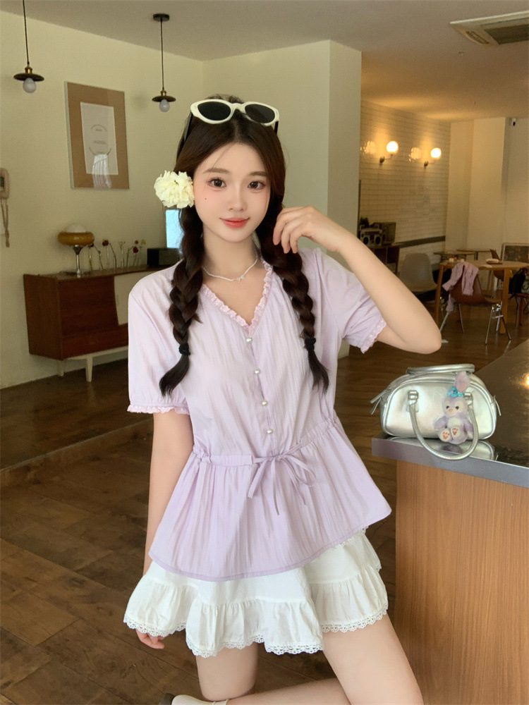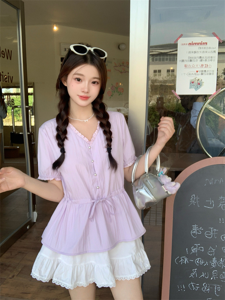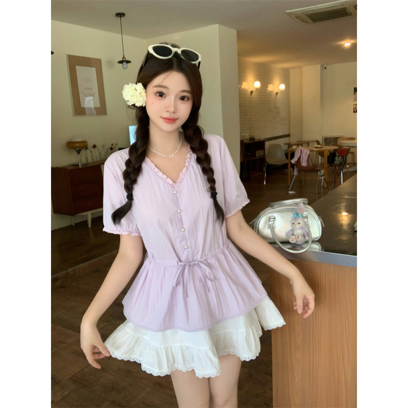 실제 샷 및 가격 라이트 퍼플 브이넥 오른쪽 어깨 셔츠 여성 여름 드로스트링 허리 베이비돌 탑스토어 가기