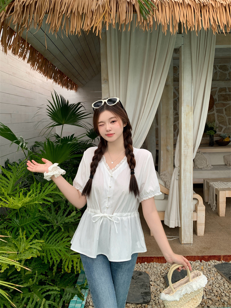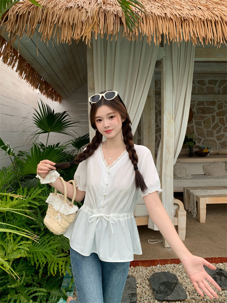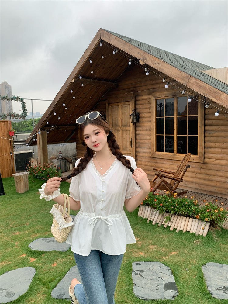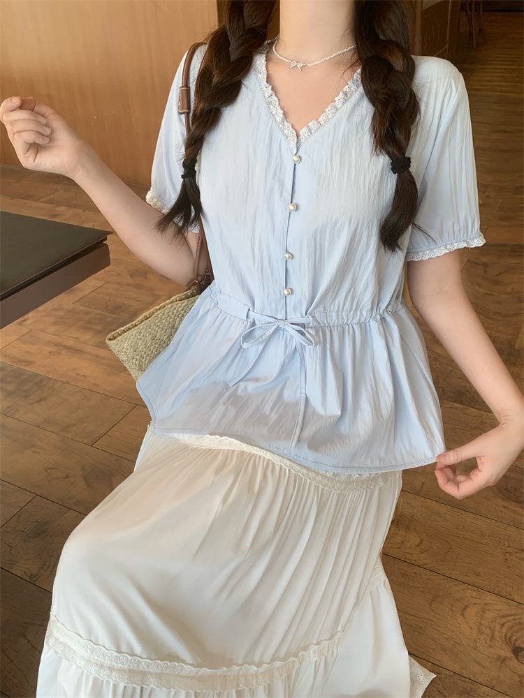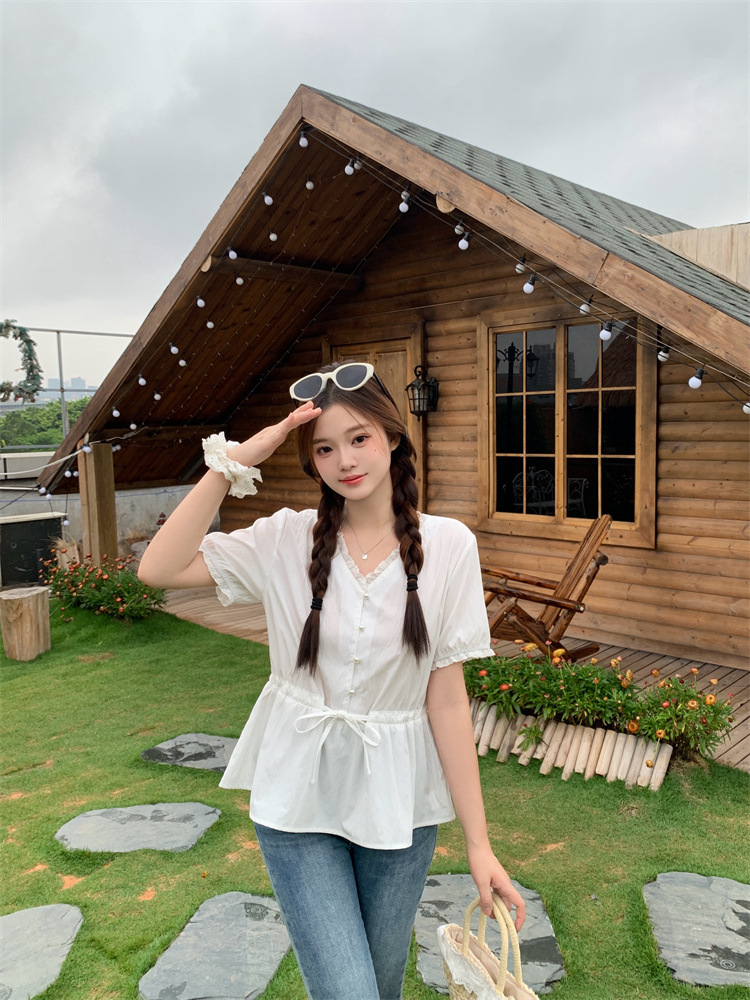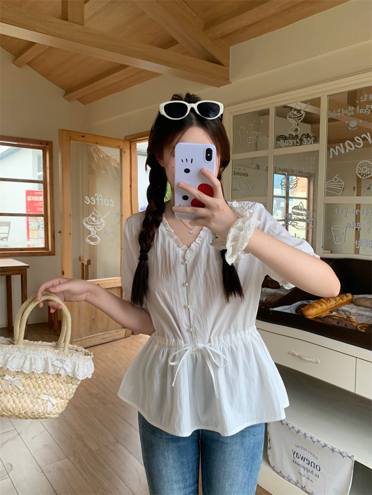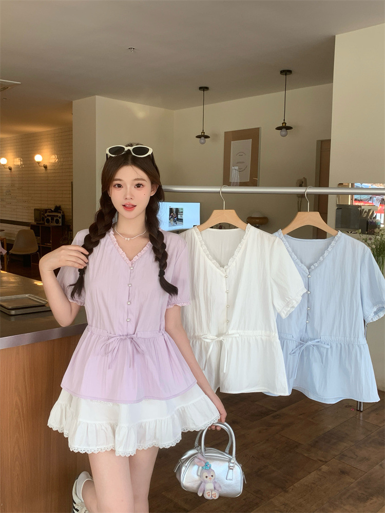 실제 샷 및 가격 라이트 퍼플 브이넥 오른쪽 어깨 셔츠 여성 여름 드로스트링 허리 베이비돌 탑스토어 가기