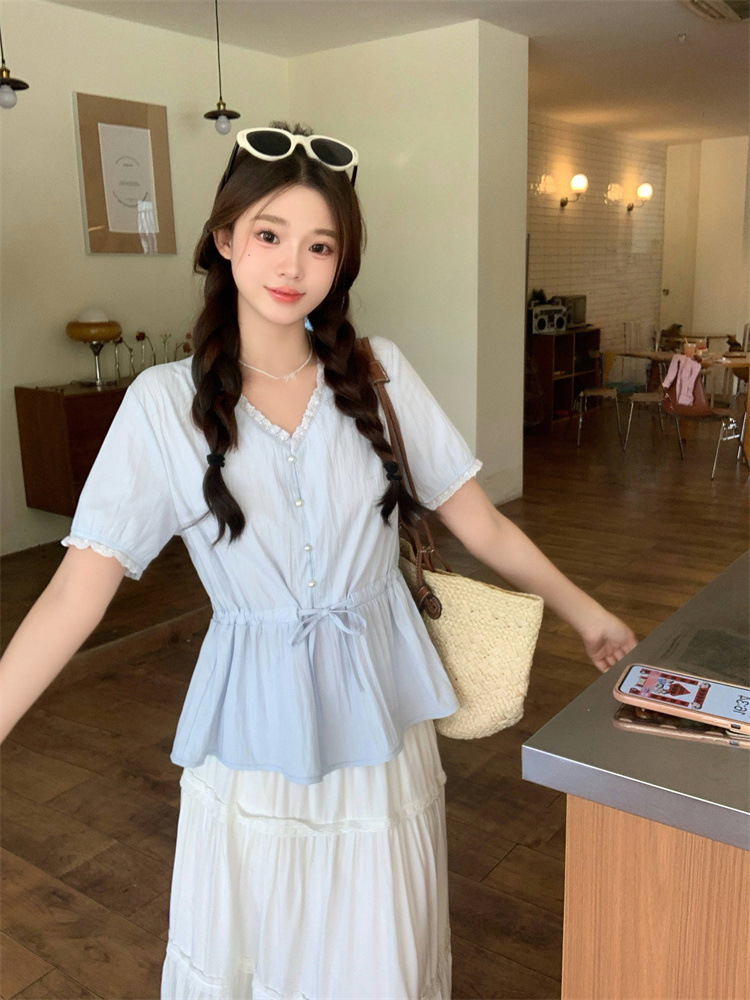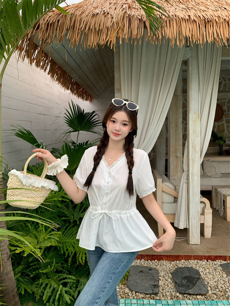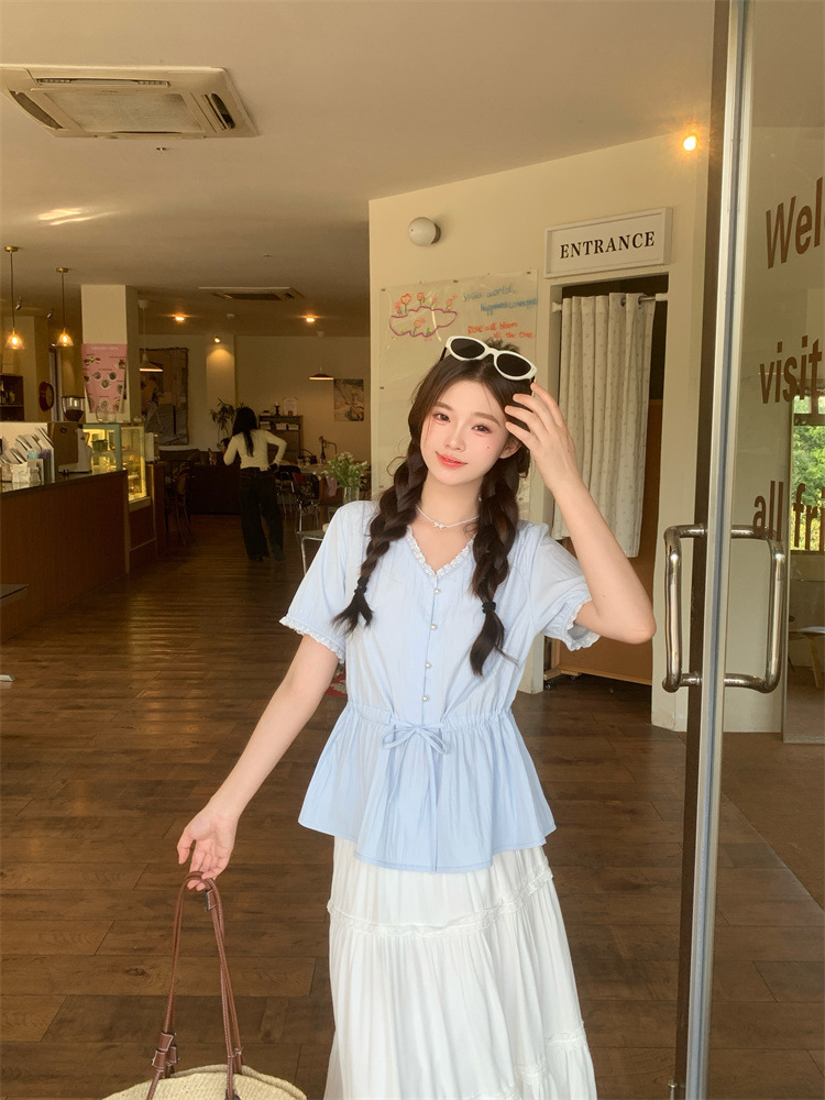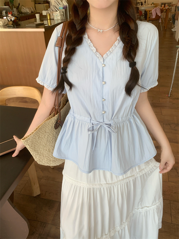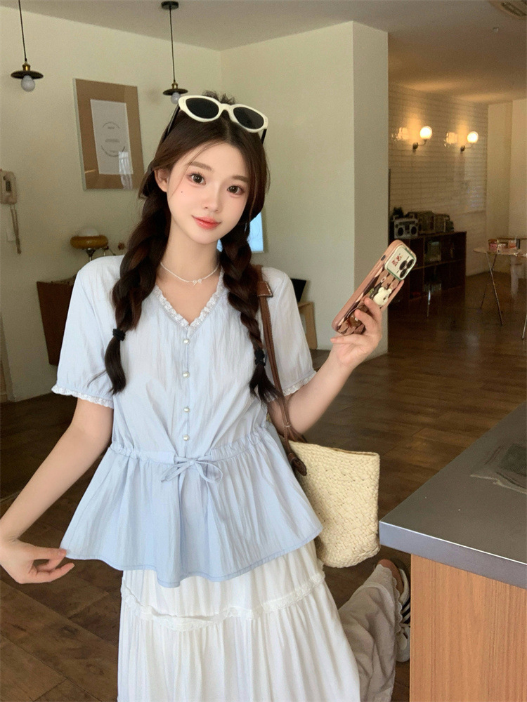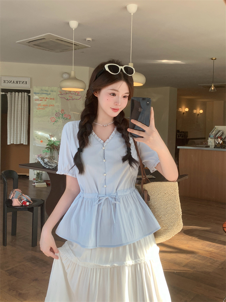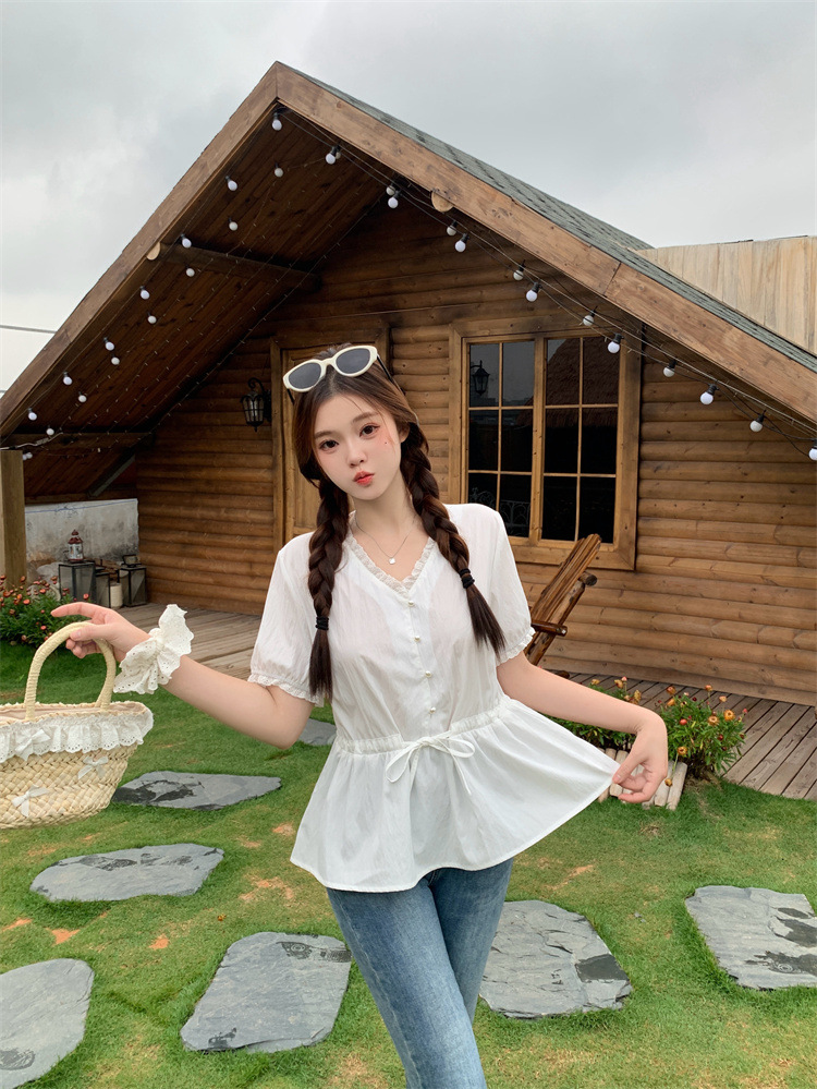 실제 샷 및 가격 라이트 퍼플 브이넥 오른쪽 어깨 셔츠 여성 여름 드로스트링 허리 베이비돌 탑스토어 가기