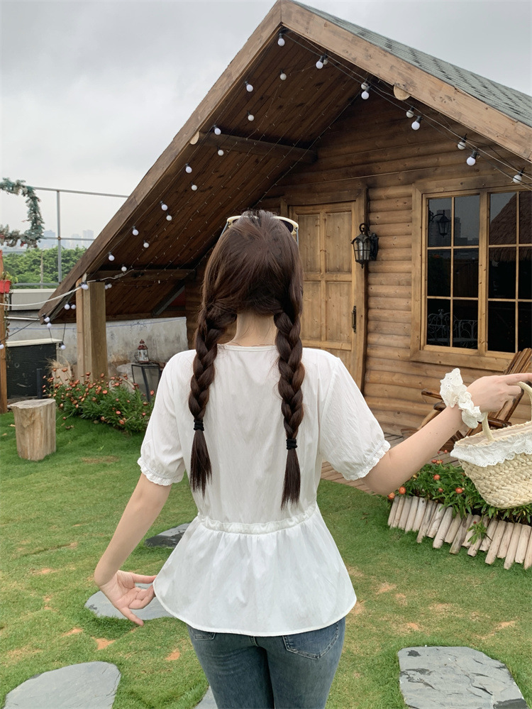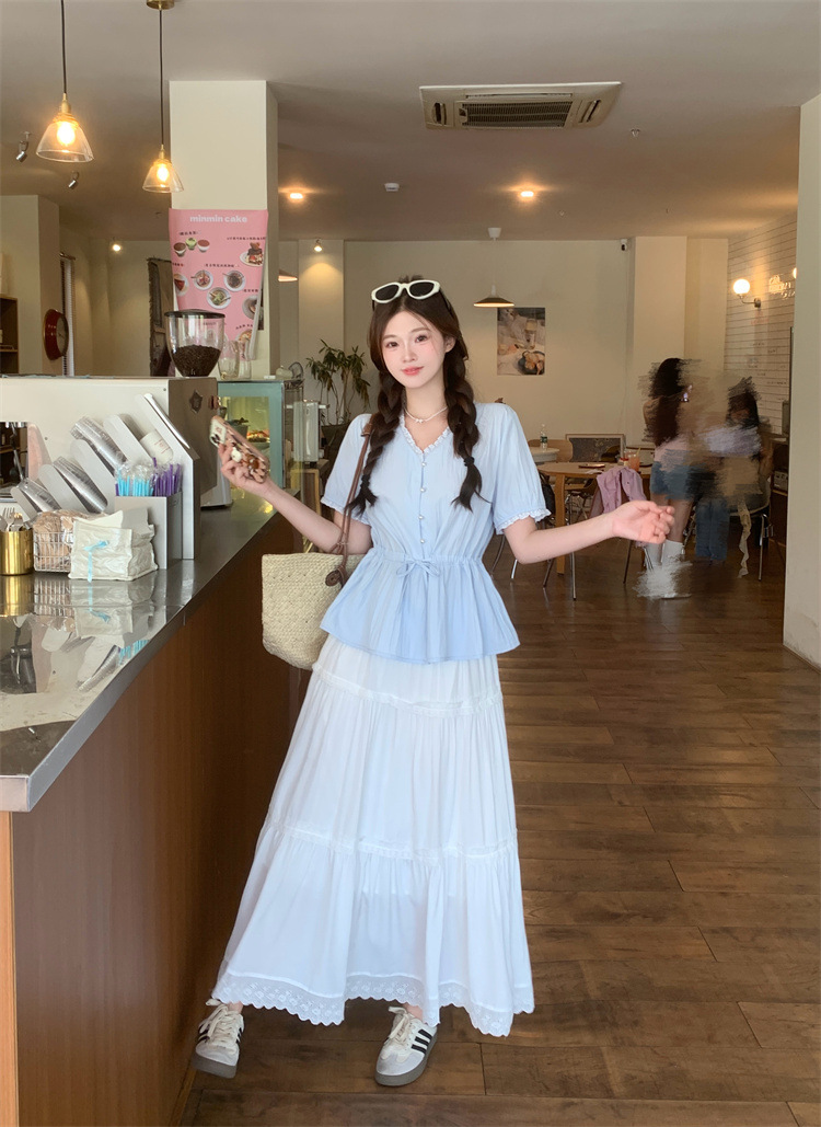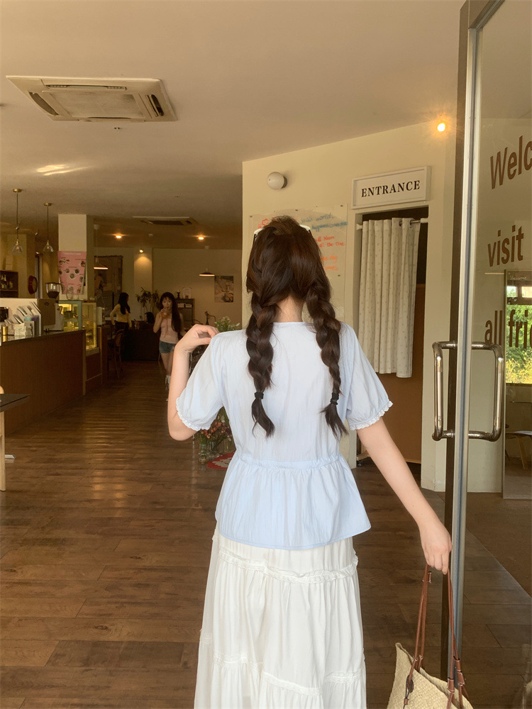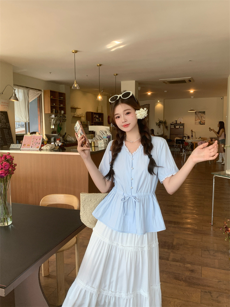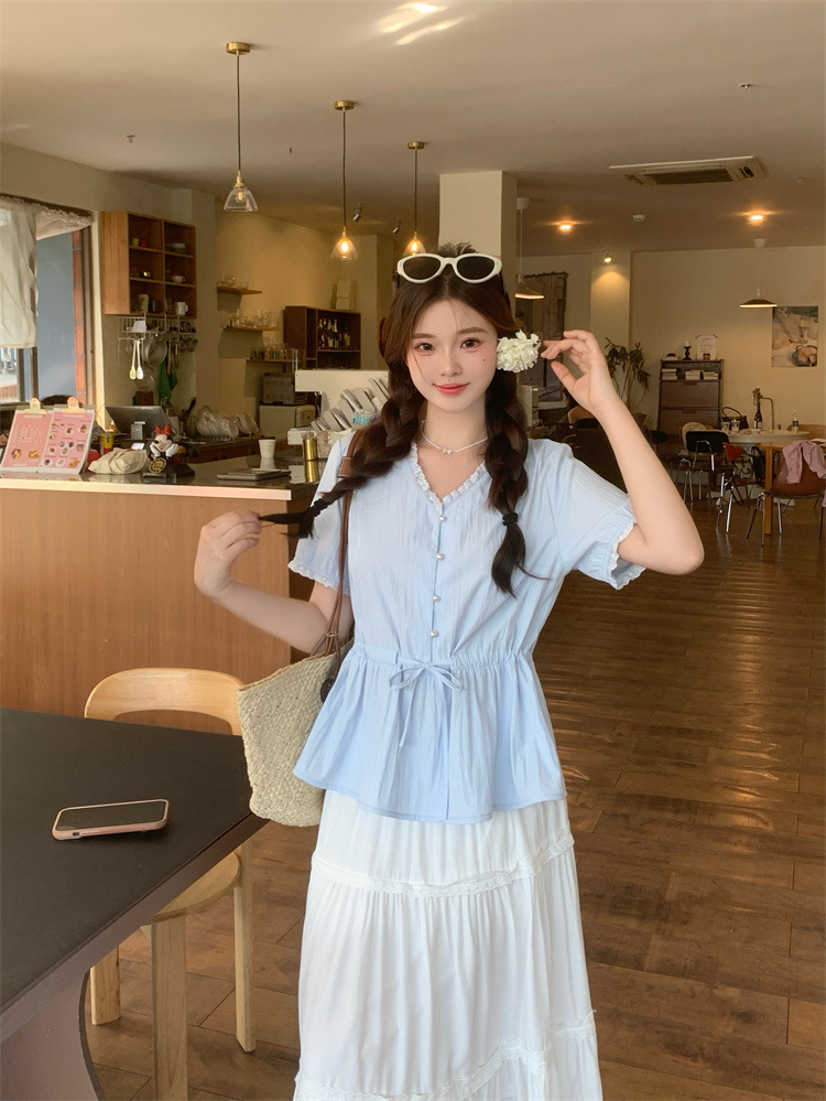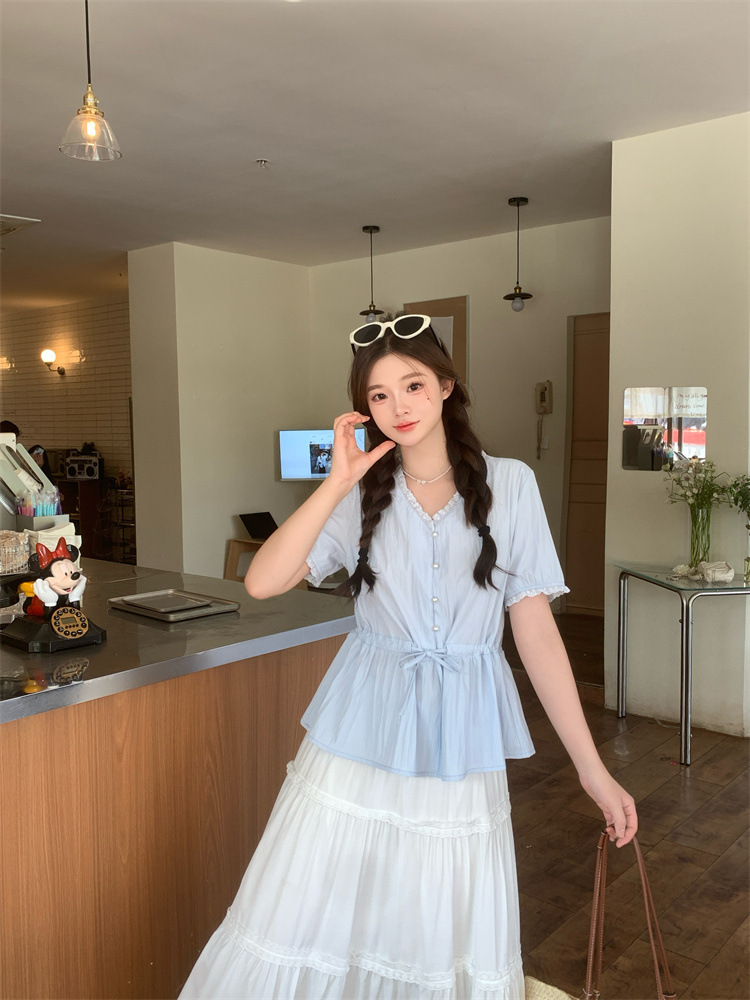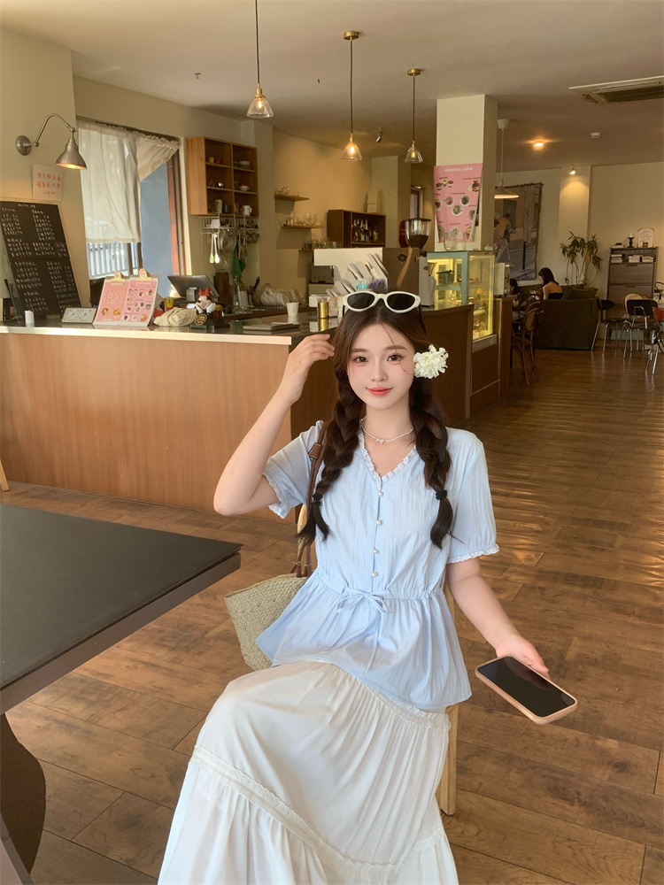 실제 샷 및 가격 라이트 퍼플 브이넥 오른쪽 어깨 셔츠 여성 여름 드로스트링 허리 베이비돌 탑스토어 가기