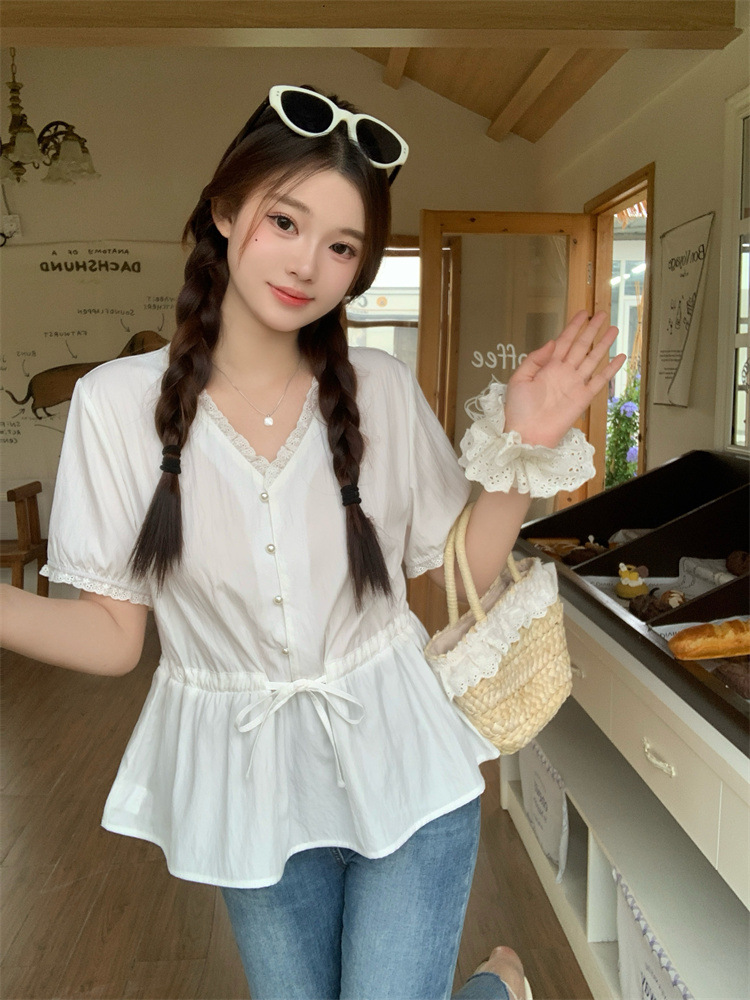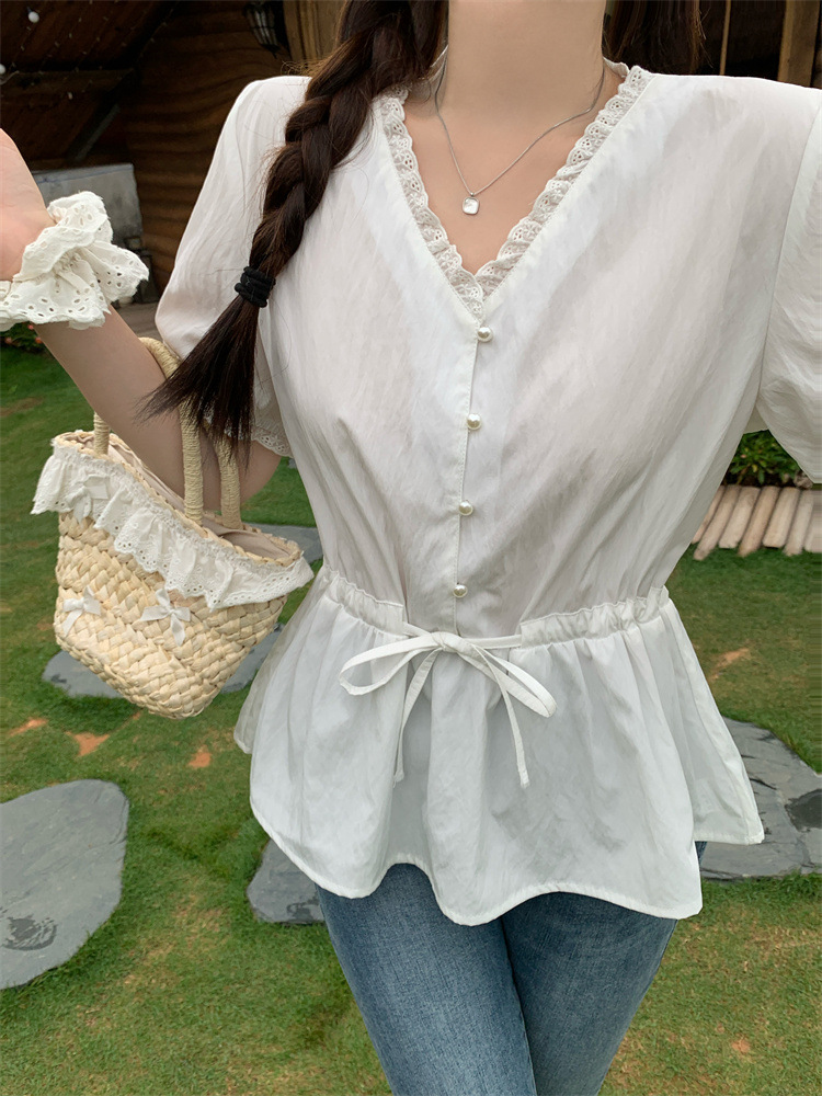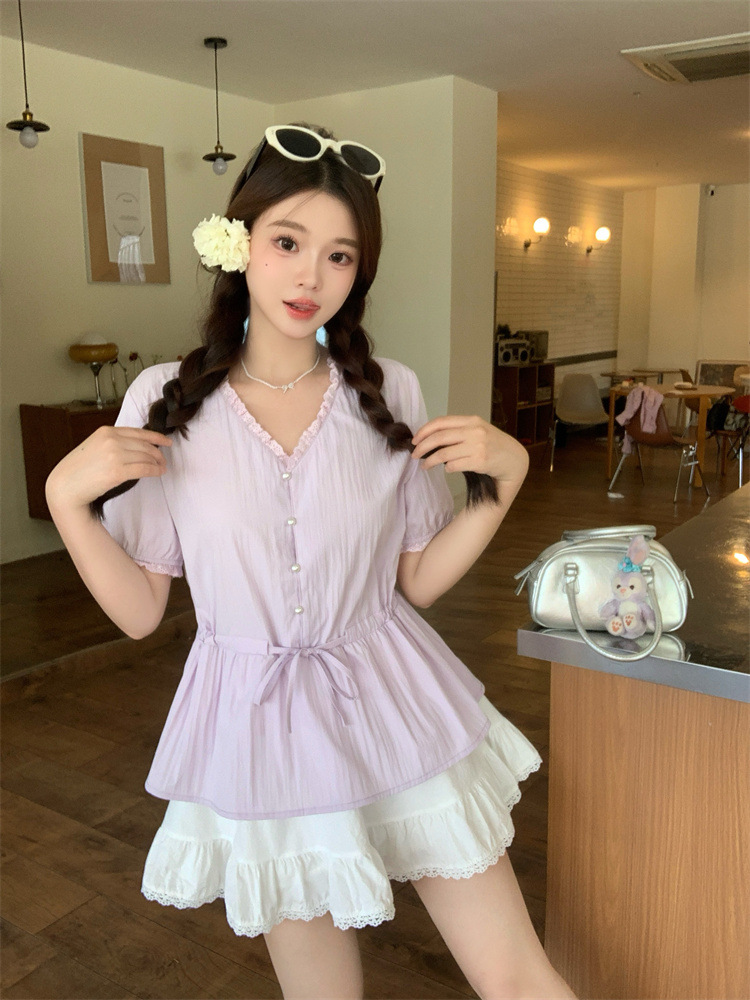 실제 샷 및 가격 라이트 퍼플 브이넥 오른쪽 어깨 셔츠 여성 여름 드로스트링 허리 베이비돌 탑