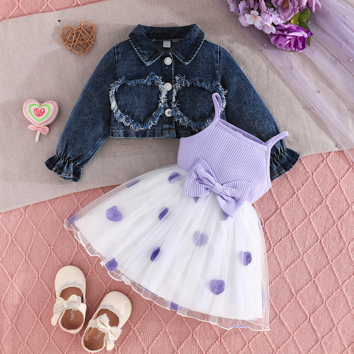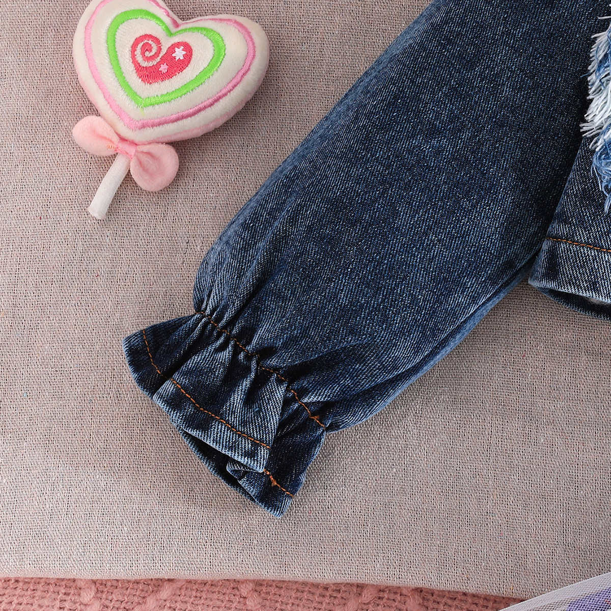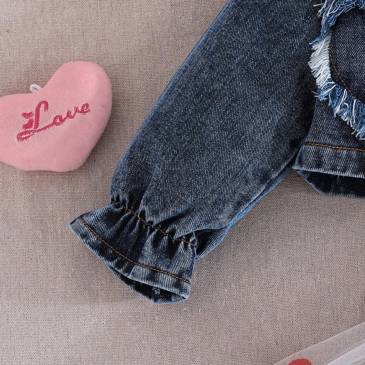 2025 새로운 가을 유럽과 미국 소녀의 패치 워크 러브 데님 재킷 탑 + 서스펜더 보우 러브 스커트