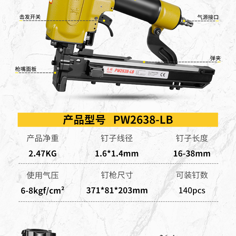 메이테 공압식 코드네일건 PW2638 대형 마네일건 U자형 네일건 가구 나무상자 전문 공압식