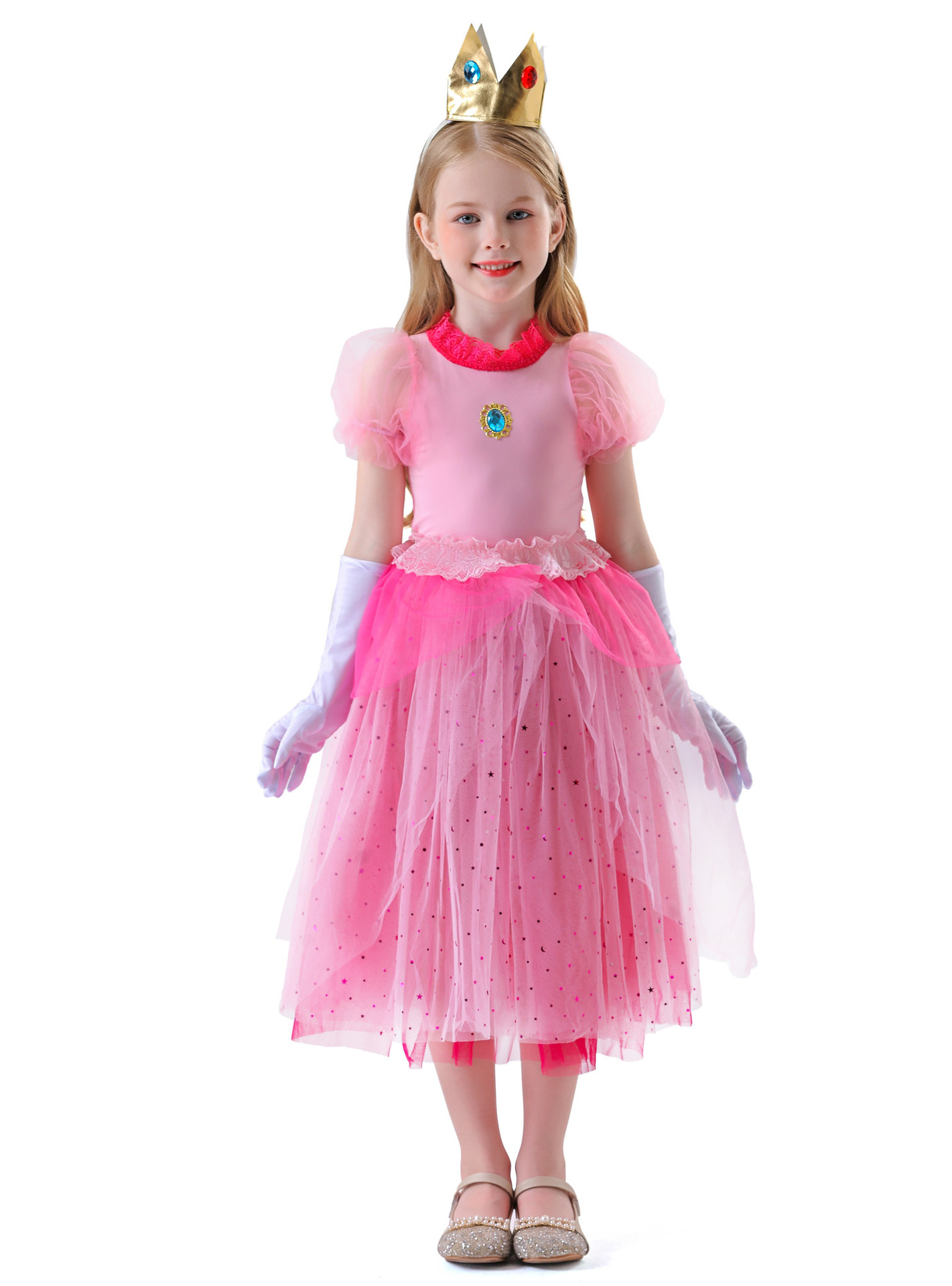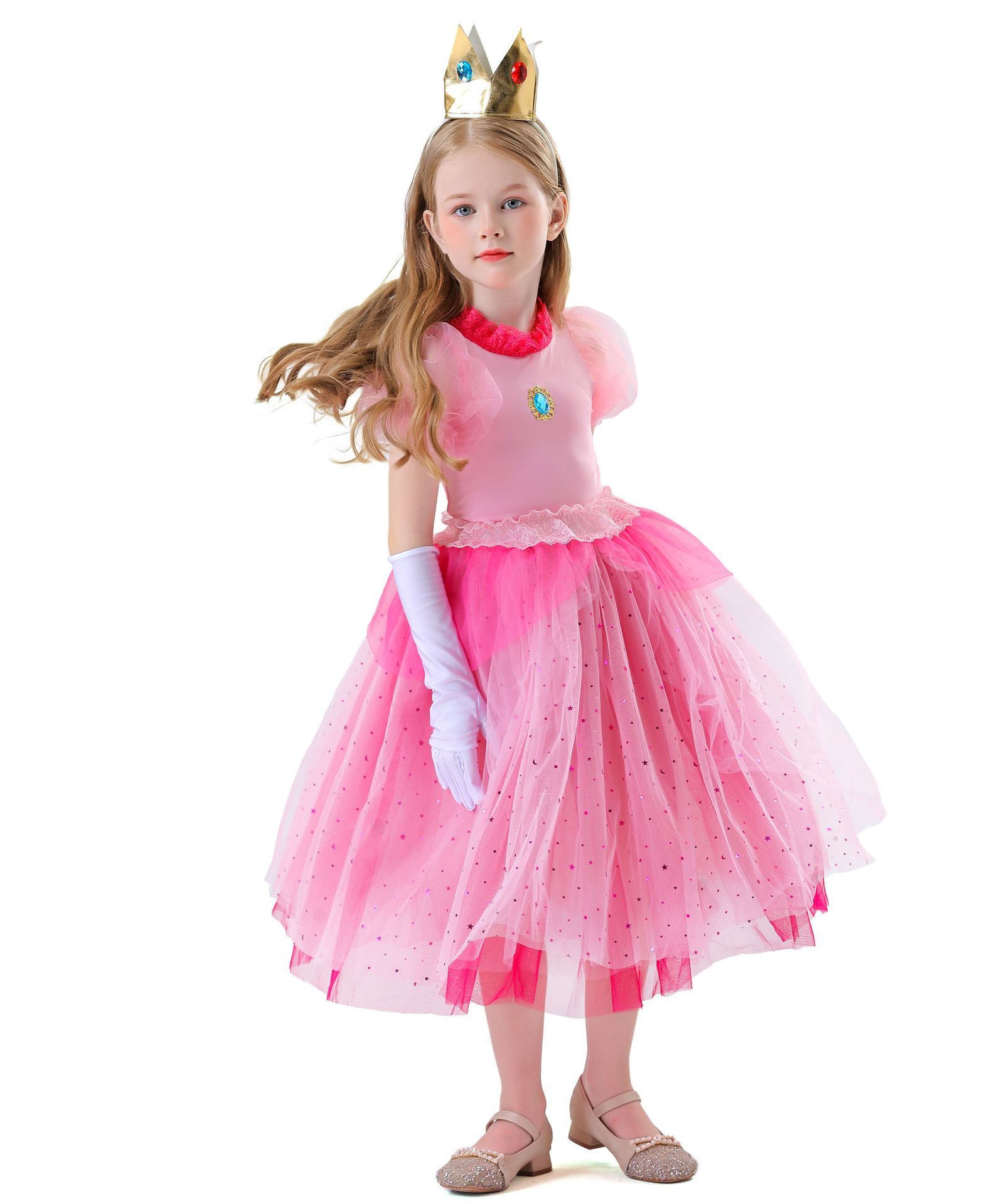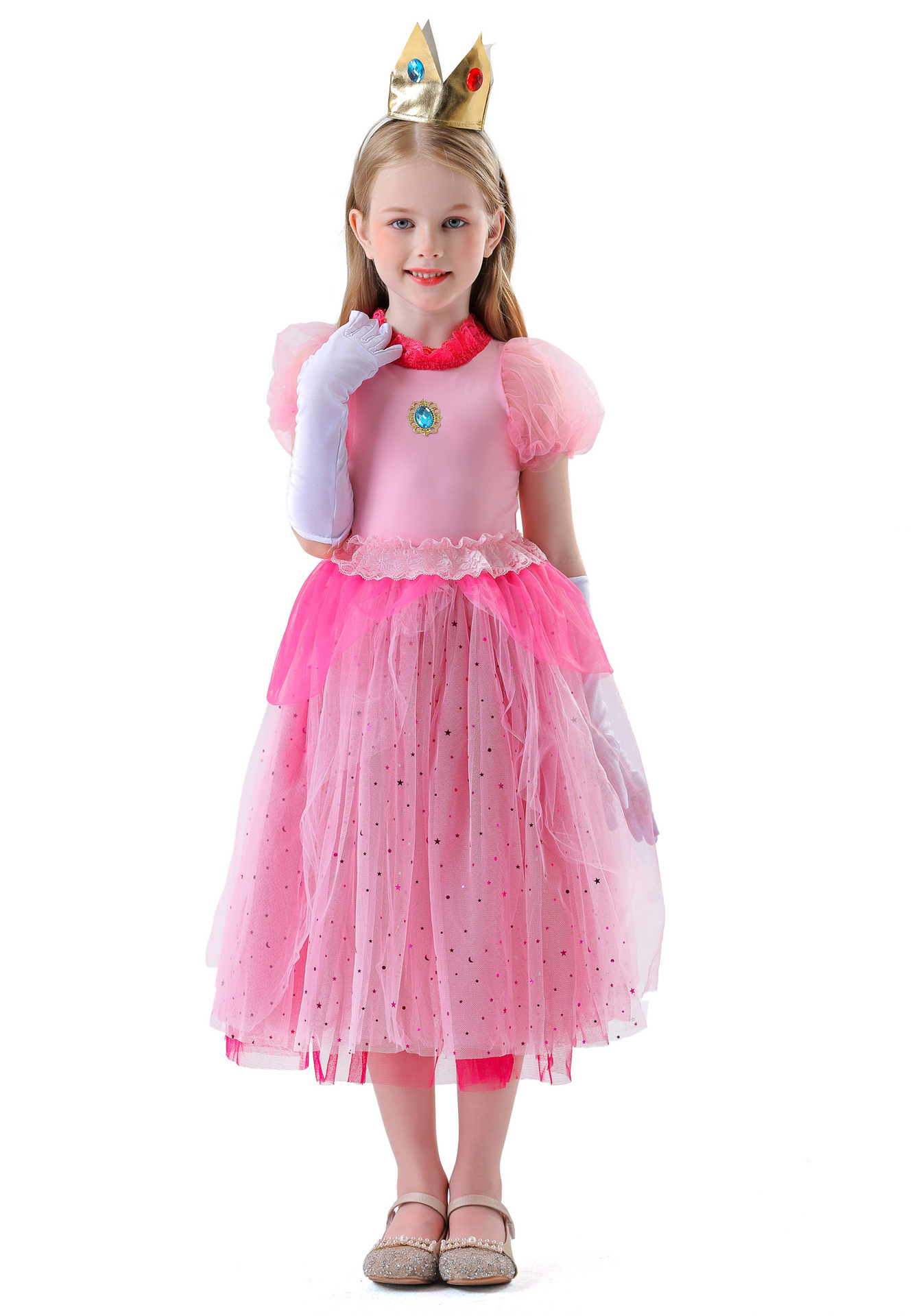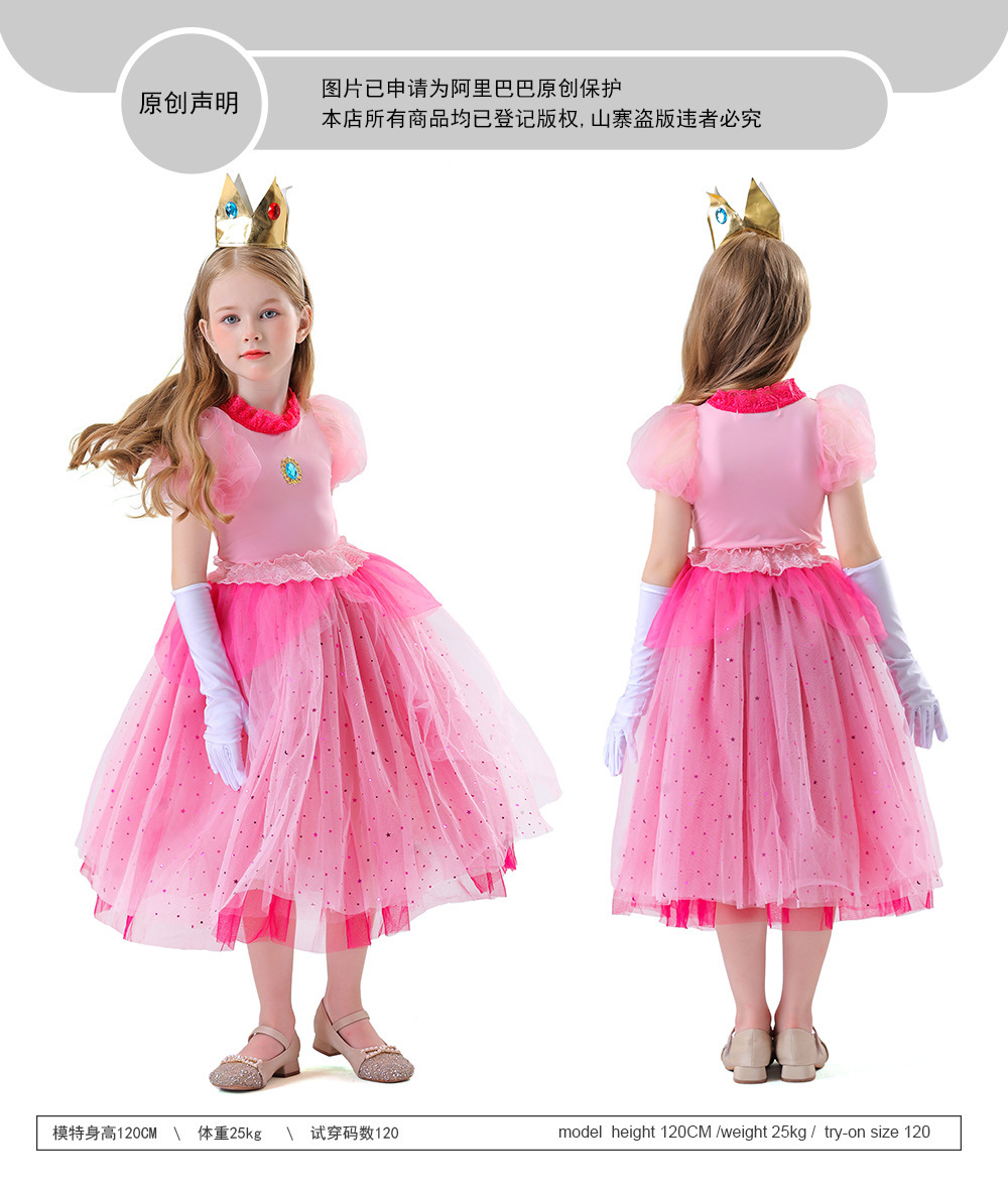 2025 새로운 슈퍼 마리오 어린이 공주 피치 드레스 코스프레 소녀 할로윈 공연 의상