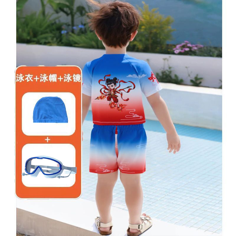 • 5004 Nezha 반팔 빨간색 + 파란색 작은 수영 고글 - 무료 수영 모자