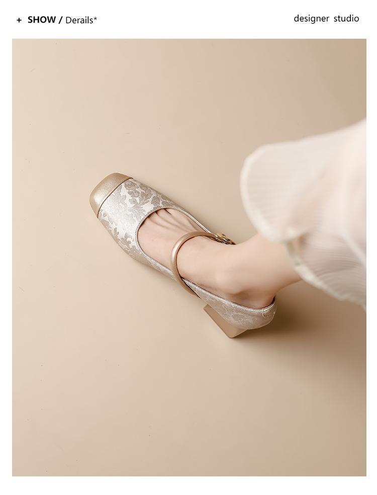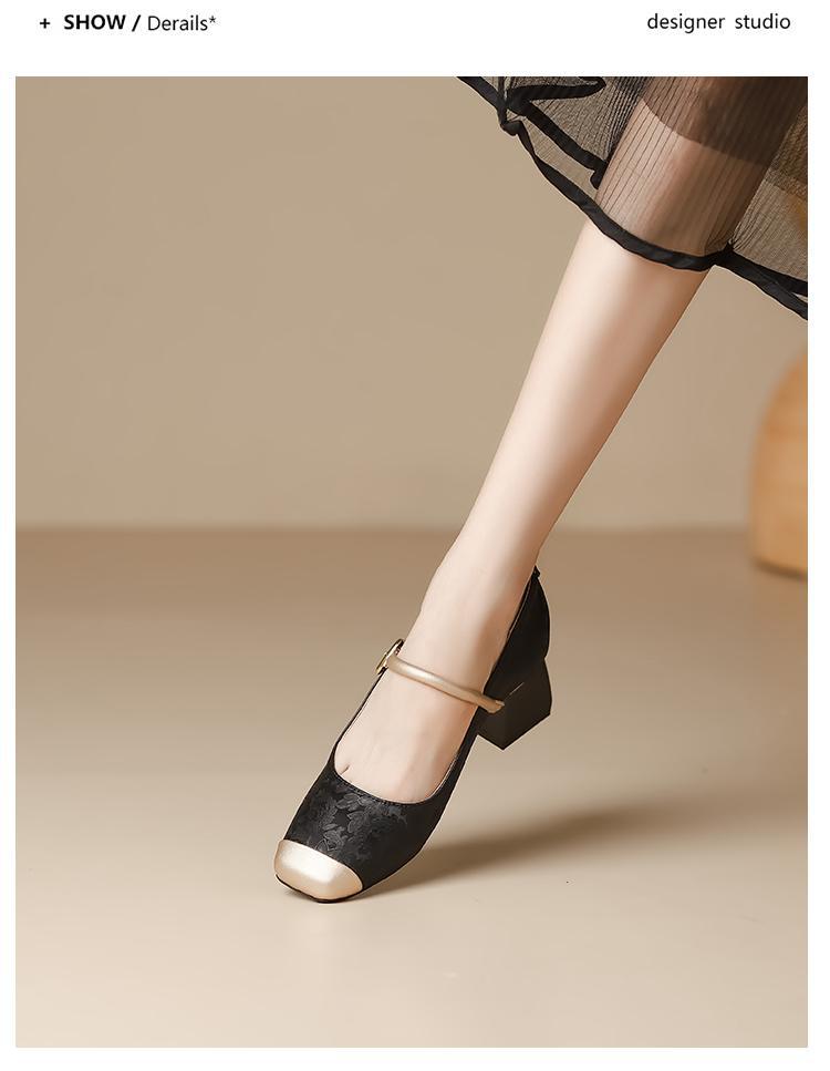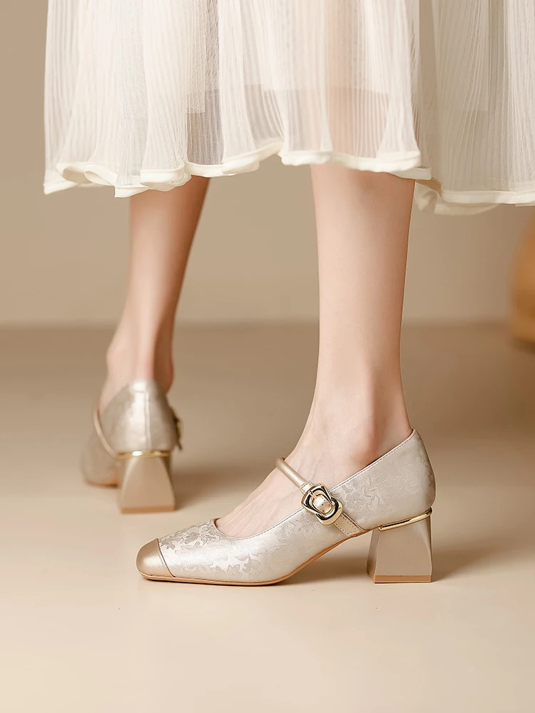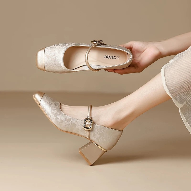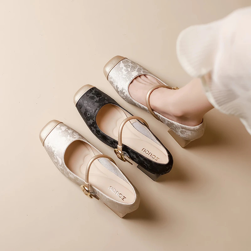 새로운 중국 스타일의 진주 작은 신발 2025 작은 향기 스타일 복고풍 다목적 두꺼운 굽 스퀘어 토우 얕은 입 여성 신발 치파오