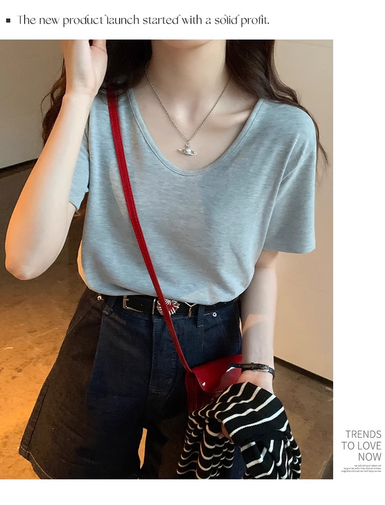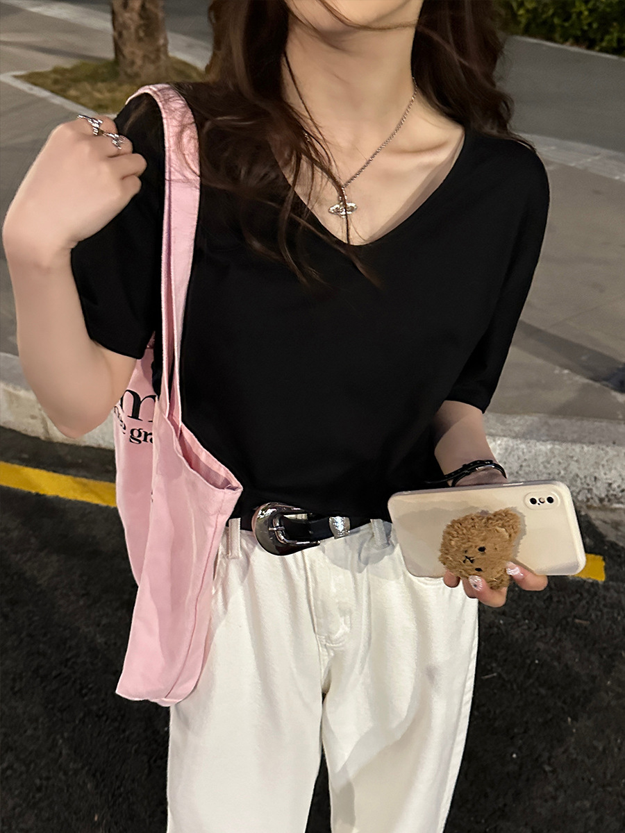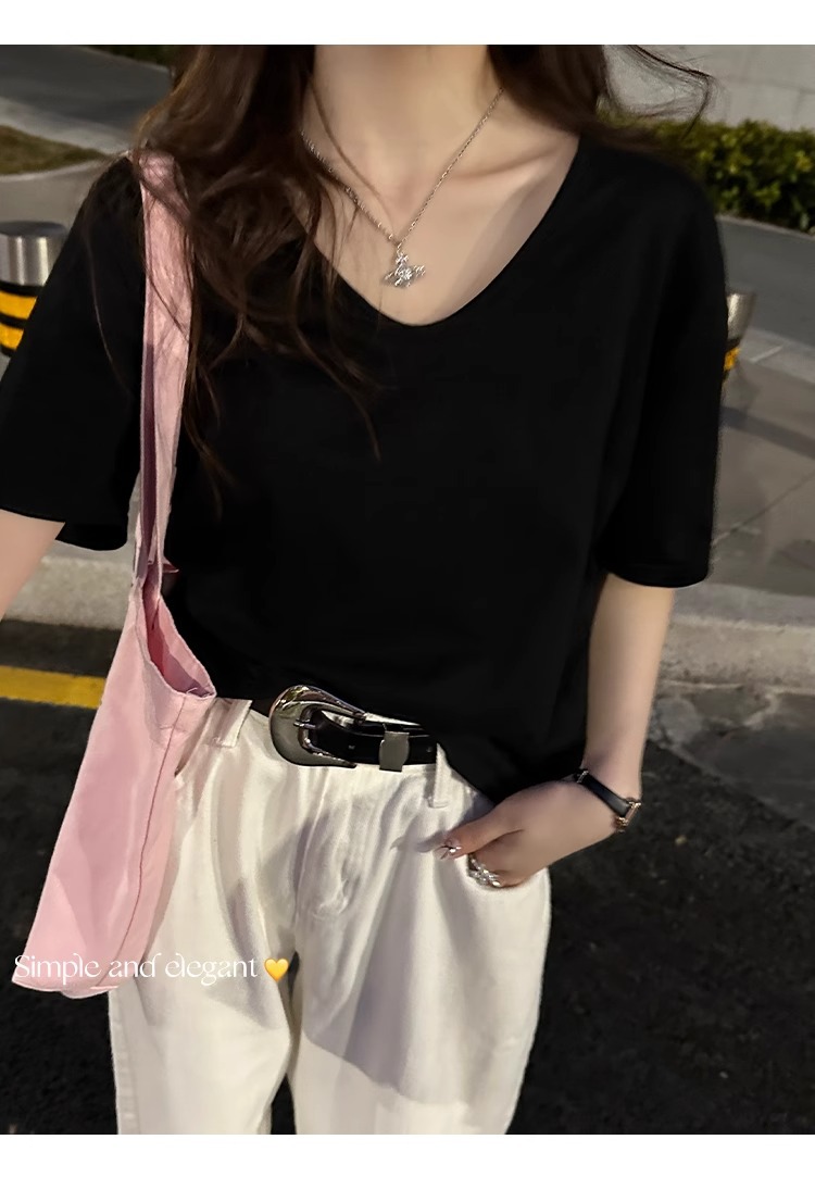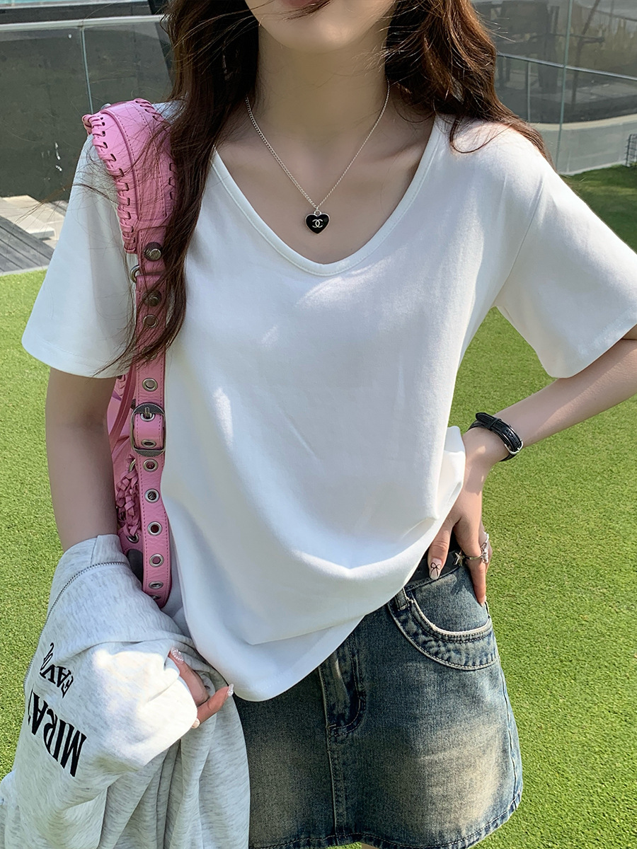 여성용 v 넥 티셔츠 2025 뉴 여름 흰색 반팔 오른쪽 어깨 느슨한 대형 넥 라인 순수 코튼 슬리밍 로우 넥 화이트 탑스토어 가기