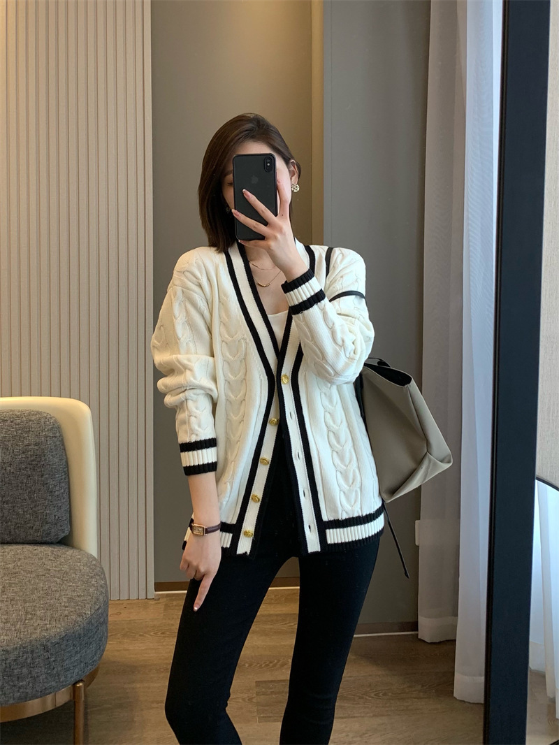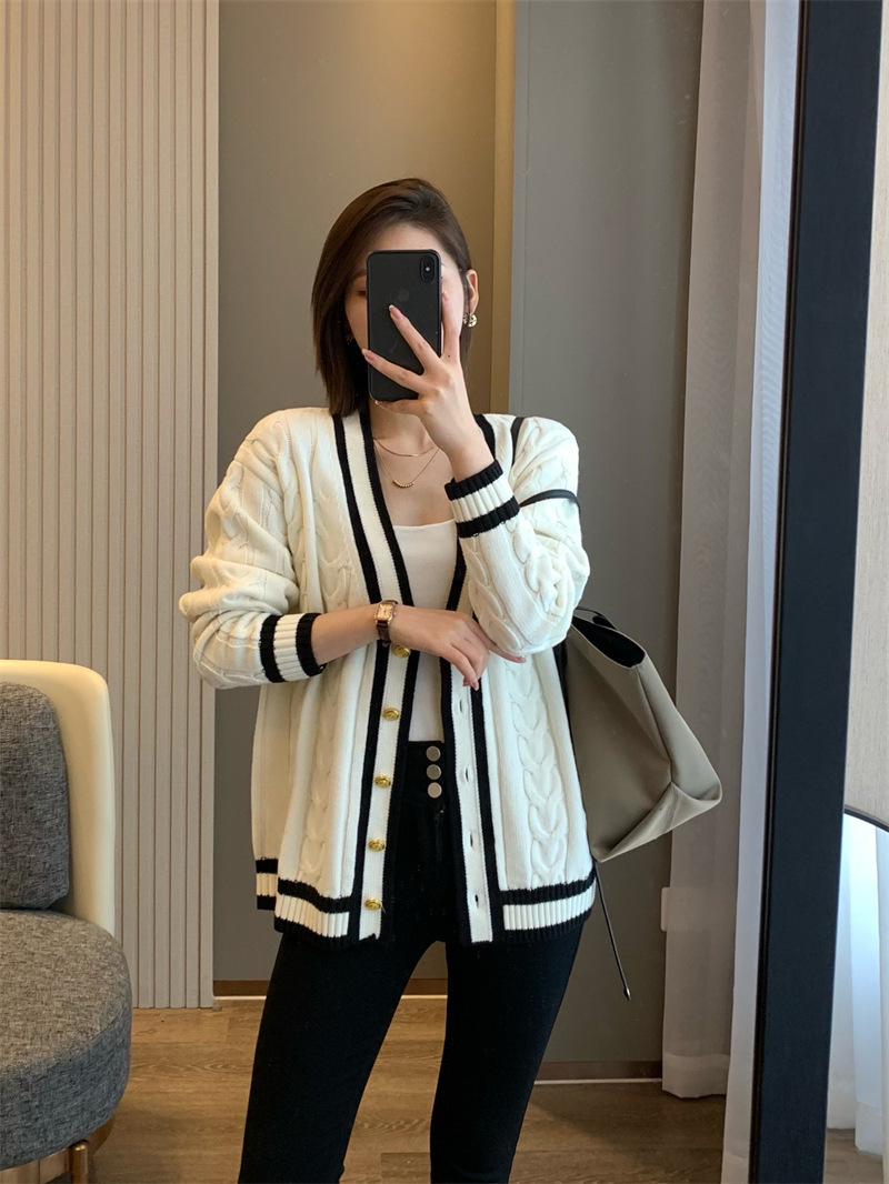 여성을 위한 레이지 스타일 트위스트 골드 버튼 스웨터, 루즈한 아우터웨어, 2025 가을 겨울 새로운 디자인, 대비되는 컬러의 니트 가디건 트렌디