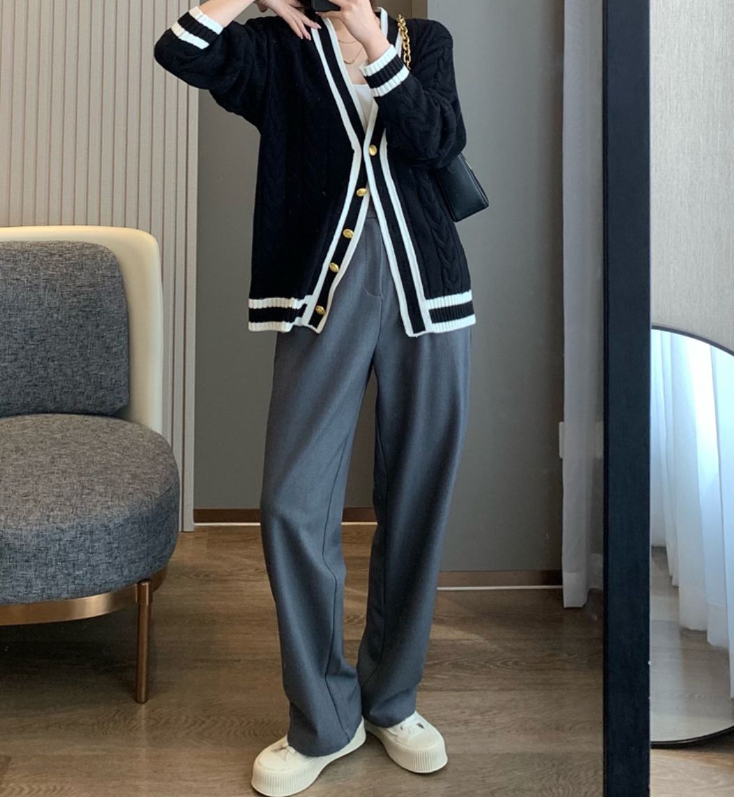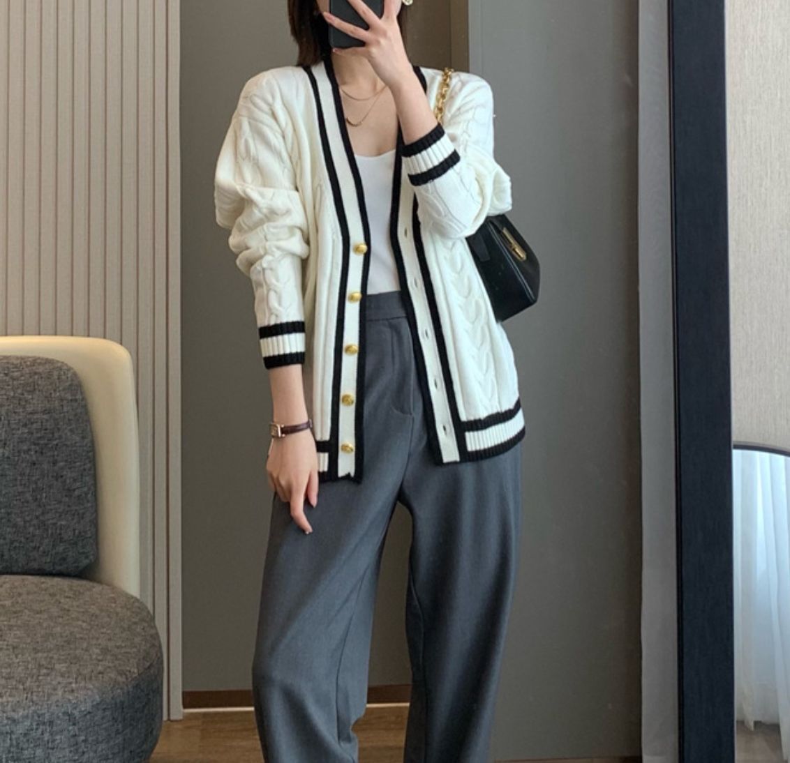 여성을 위한 레이지 스타일 트위스트 골드 버튼 스웨터, 루즈한 아우터웨어, 2025 가을 겨울 새로운 디자인, 대비되는 컬러의 니트 가디건 트렌디스토어 가기