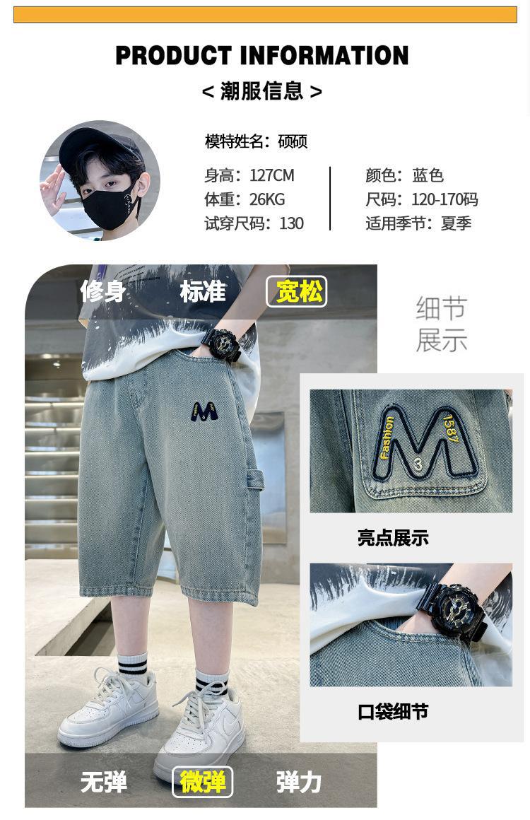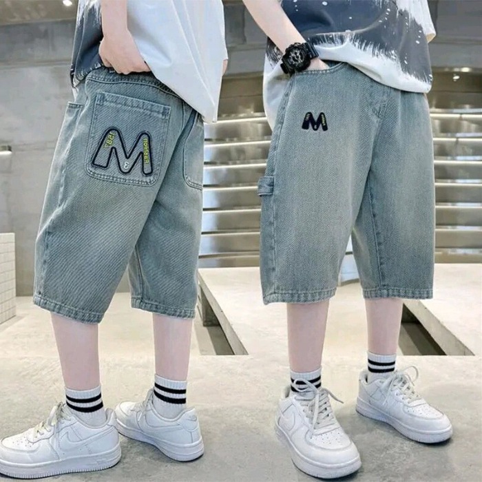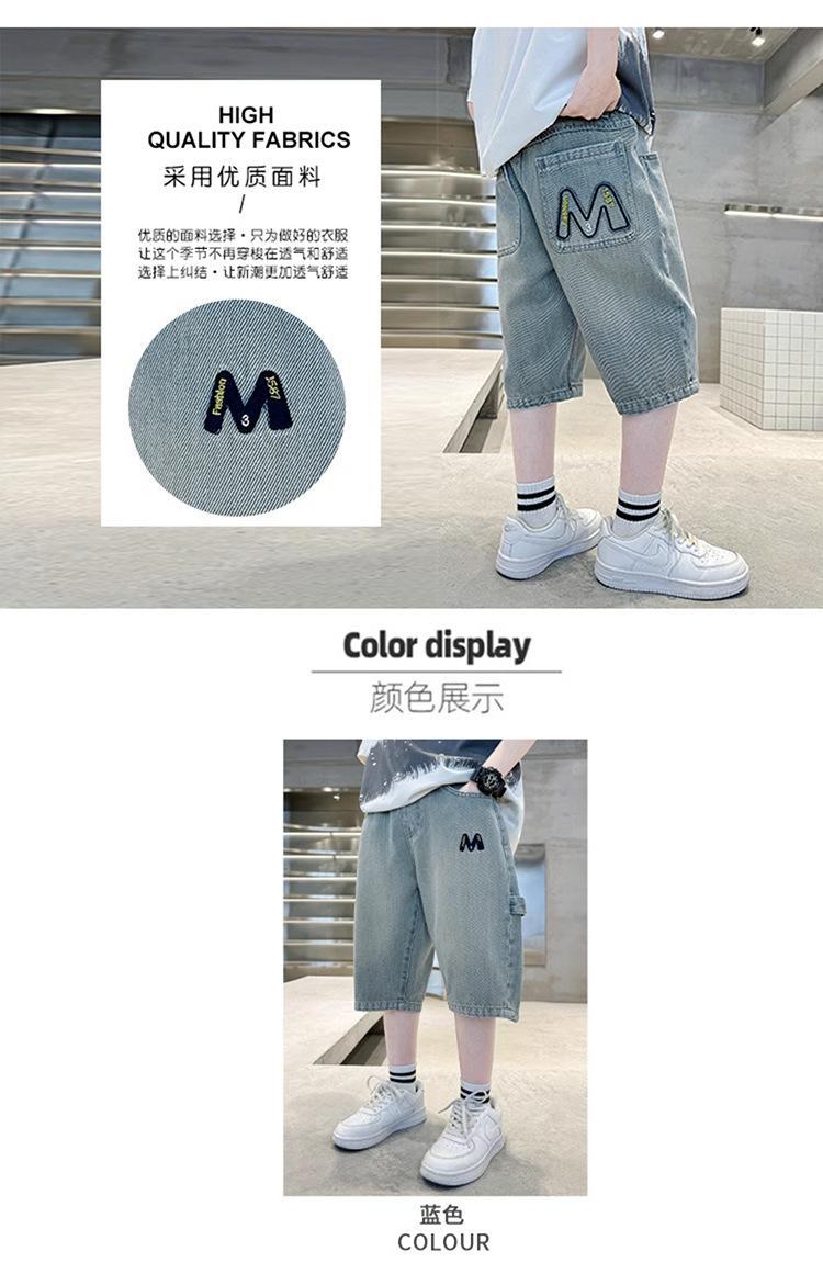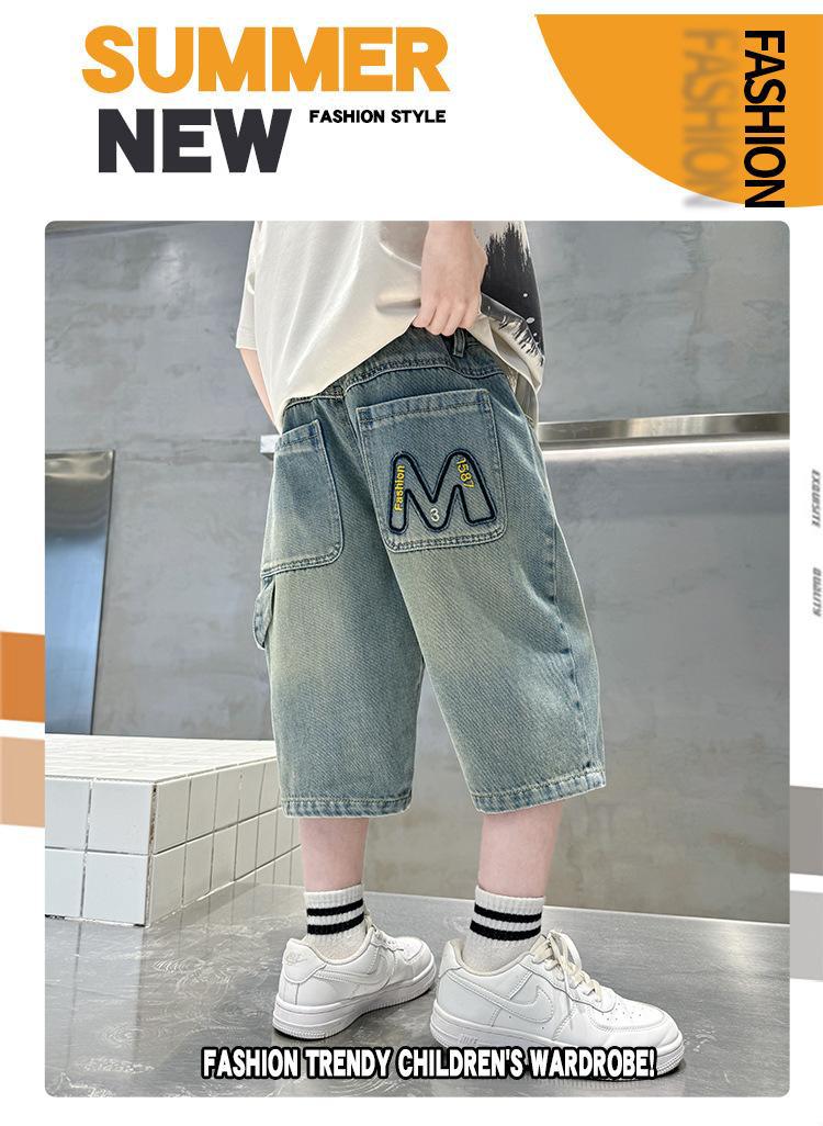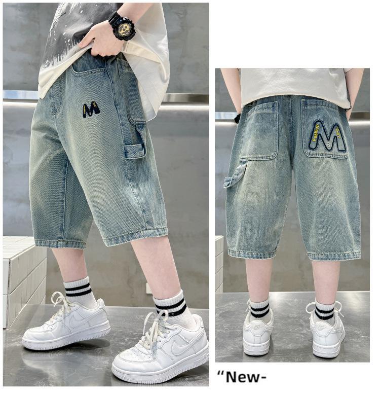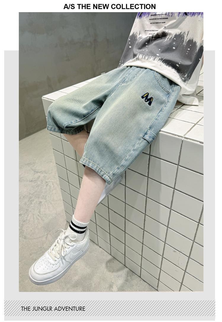 소년 알파벳 자수 데님 반바지 여름 새로운 한국 스타일 중대형 아동용 얇은 크롭 팬츠 루즈 캐주얼 중간 바지