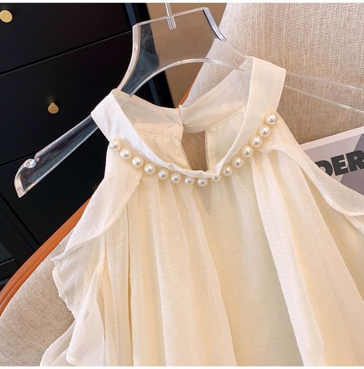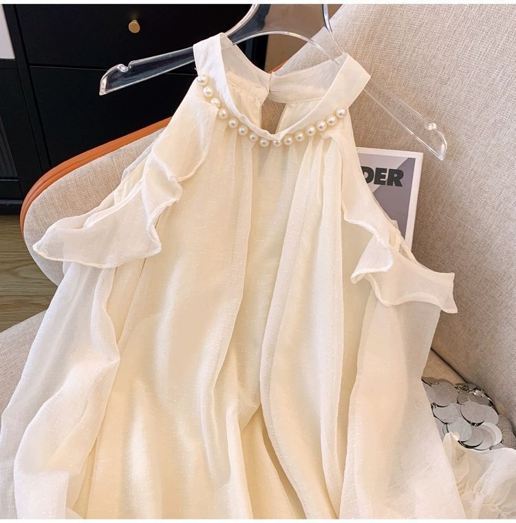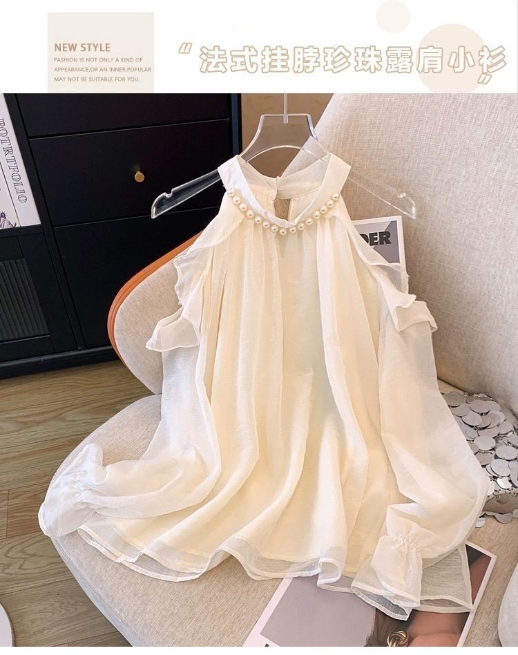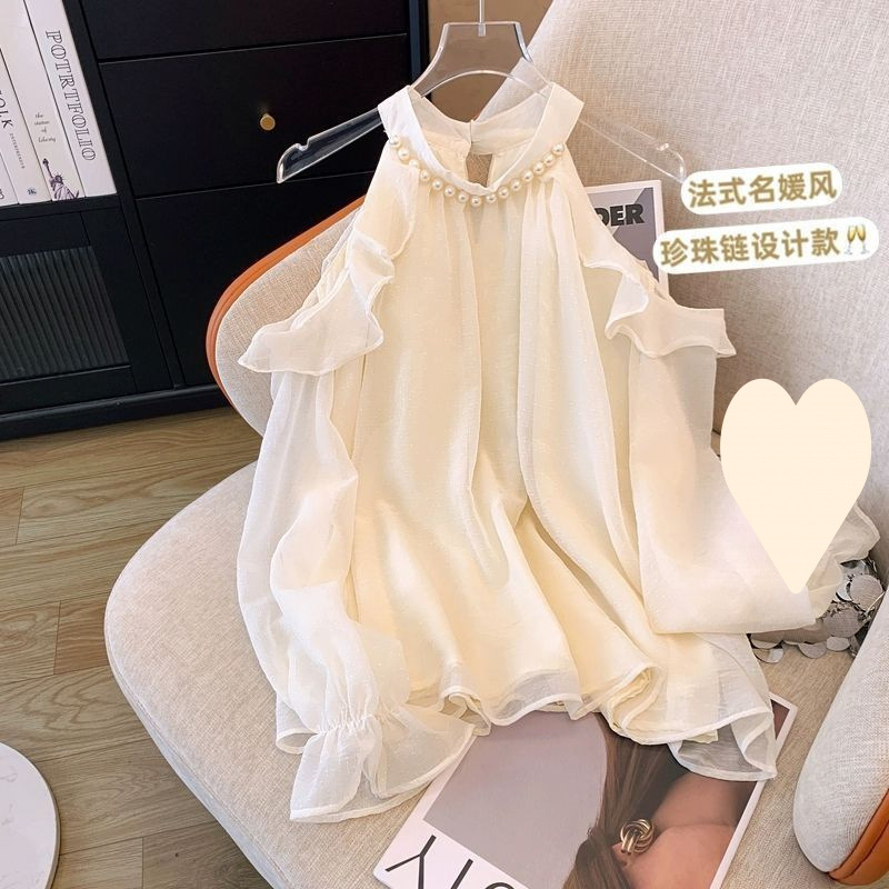 여성을위한 프렌치 펄 홀터넥 오프 숄더 쉬폰 셔츠 가을 트럼펫 긴팔 셔츠 루즈하고 세련된 연령 감소 스위트 탑