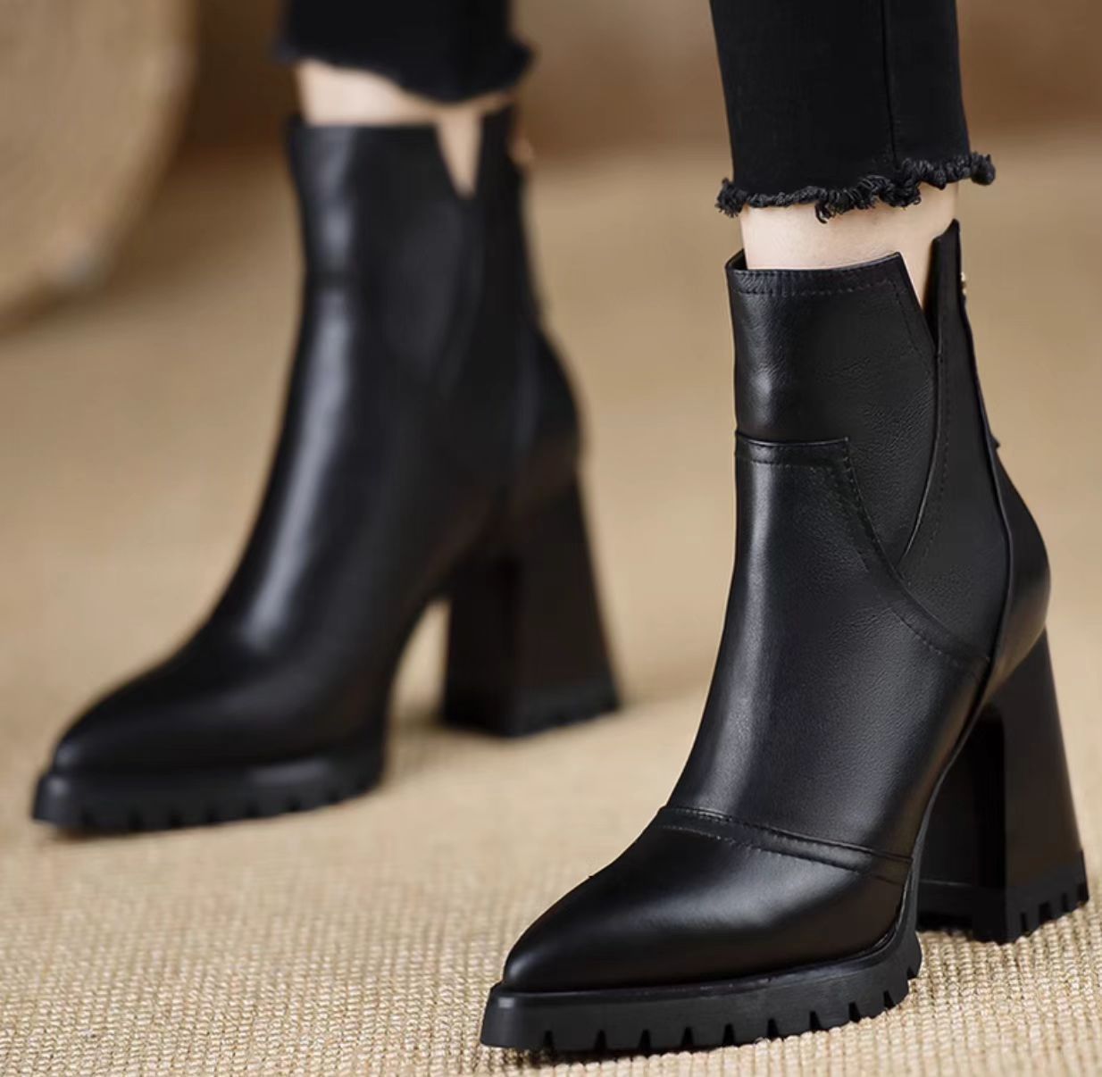 英伦复古高跟后拉链短靴女2025秋冬季新款软皮简约粗跟时尚马丁靴