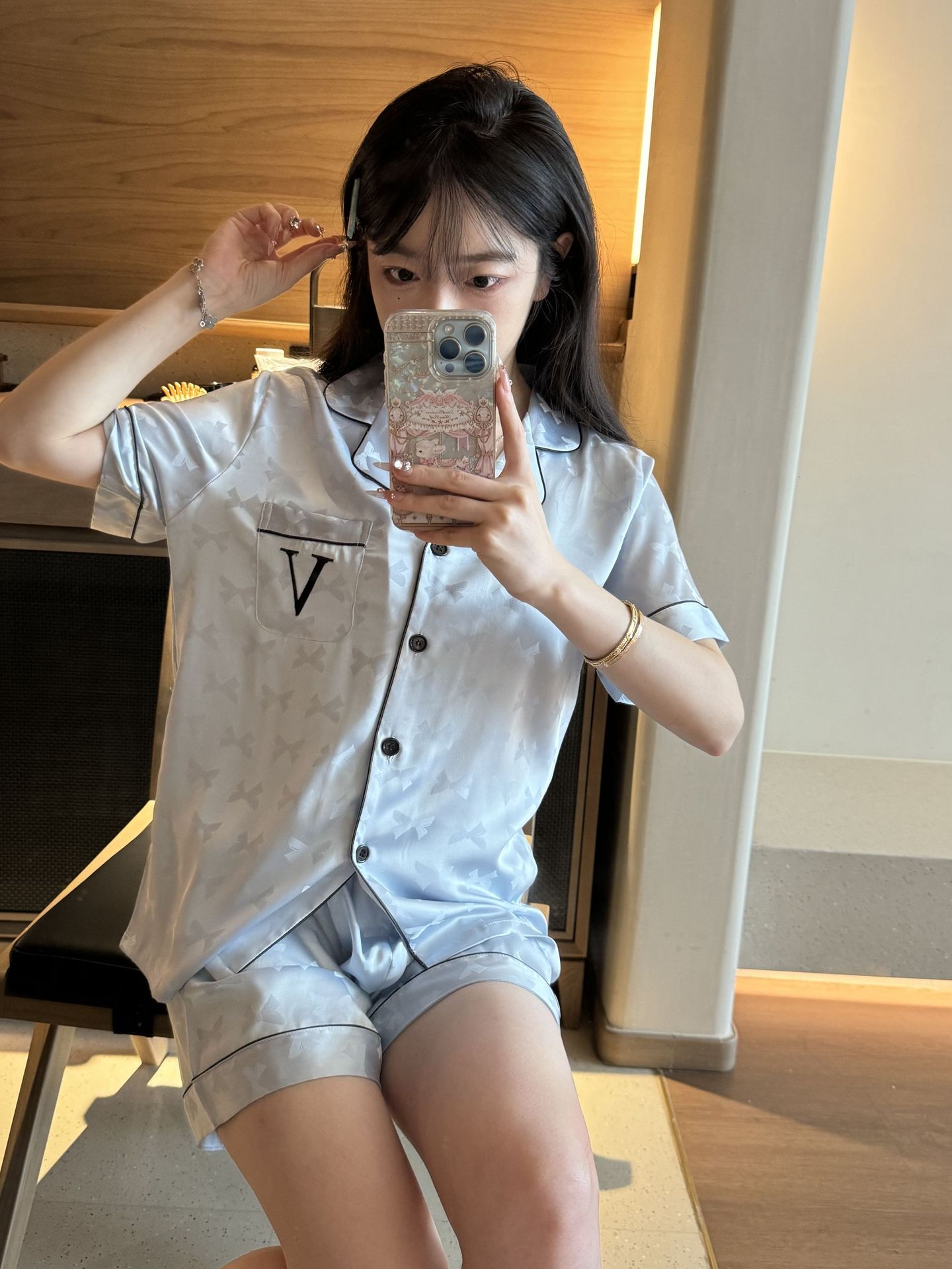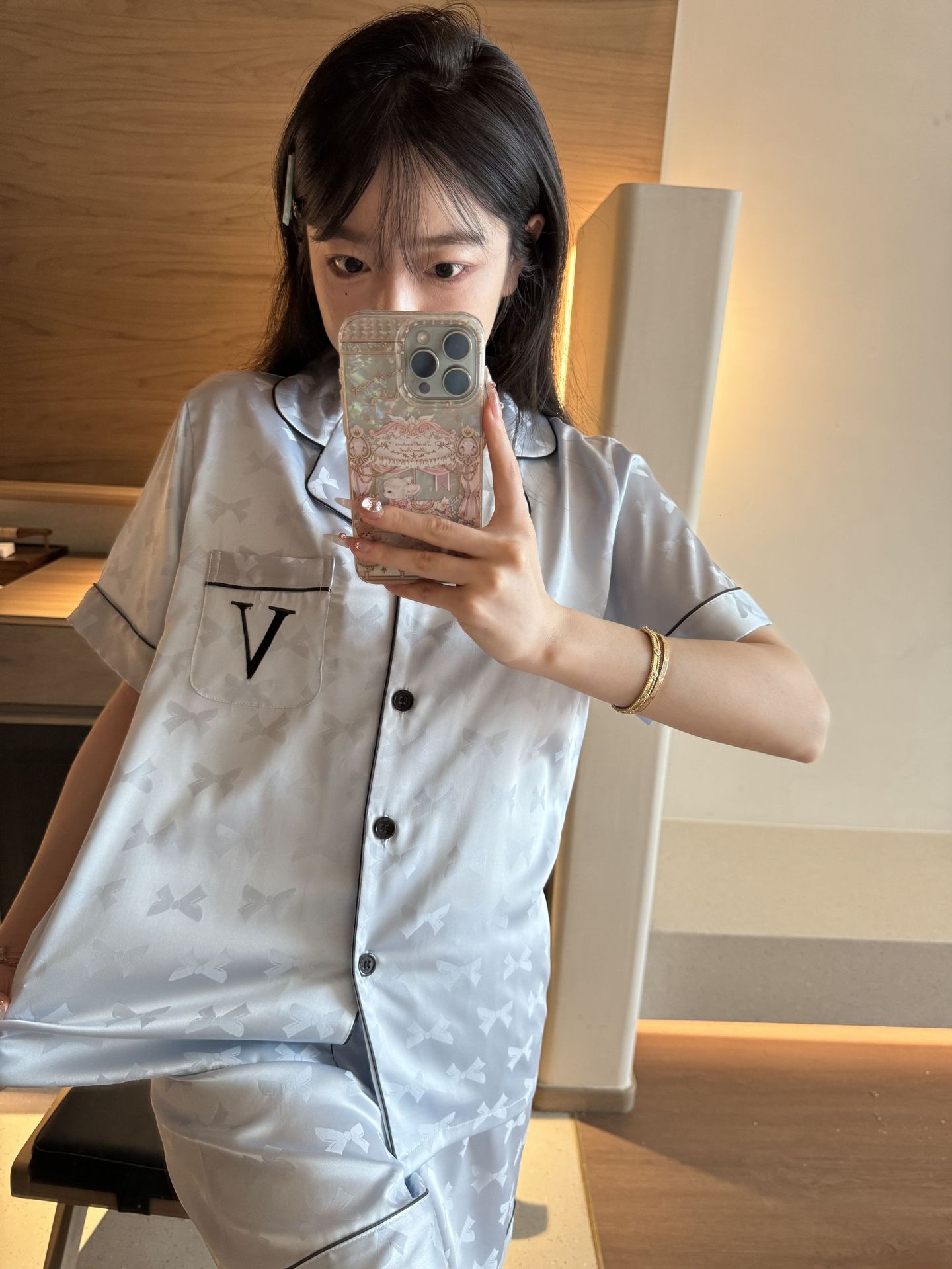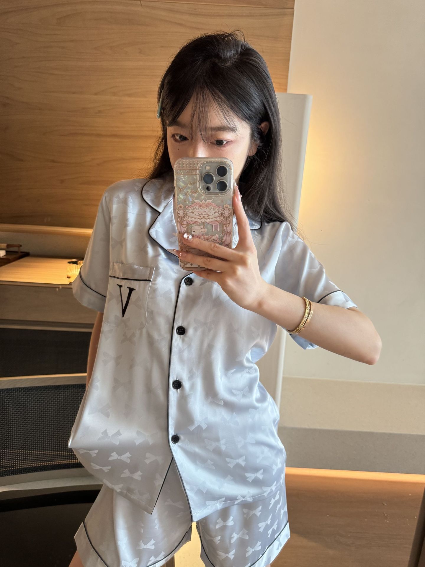 [멍청한 미녀] 여름 신작 Weijia bestie bow ice and snow 실크 얇은 잠옷 반팔 반바지 세트스토어 가기