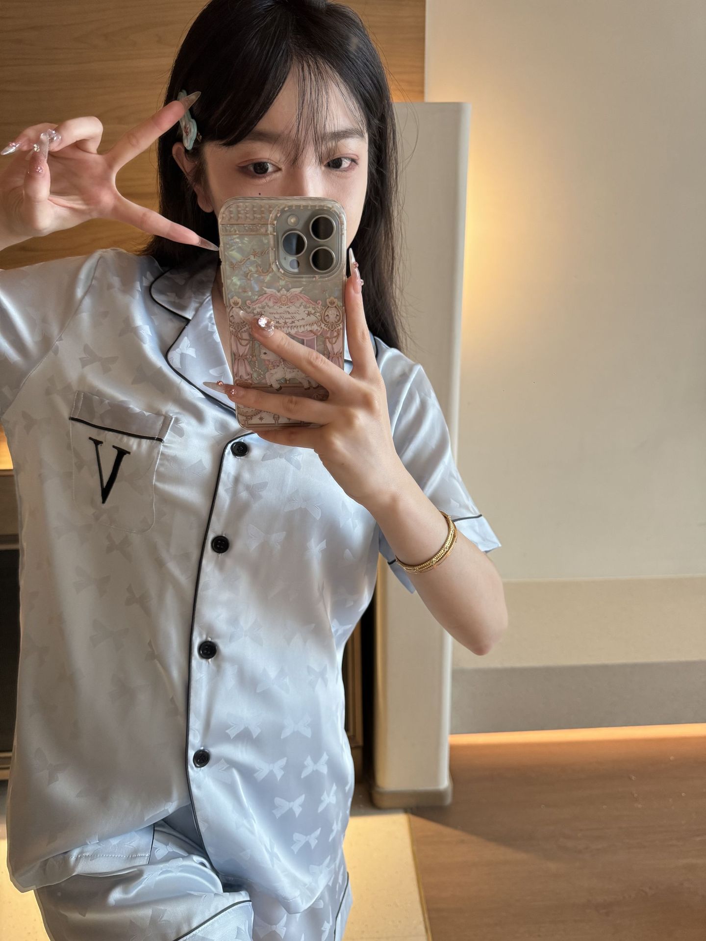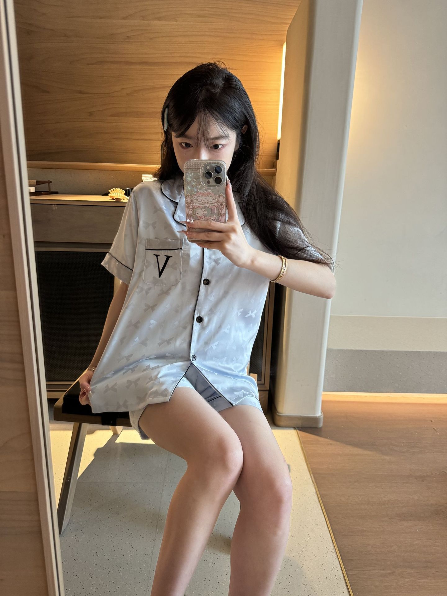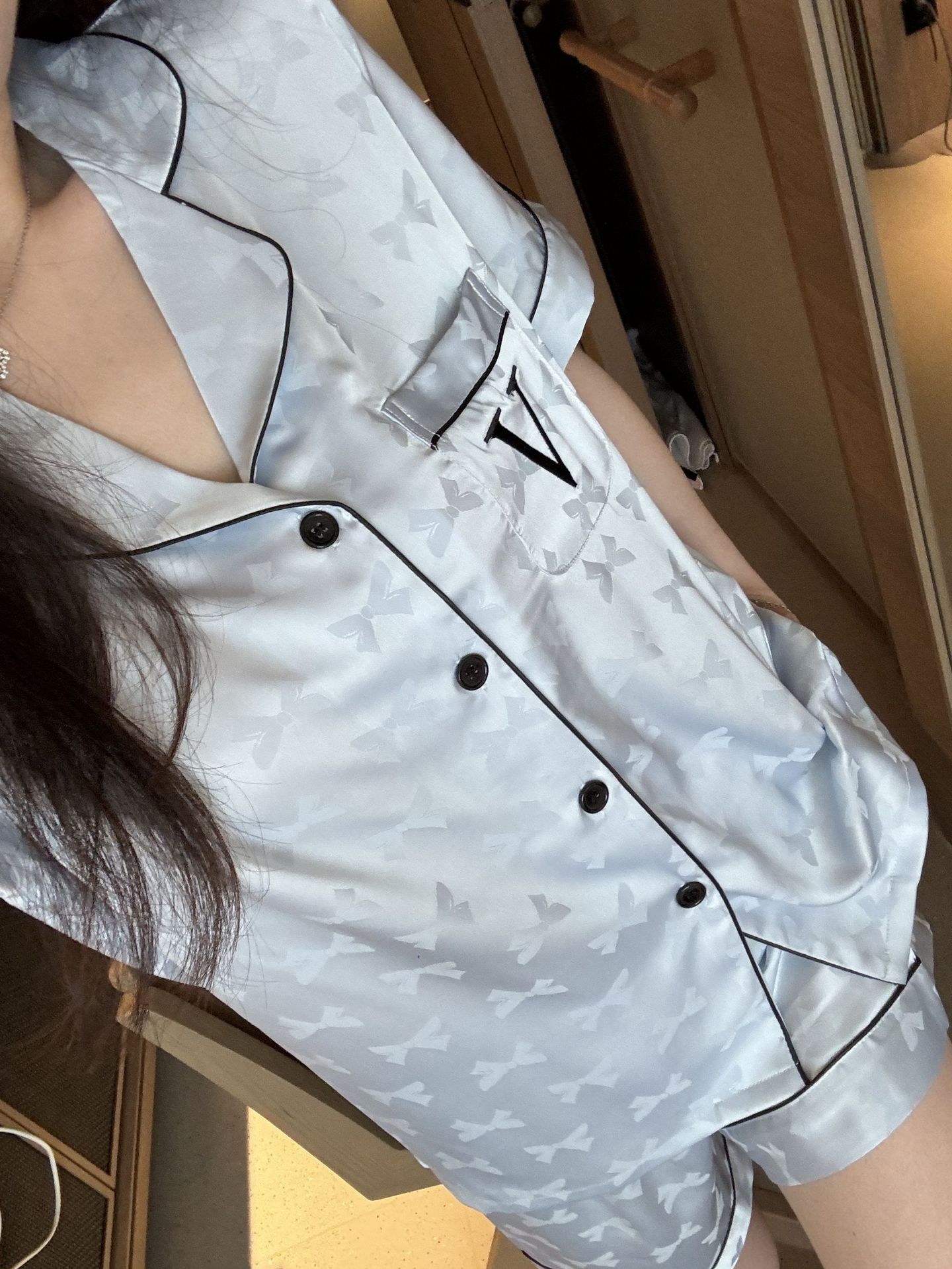 [멍청한 미녀] 여름 신작 Weijia bestie bow ice and snow 실크 얇은 잠옷 반팔 반바지 세트스토어 가기