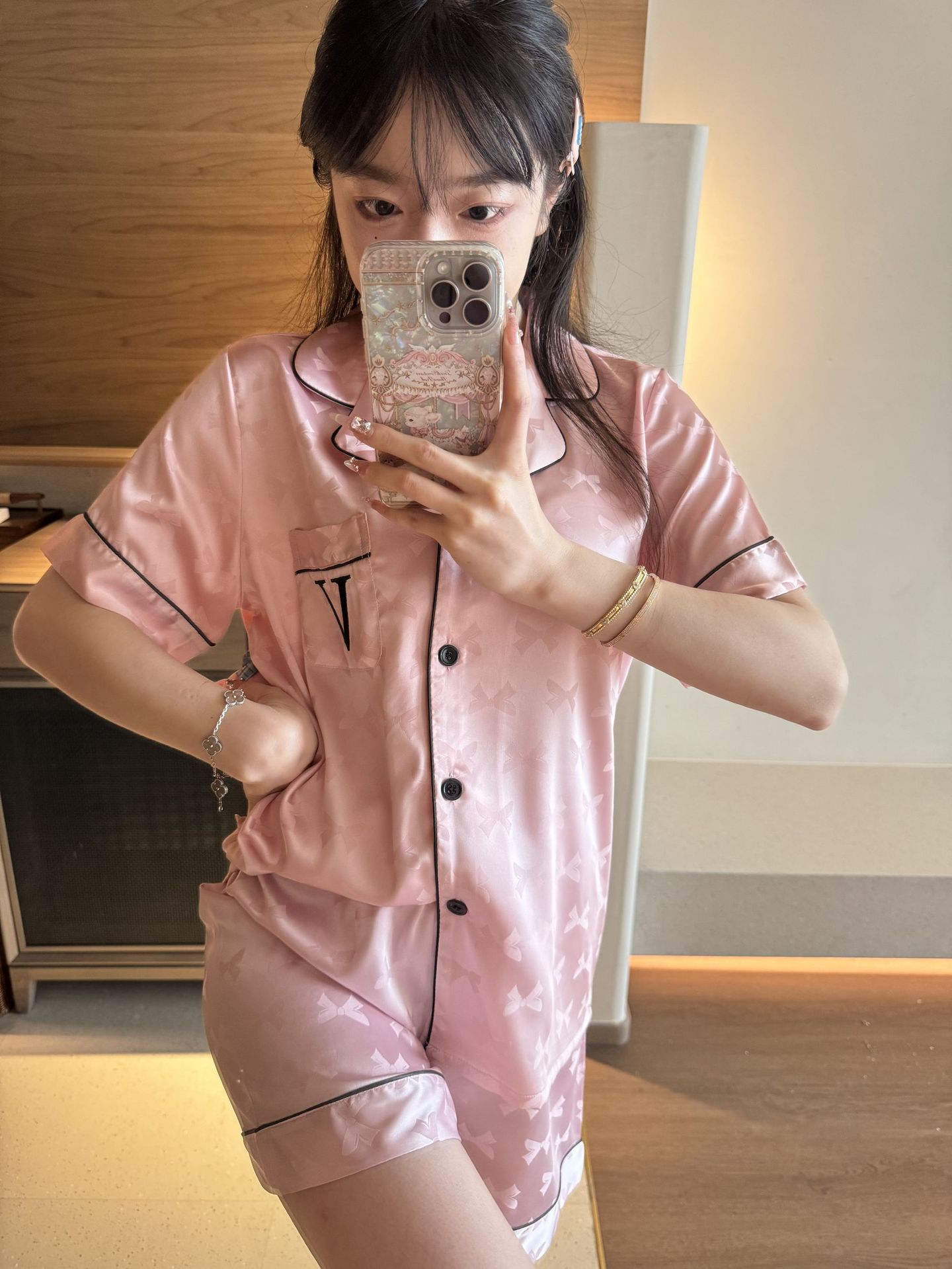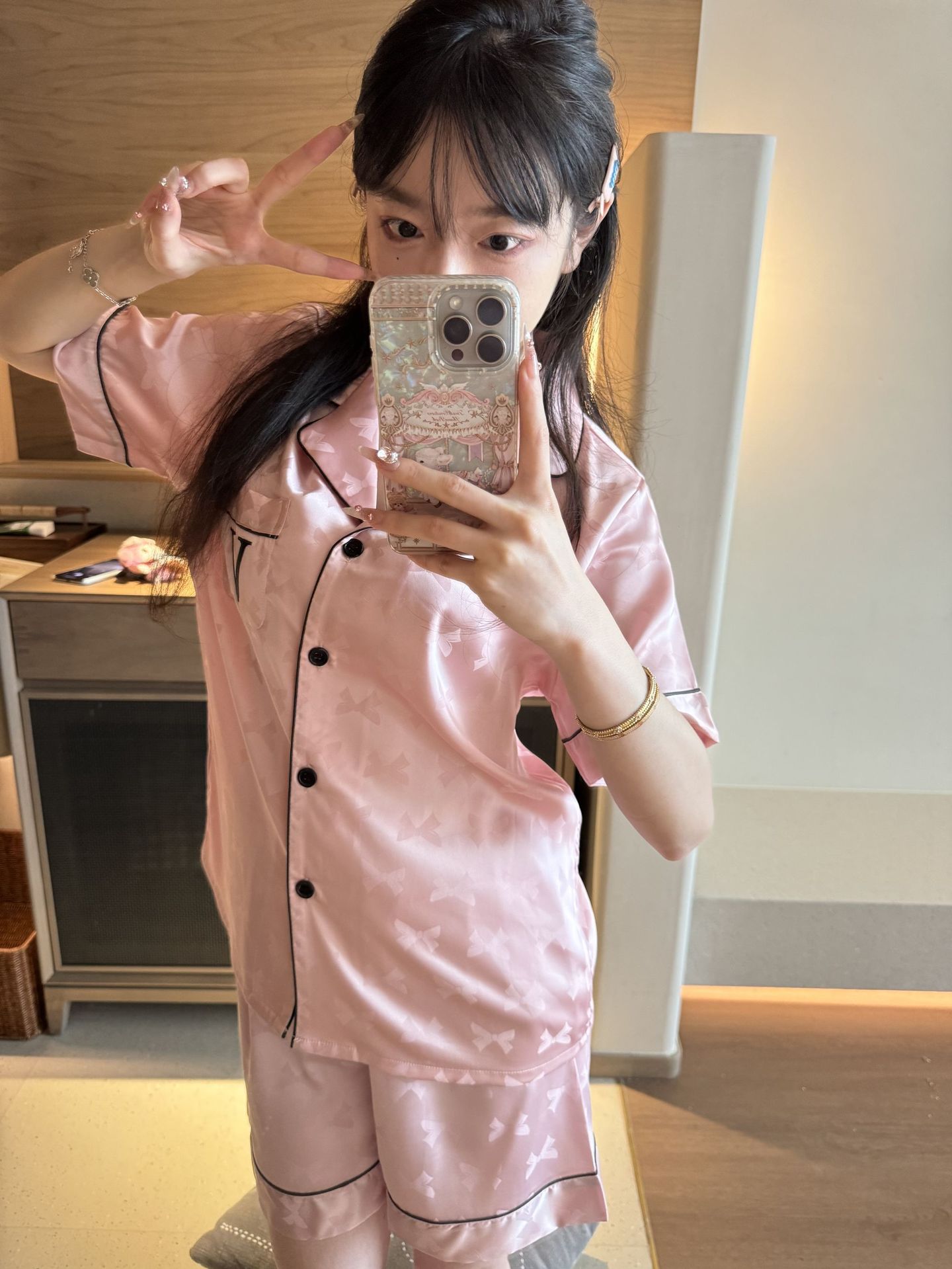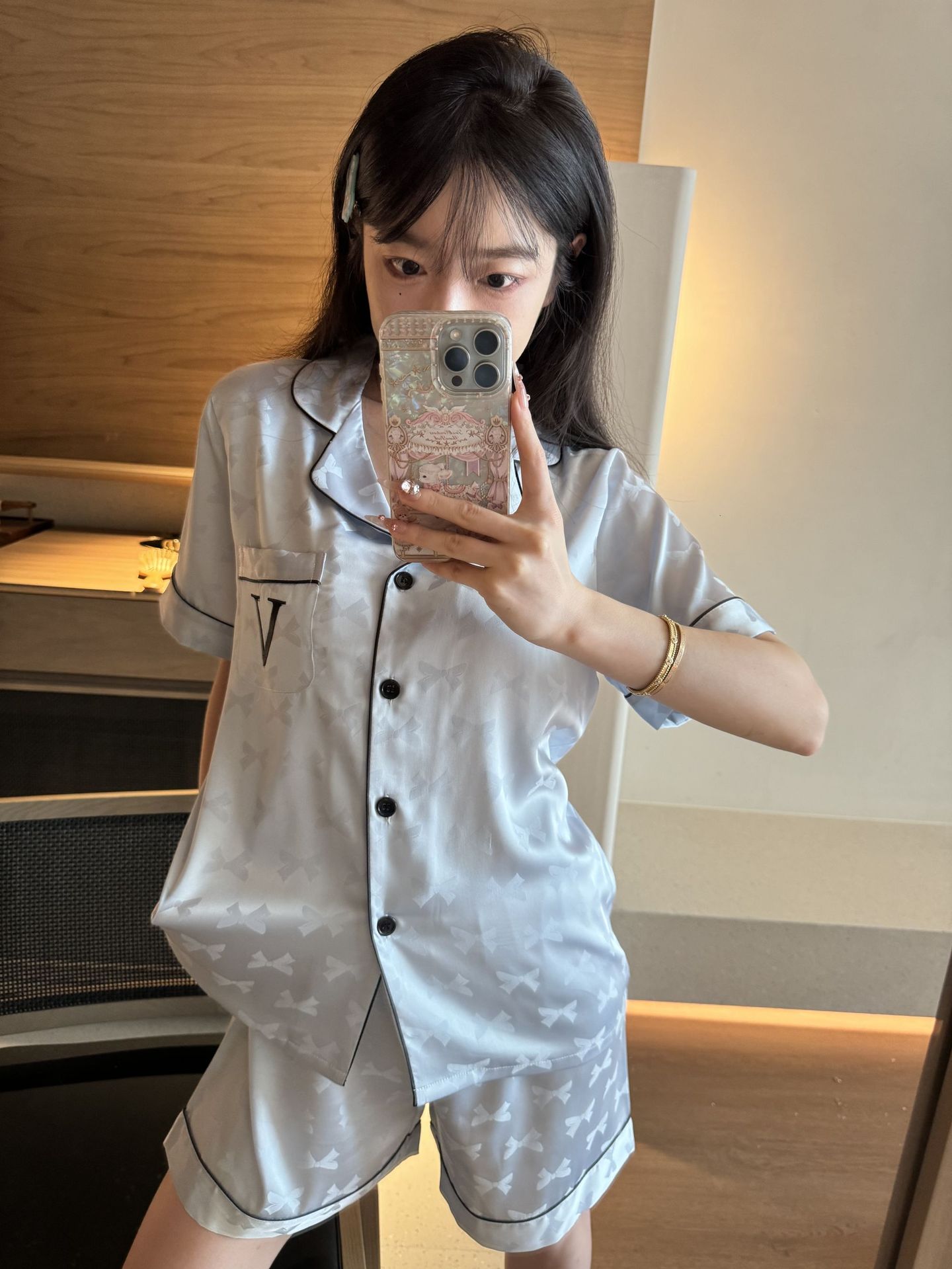 [멍청한 미녀] 여름 신작 Weijia bestie bow ice and snow 실크 얇은 잠옷 반팔 반바지 세트