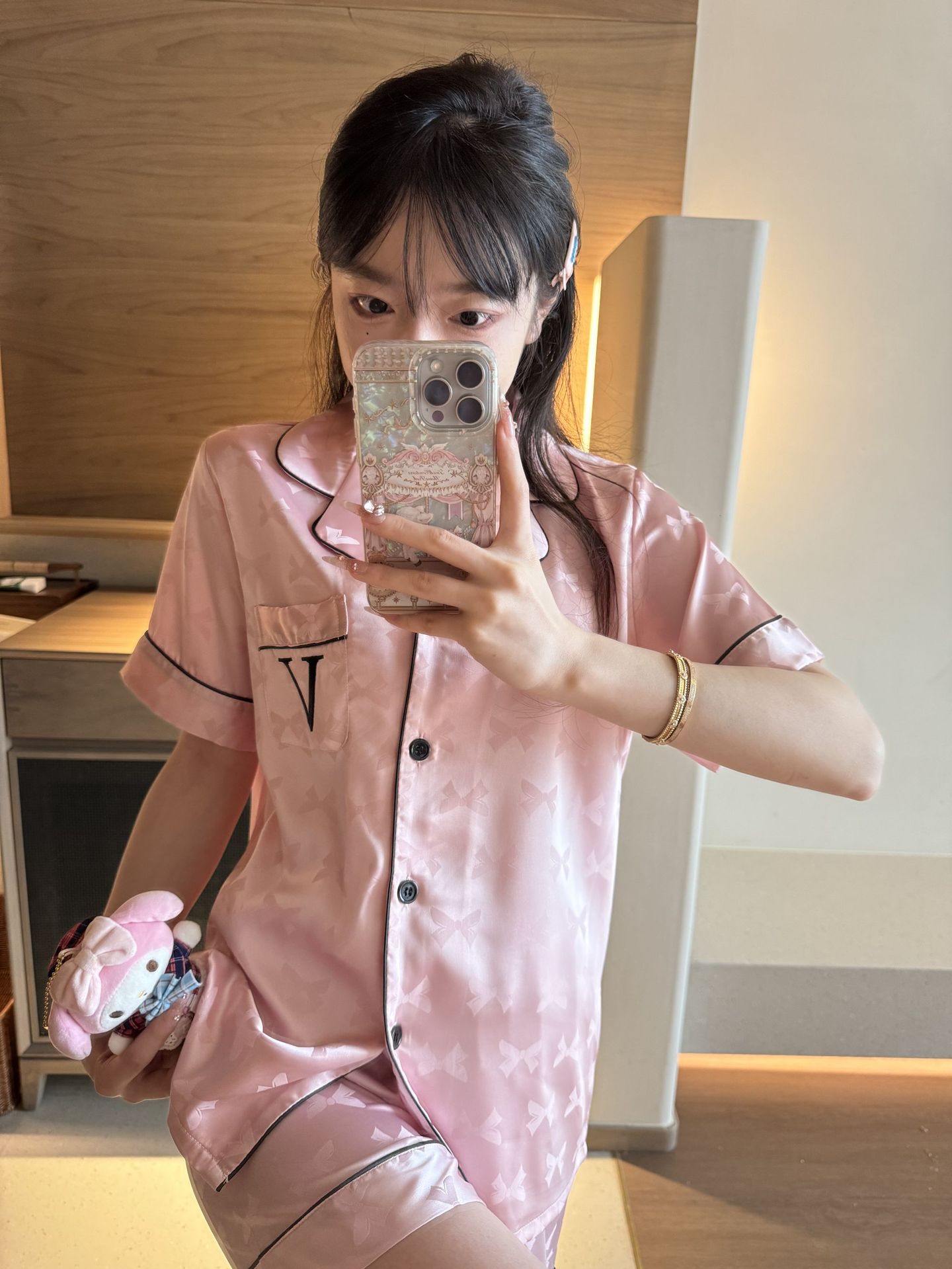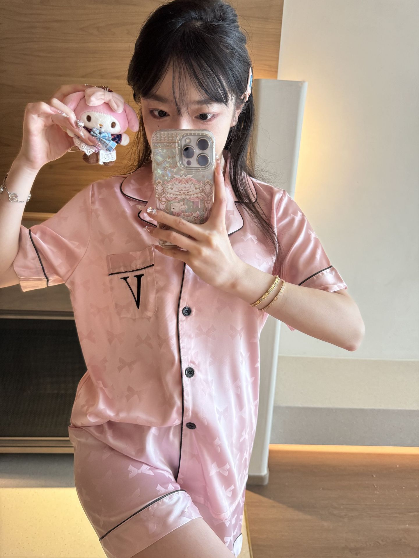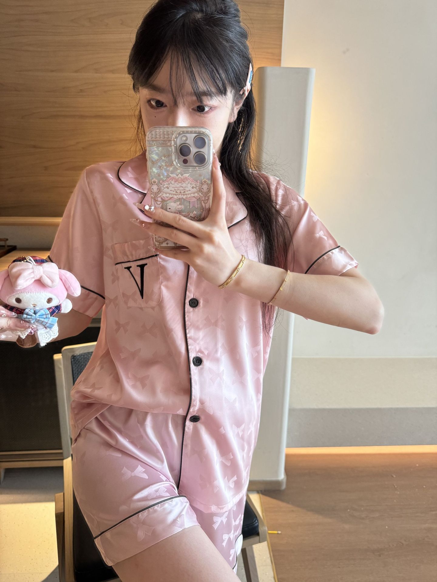 [멍청한 미녀] 여름 신작 Weijia bestie bow ice and snow 실크 얇은 잠옷 반팔 반바지 세트