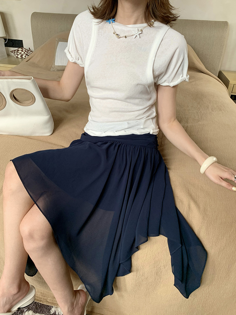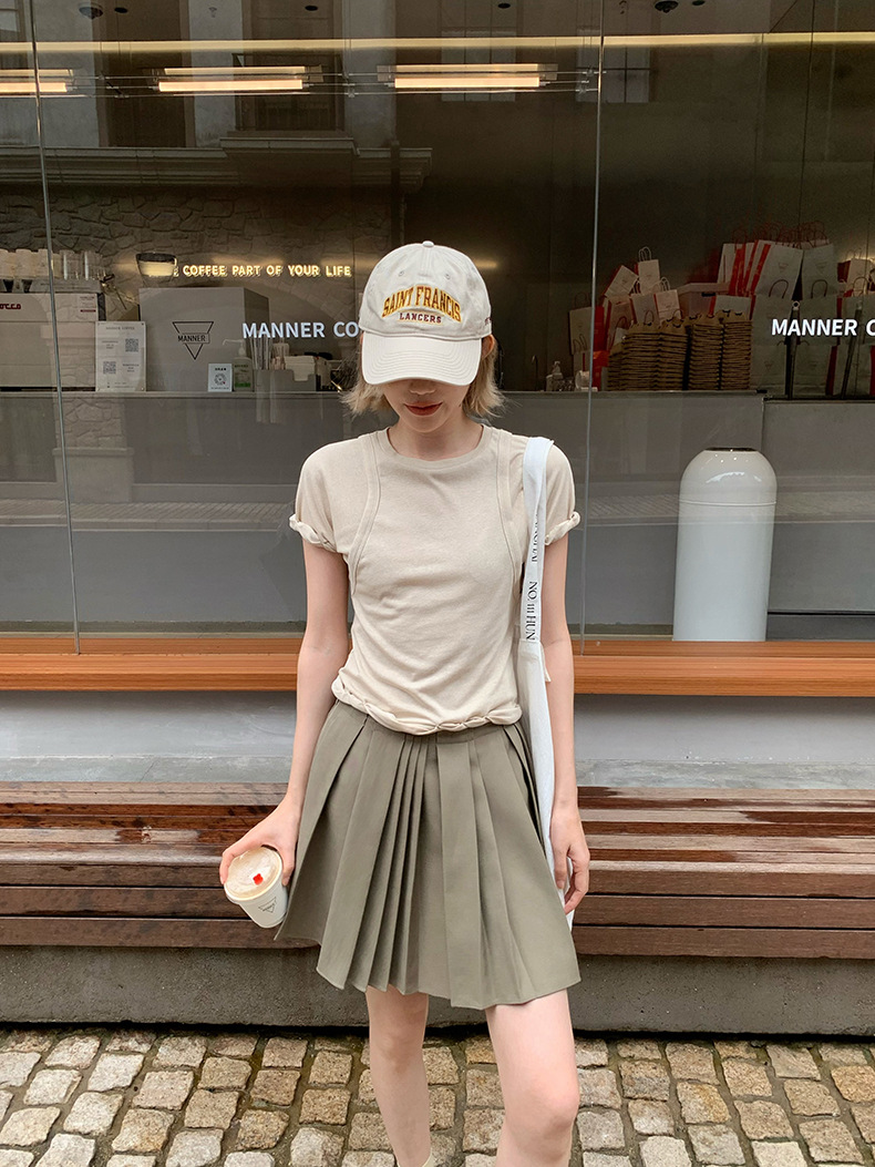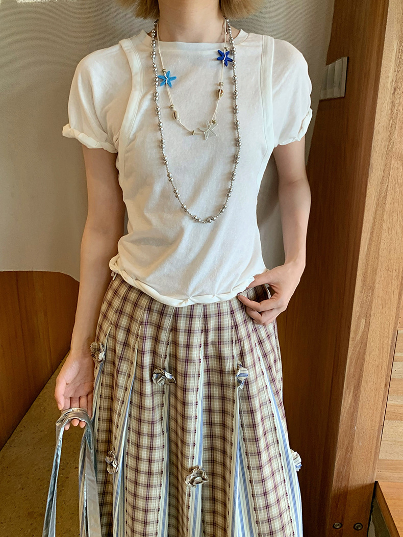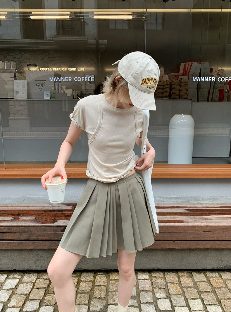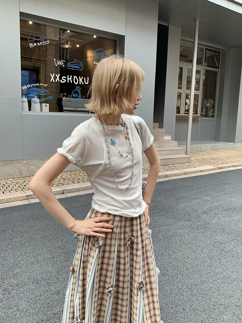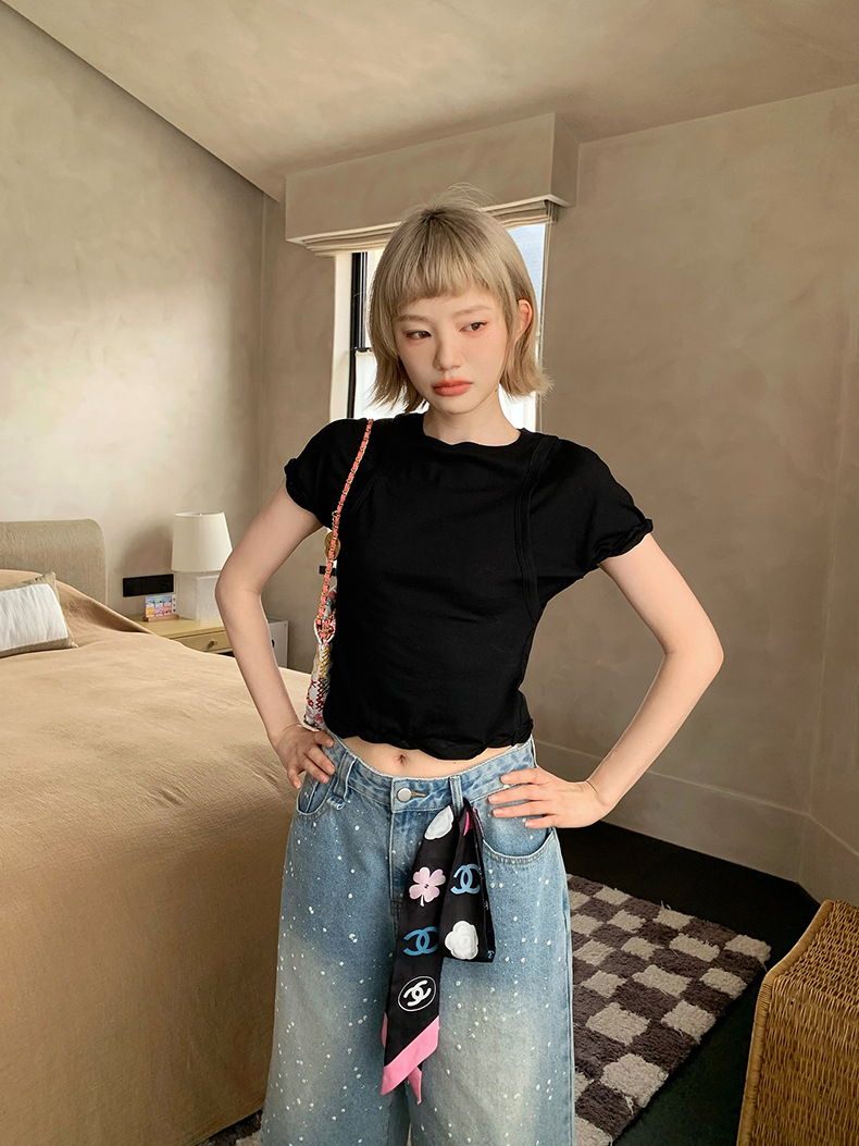 UNITY MODE 아메리칸 캐주얼 반팔 탑 슬리밍 여름 디자인 틈새 가짜 투피스 티셔츠 여성용스토어 가기