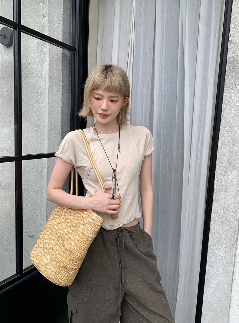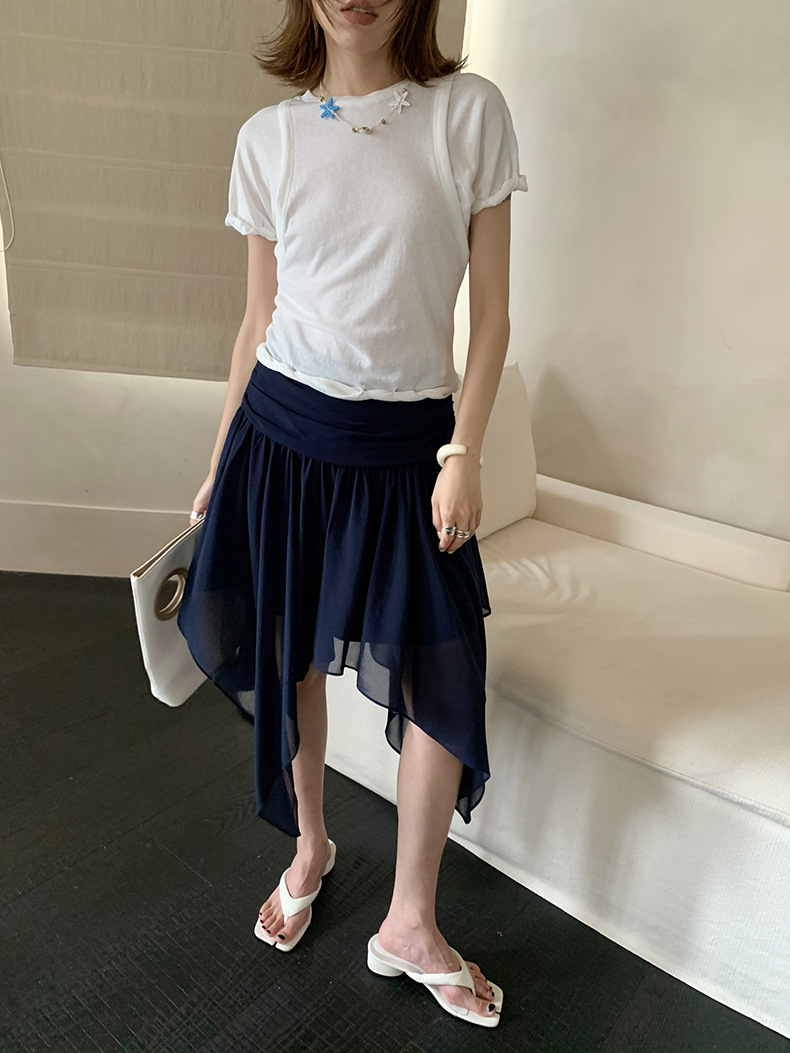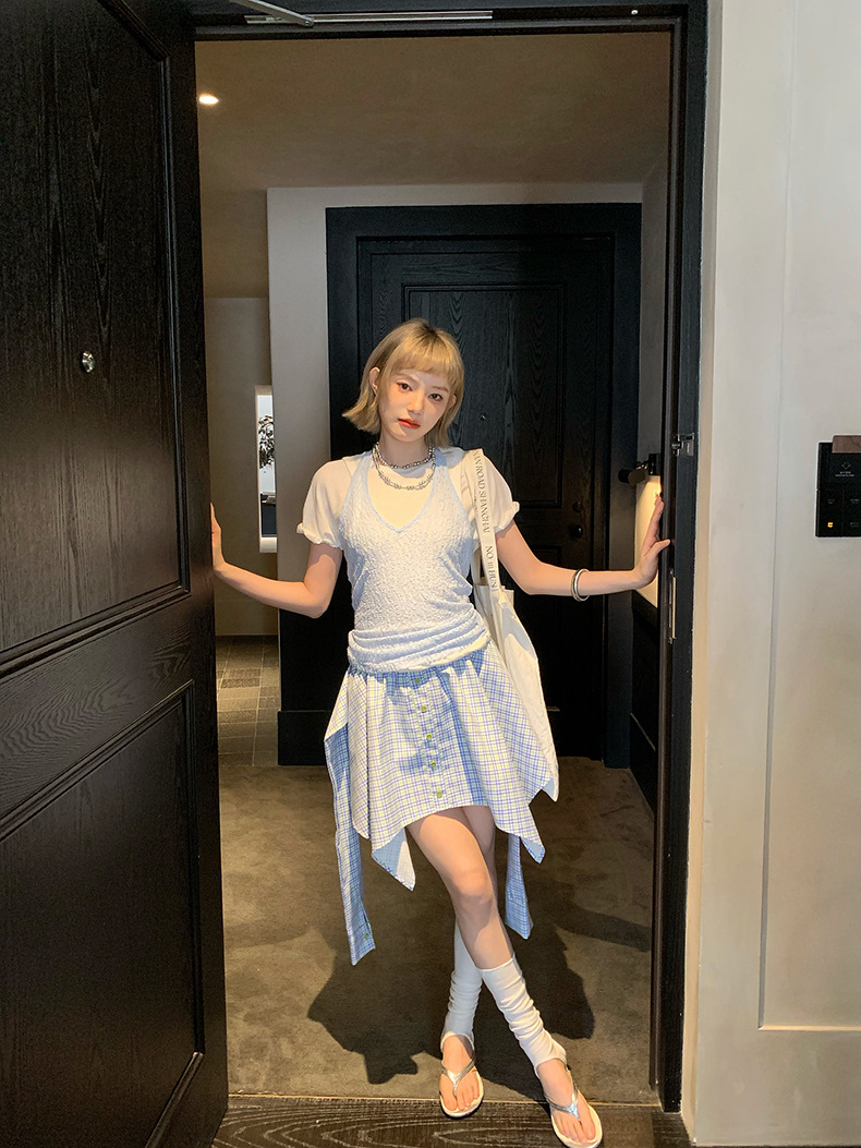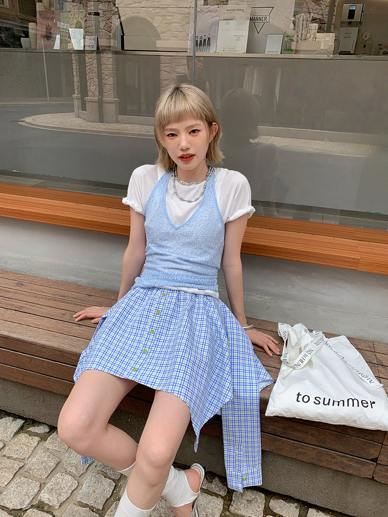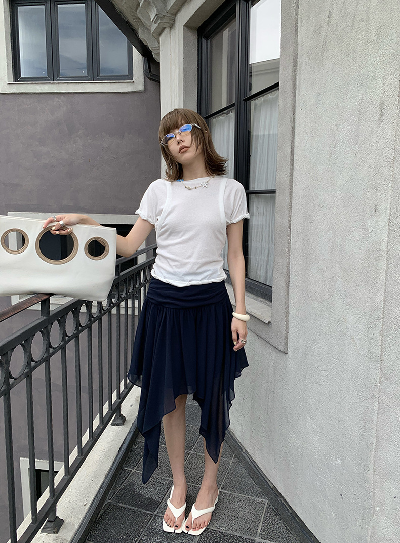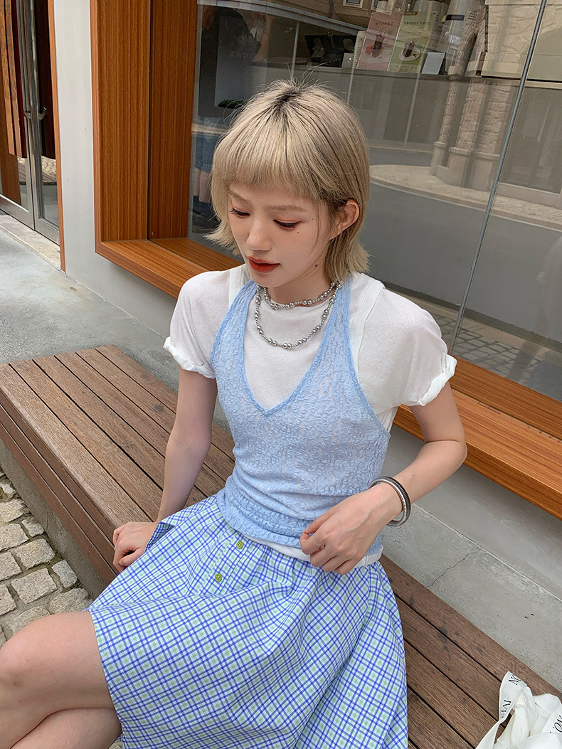 UNITY MODE 아메리칸 캐주얼 반팔 탑 슬리밍 여름 디자인 틈새 가짜 투피스 티셔츠 여성용스토어 가기