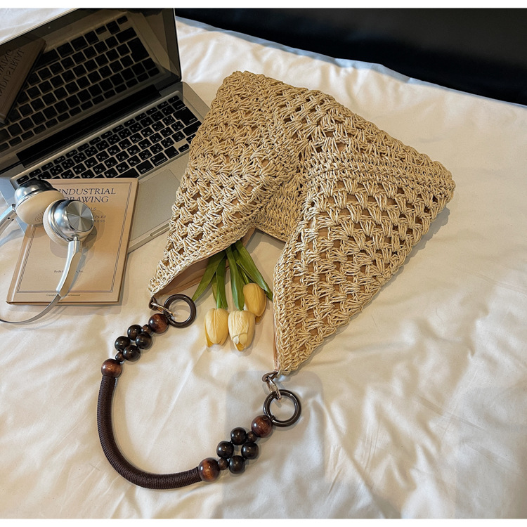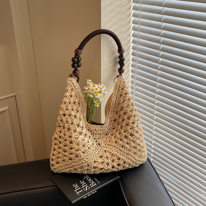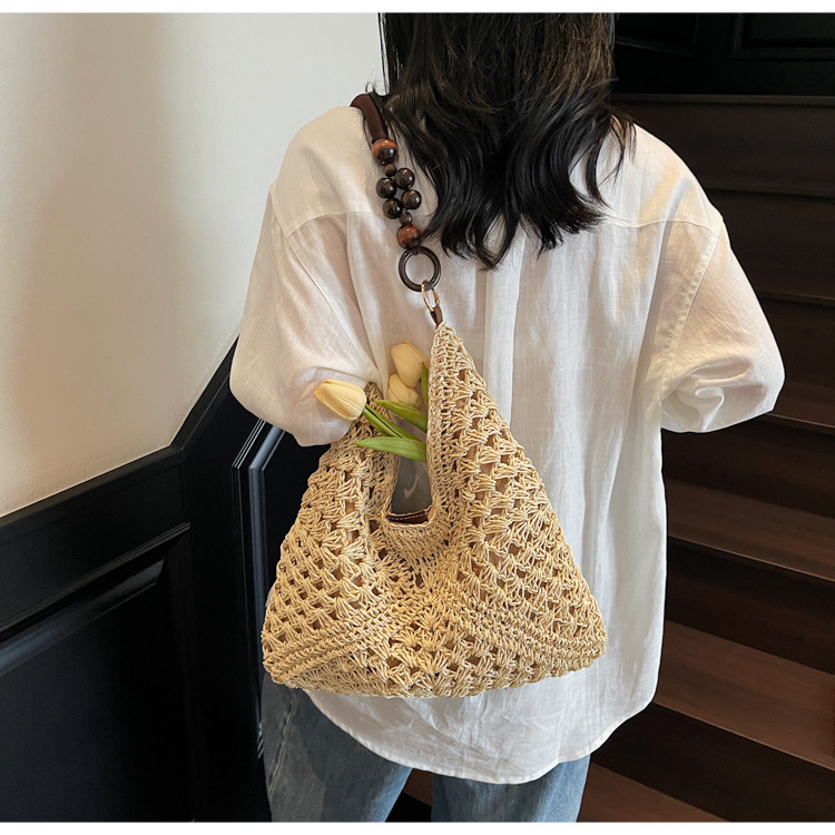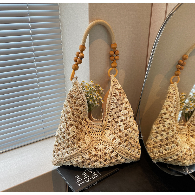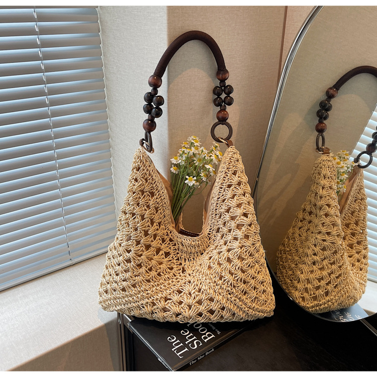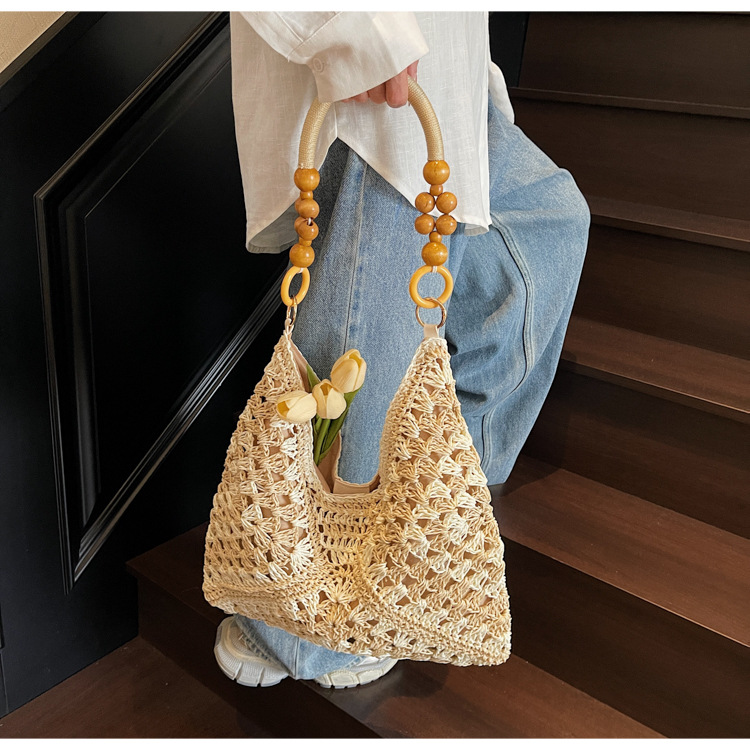 여성을위한 여름 중공 밀짚 가방 2025 새로운 복고풍 나무 구슬 어깨 겨드랑이 가방 해변 휴가 스타일 비치 가방