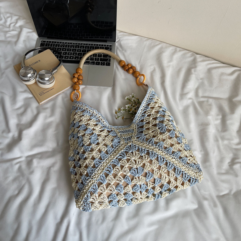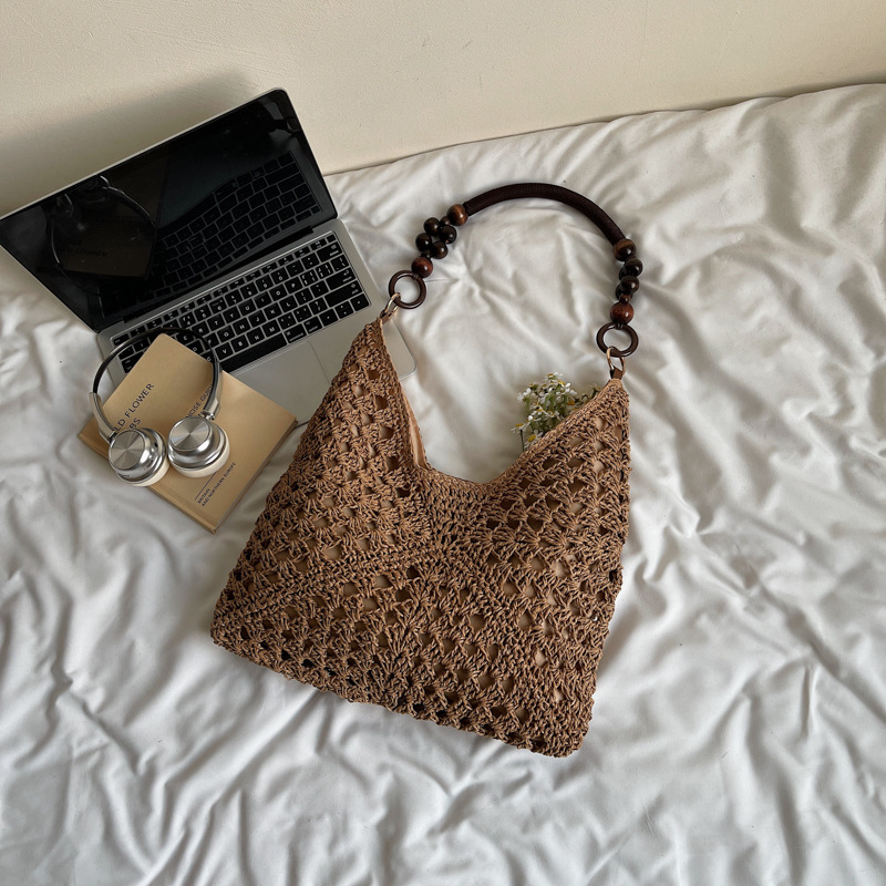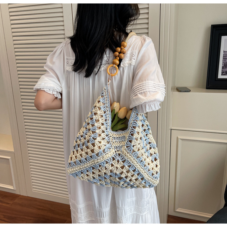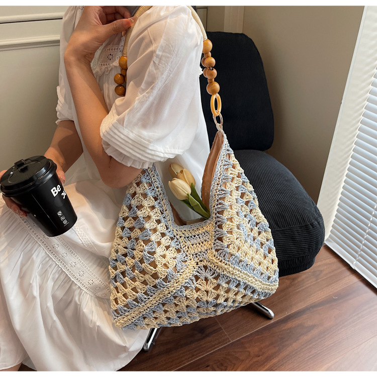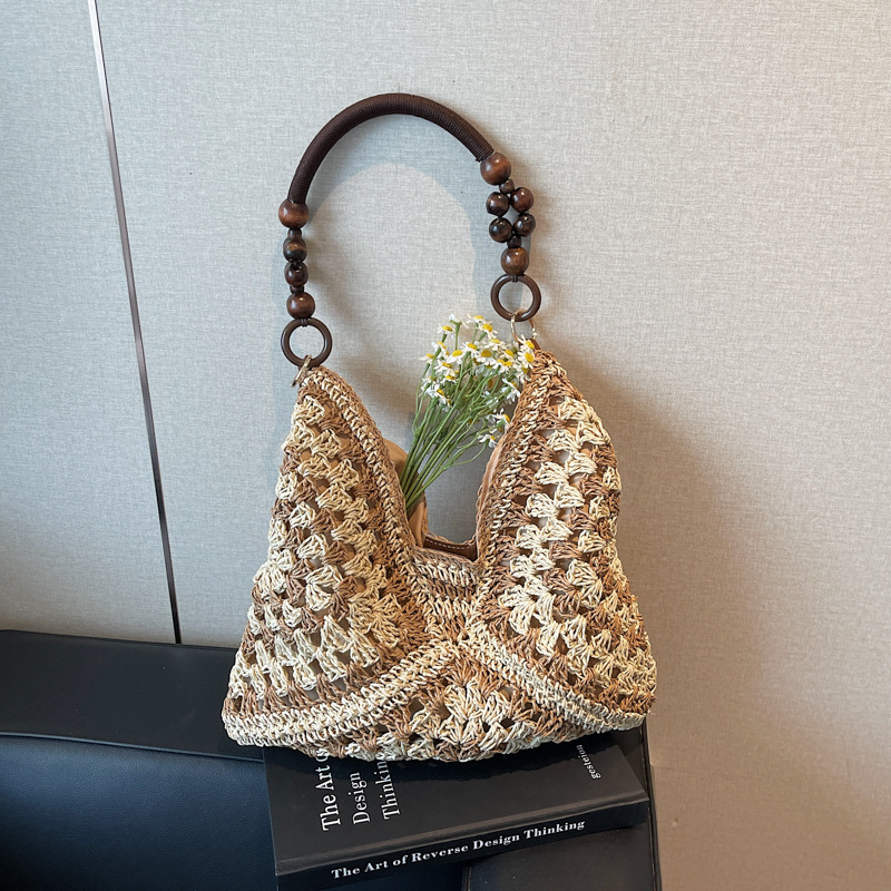 여성을위한 여름 중공 밀짚 가방 2025 새로운 복고풍 나무 구슬 어깨 겨드랑이 가방 해변 휴가 스타일 비치 가방