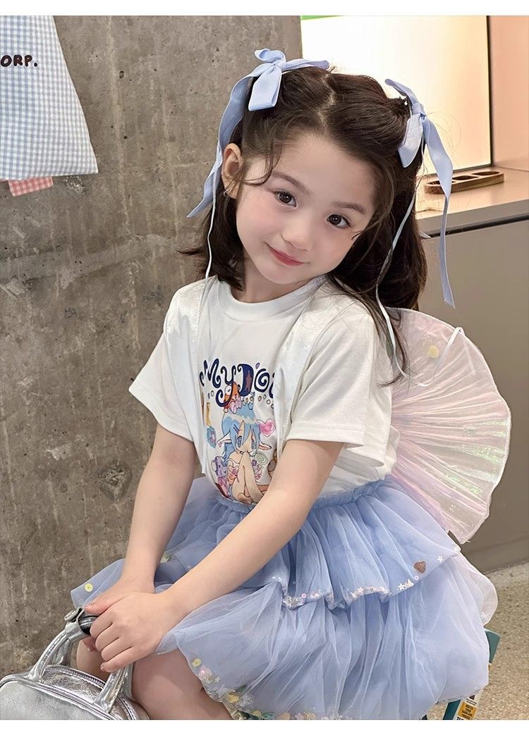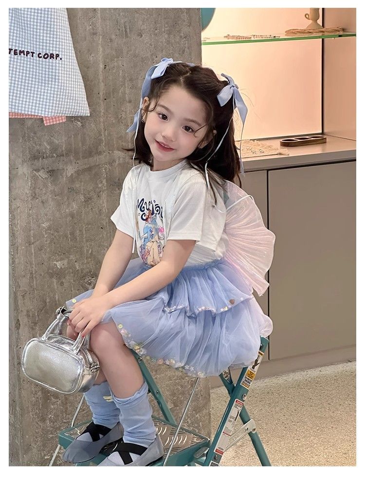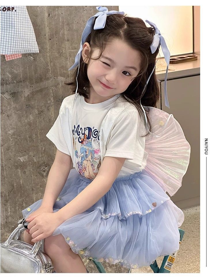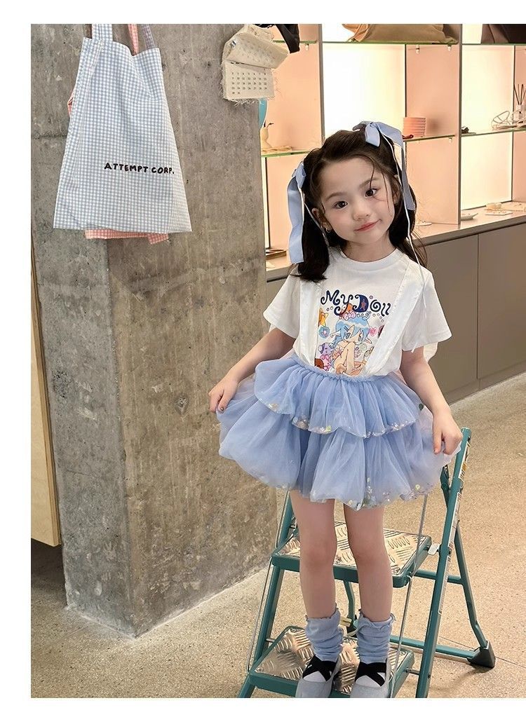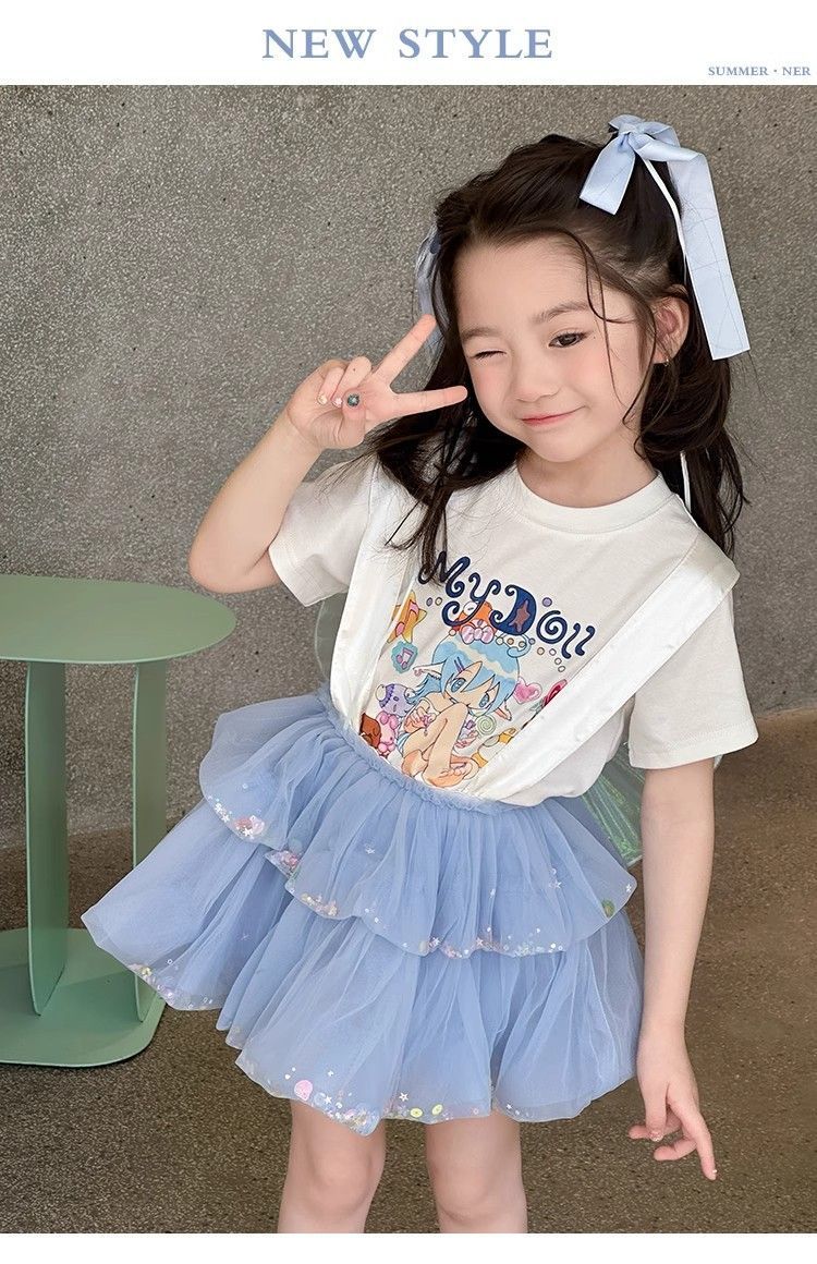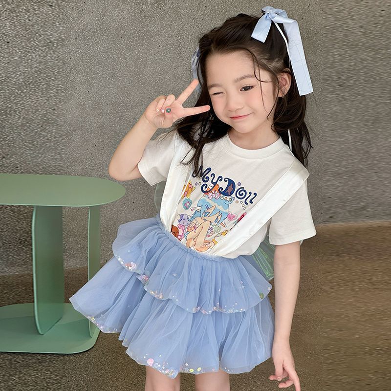 여자 정장 2025 새로운 여름 옷 아기 소녀 귀여운 인쇄 짧은 소매 달콤한 메쉬 레이스 스트랩 케이크 스커트스토어 가기