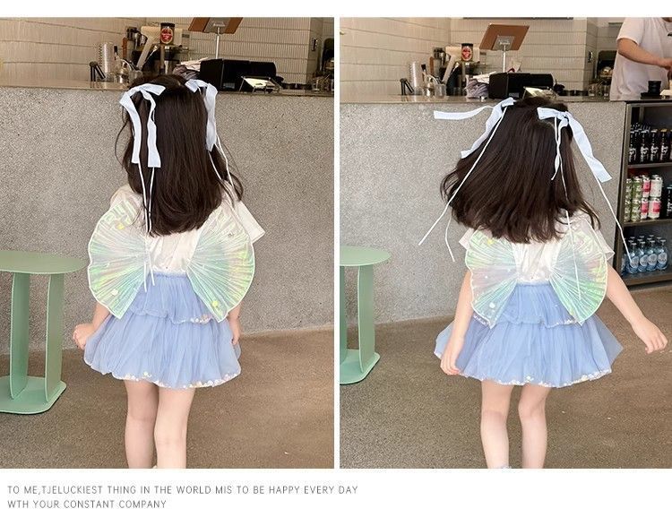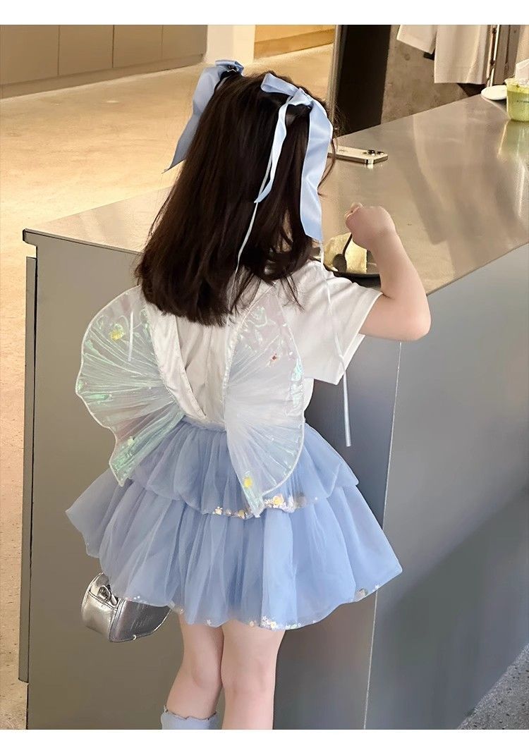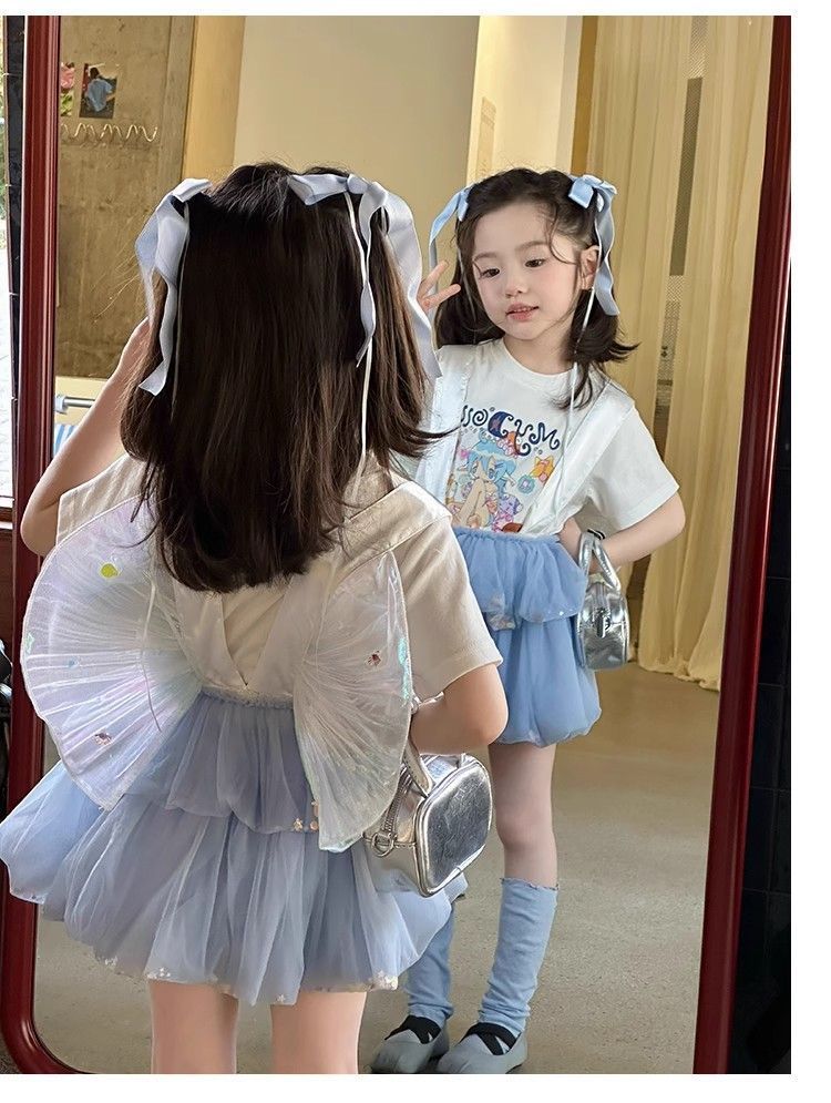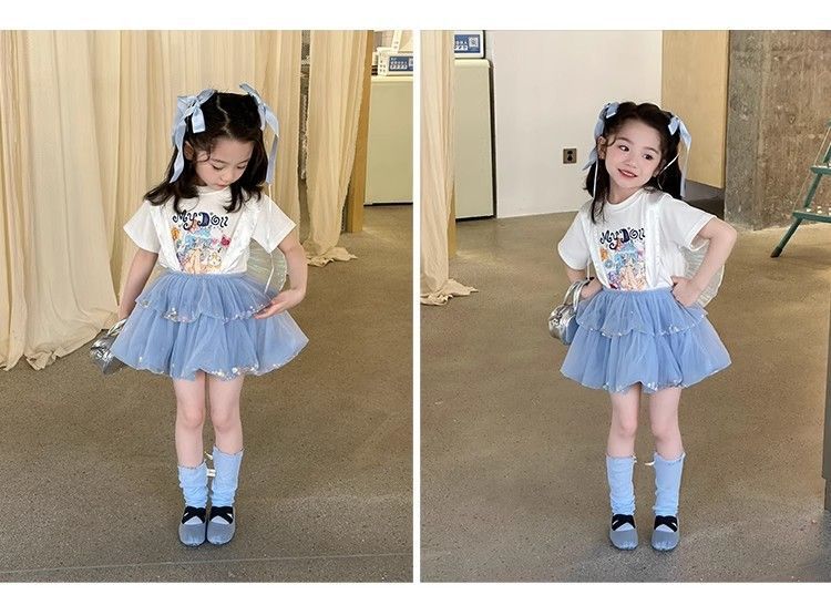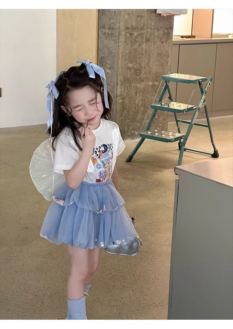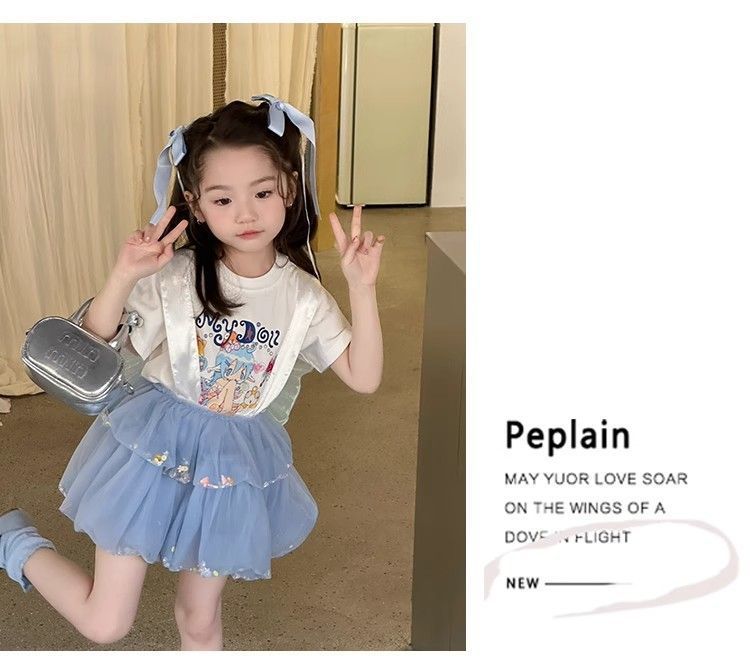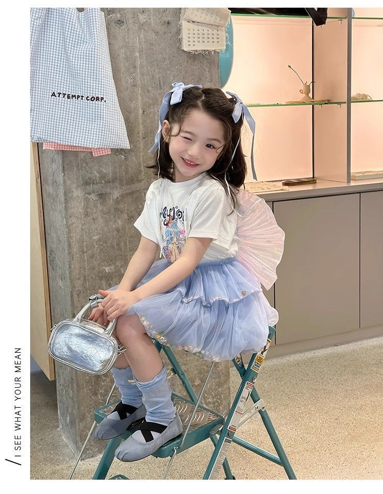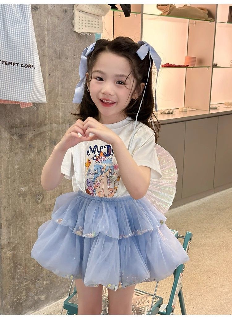 여자 정장 2025 새로운 여름 옷 아기 소녀 귀여운 인쇄 짧은 소매 달콤한 메쉬 레이스 스트랩 케이크 스커트스토어 가기