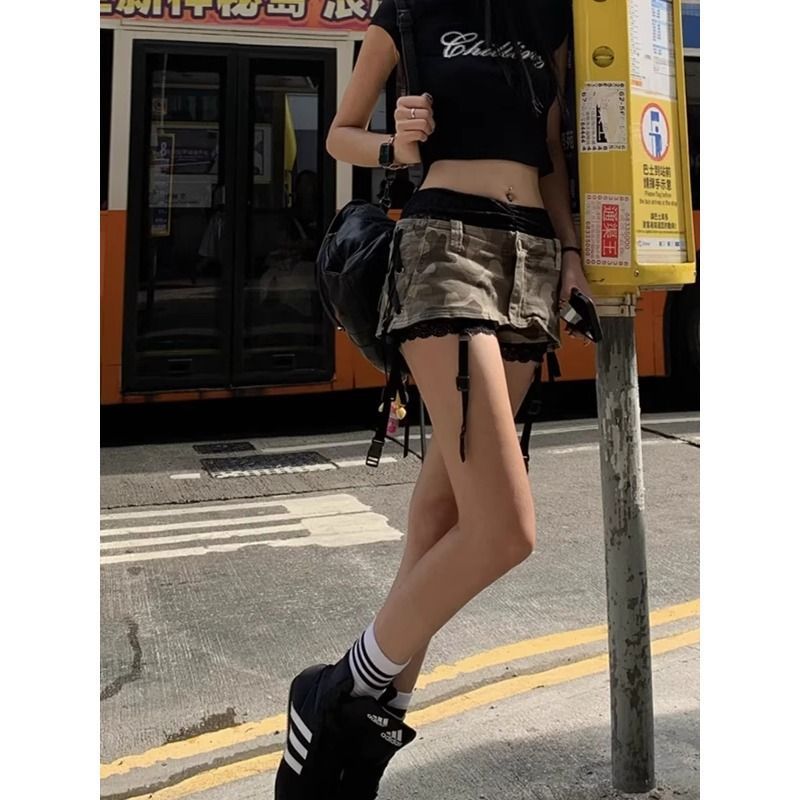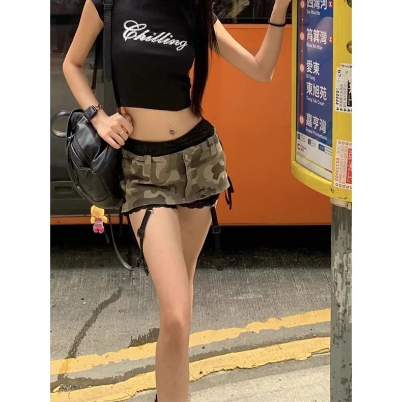 핫걸 스트랩 디자인 카모플라주 로우 웨이스트 데님 미니 스커트 여성용 새로운 노출 방지 엉덩이 커버 섹시한 나이트 클럽 스커트스토어 가기