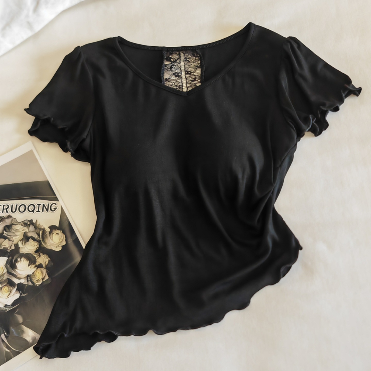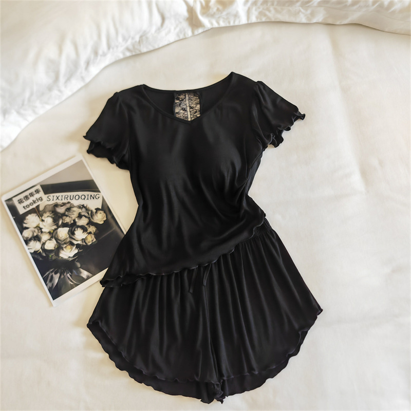 여성용 가슴 패드가있는 잠옷 여름 반팔 레이스 투피스 세트 봄, 가을 얇은 섹시한 순수한 욕망 스타일 모달 홈웨어