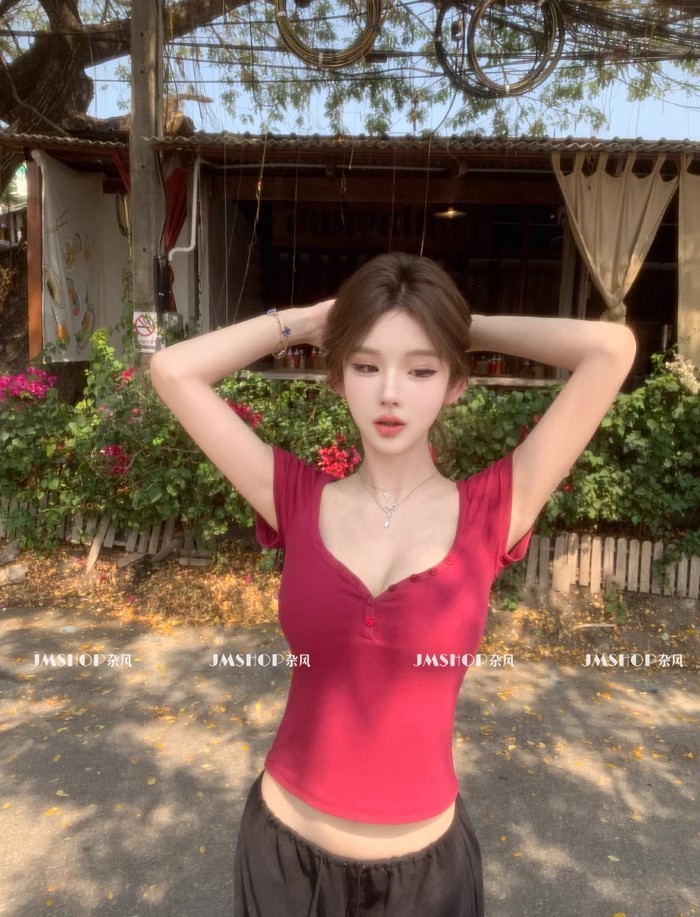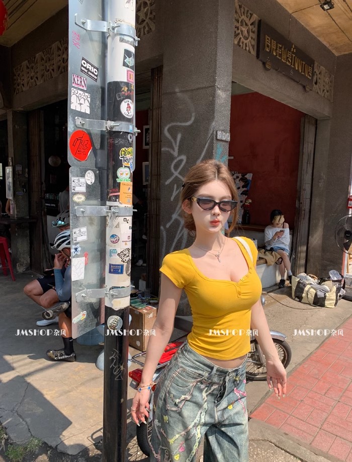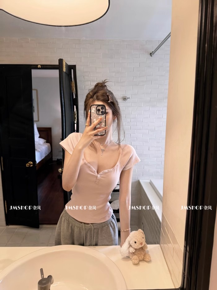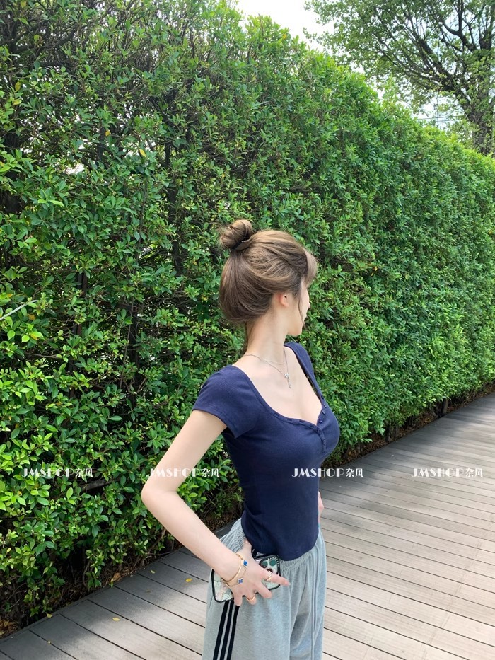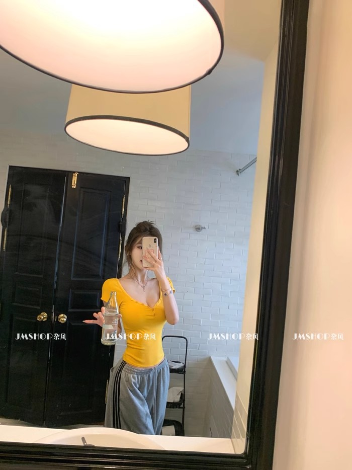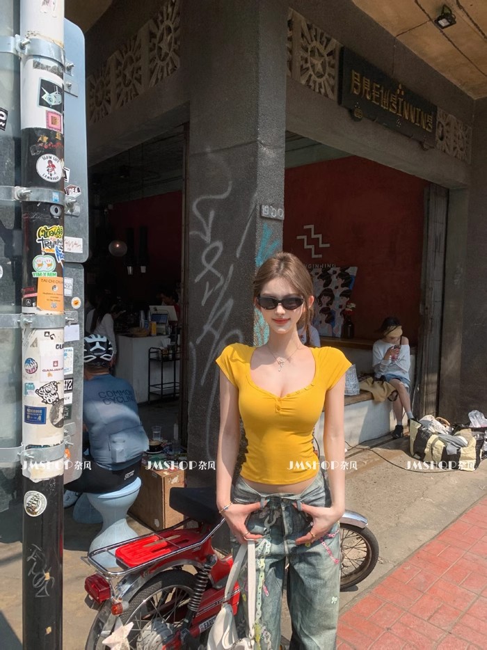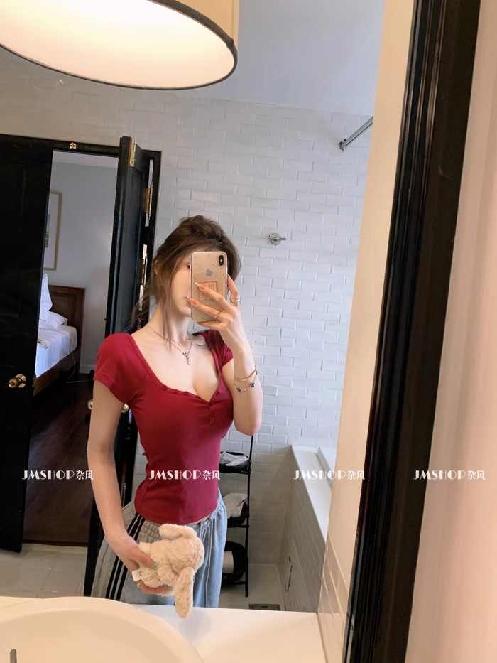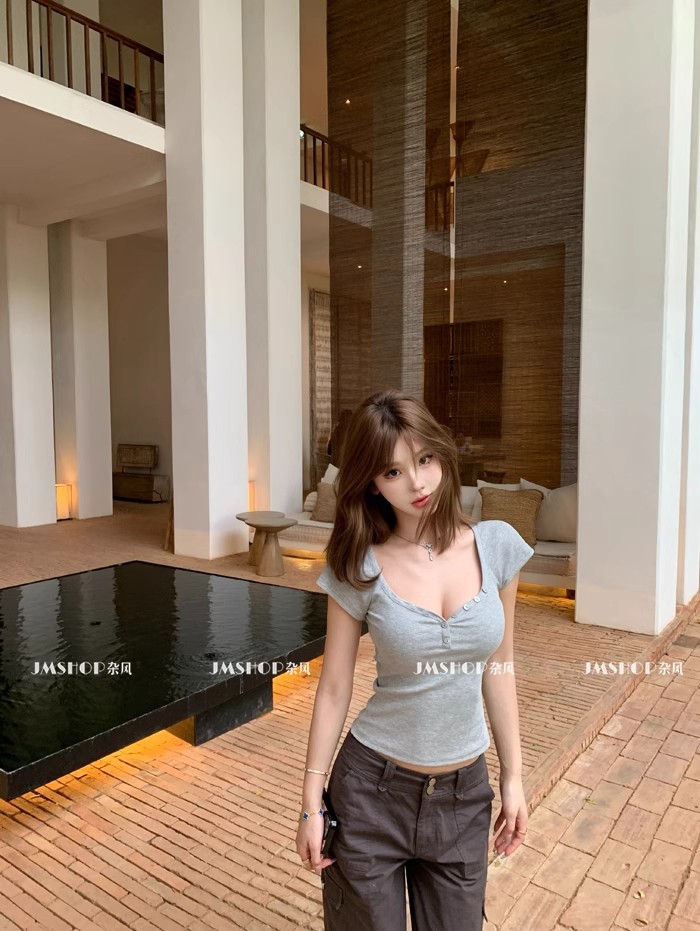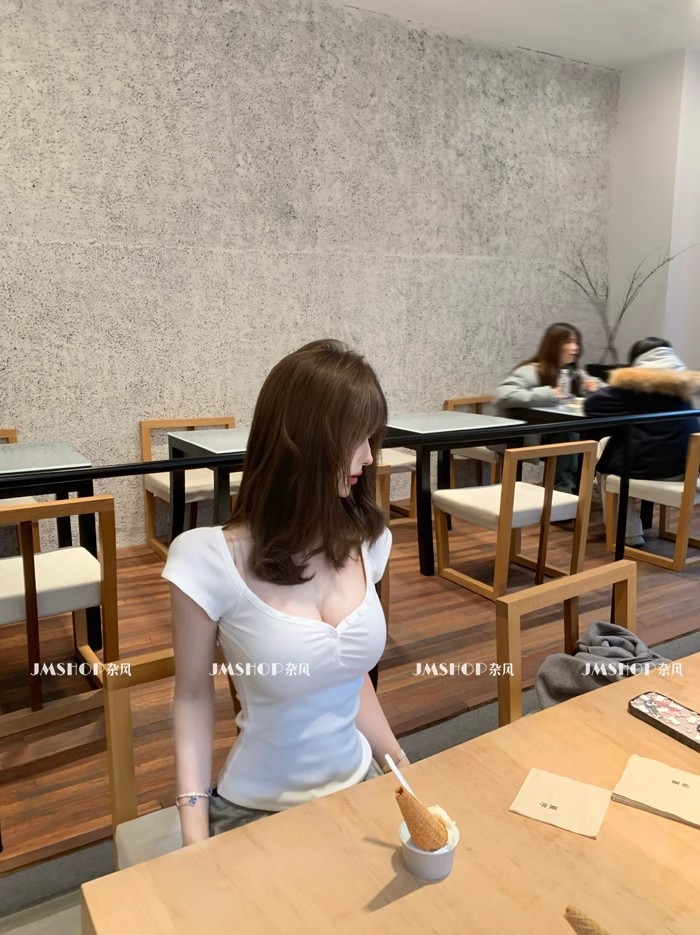 순수한 욕망 스타일 섹시한 뜨거운 소녀 로우 넥 V 넥 아름답고 독특하고 아름답고 세련된 여성용 여름 슬림 반팔 티셔츠스토어 가기