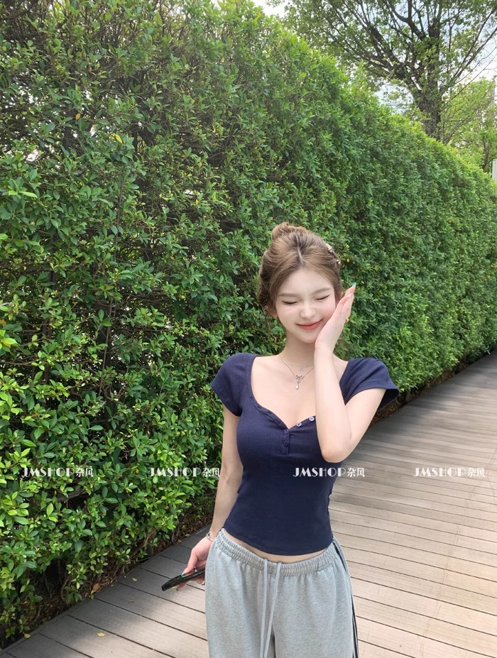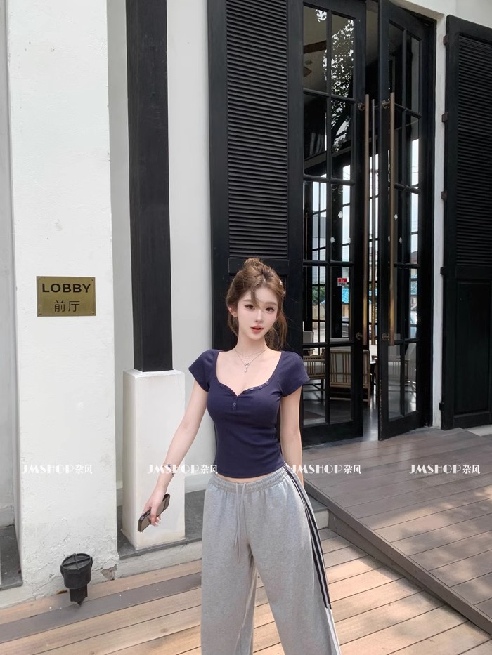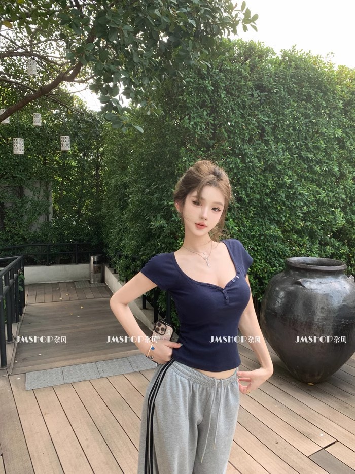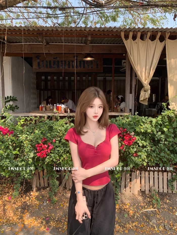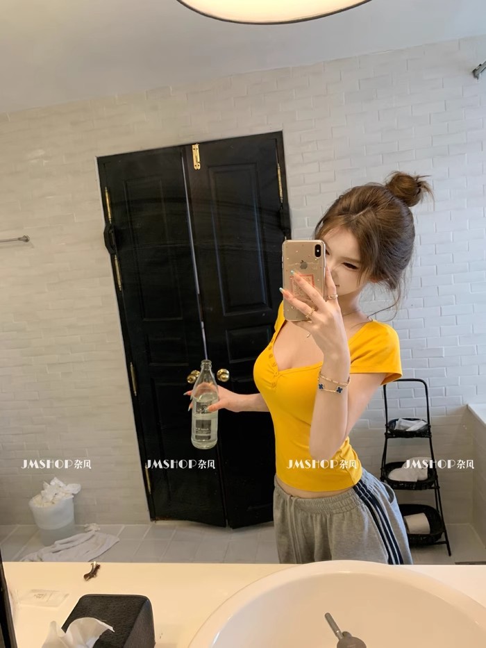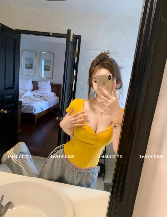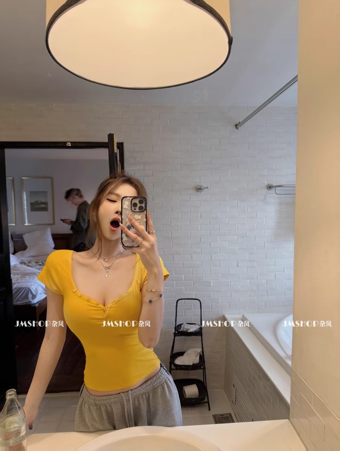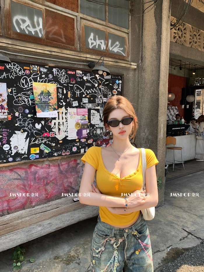 순수한 욕망 스타일 섹시한 뜨거운 소녀 로우 넥 V 넥 아름답고 독특하고 아름답고 세련된 여성용 여름 슬림 반팔 티셔츠스토어 가기
