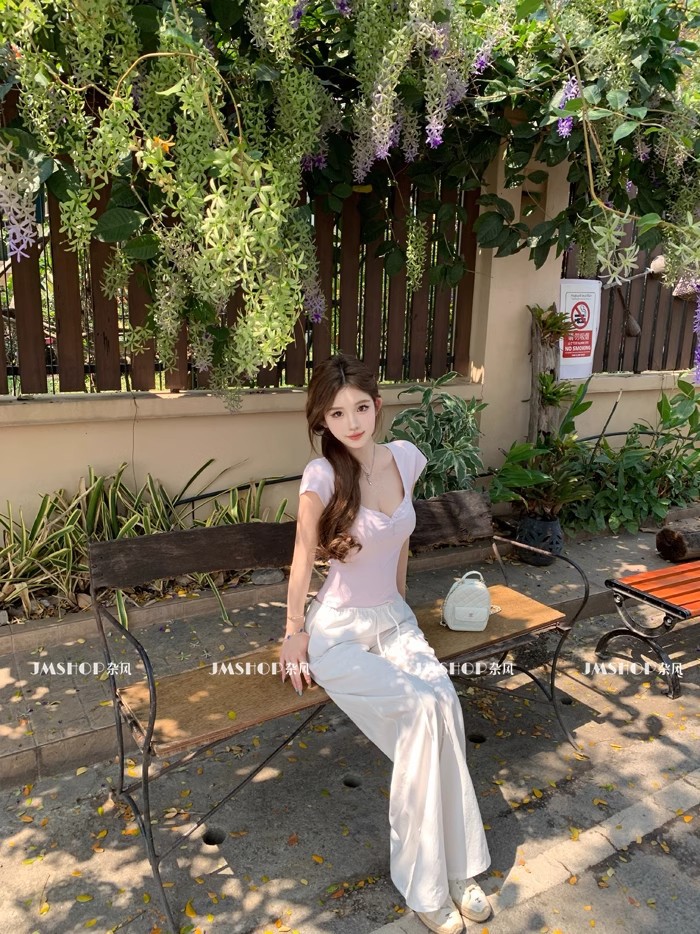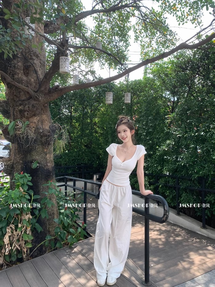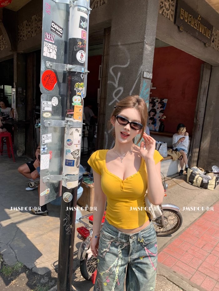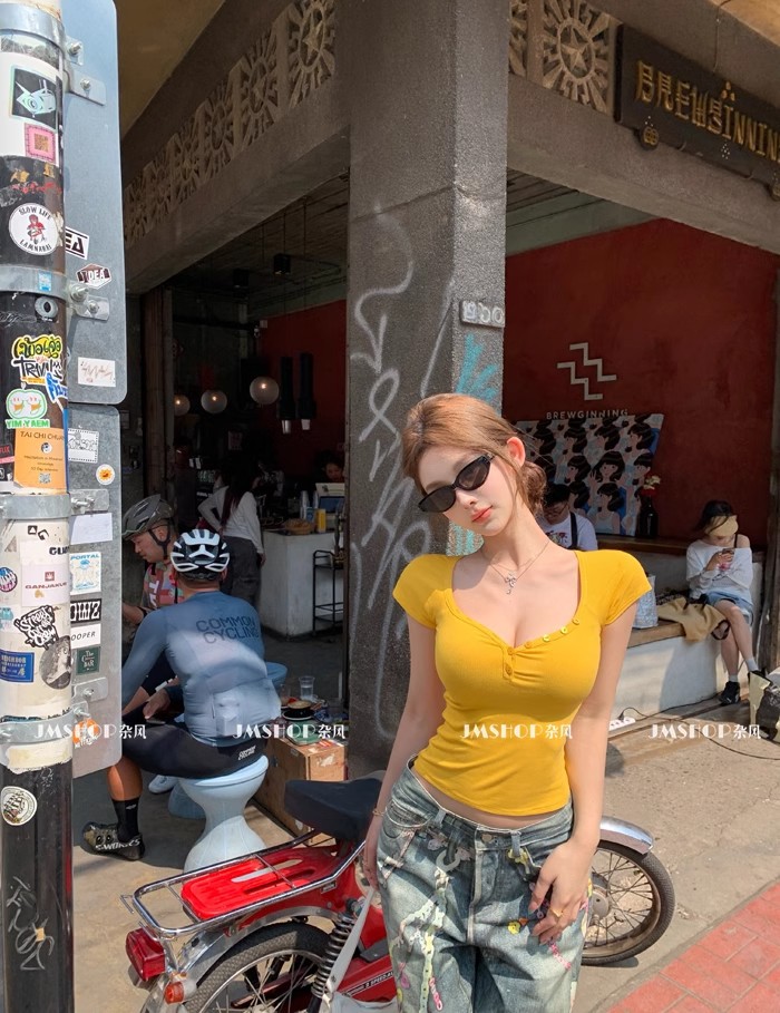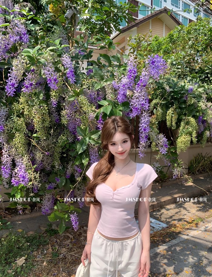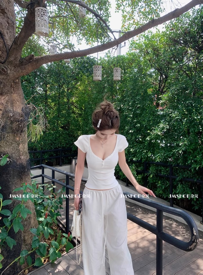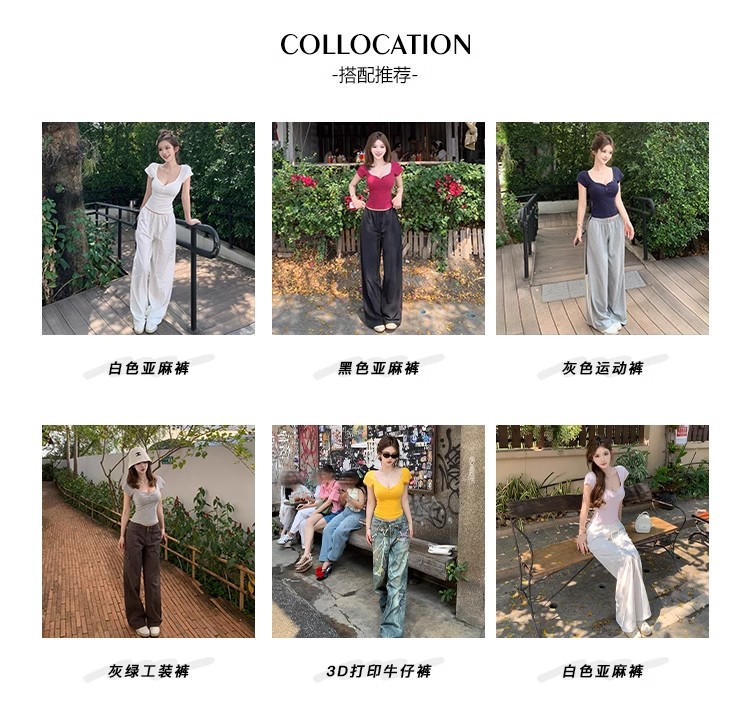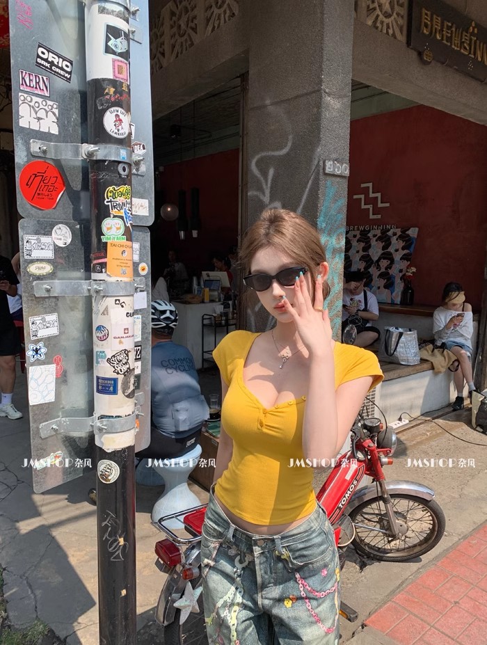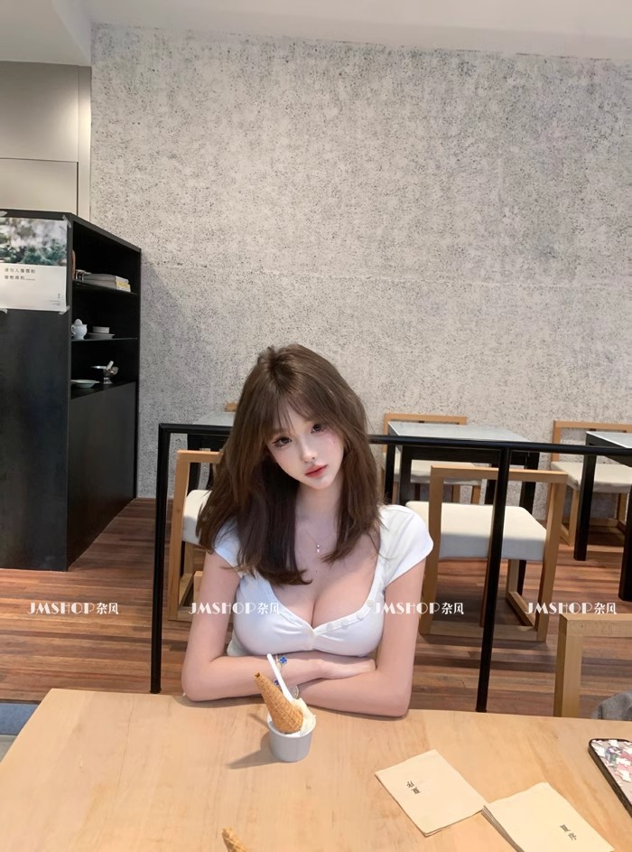 순수한 욕망 스타일 섹시한 뜨거운 소녀 로우 넥 V 넥 아름답고 독특하고 아름답고 세련된 여성용 여름 슬림 반팔 티셔츠스토어 가기