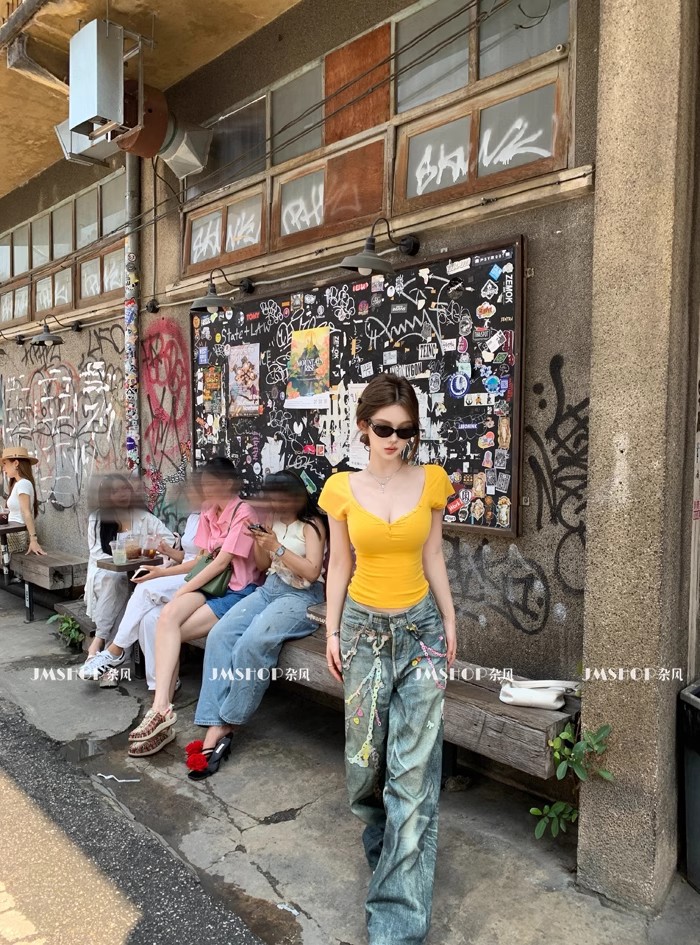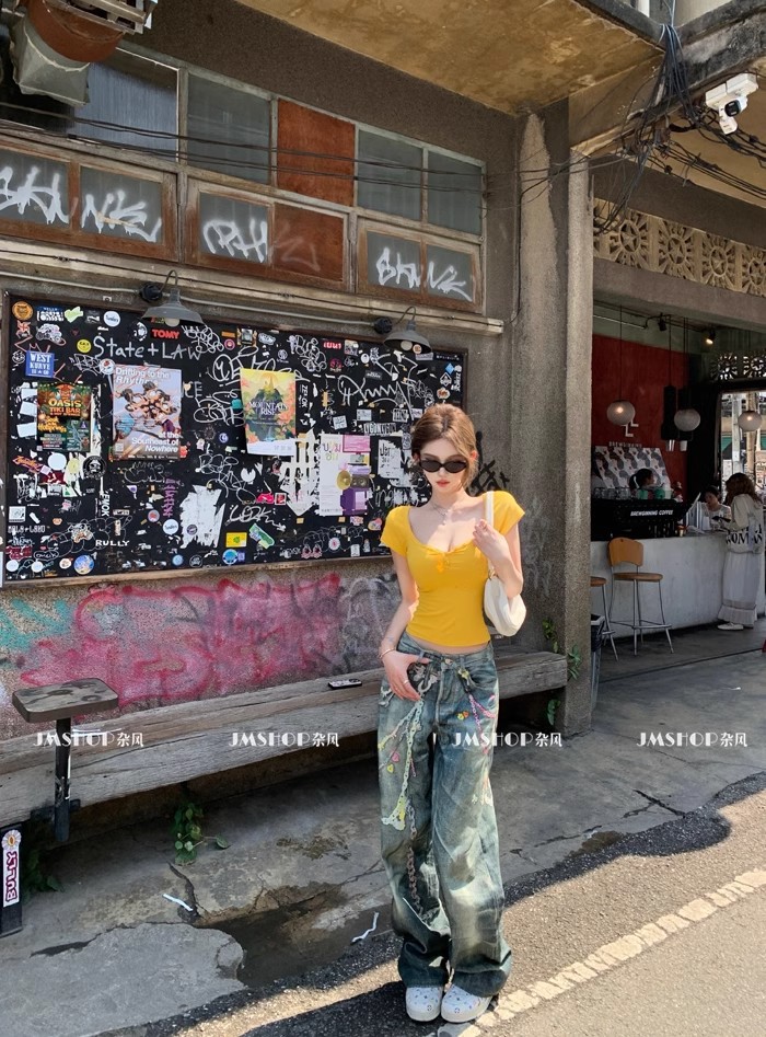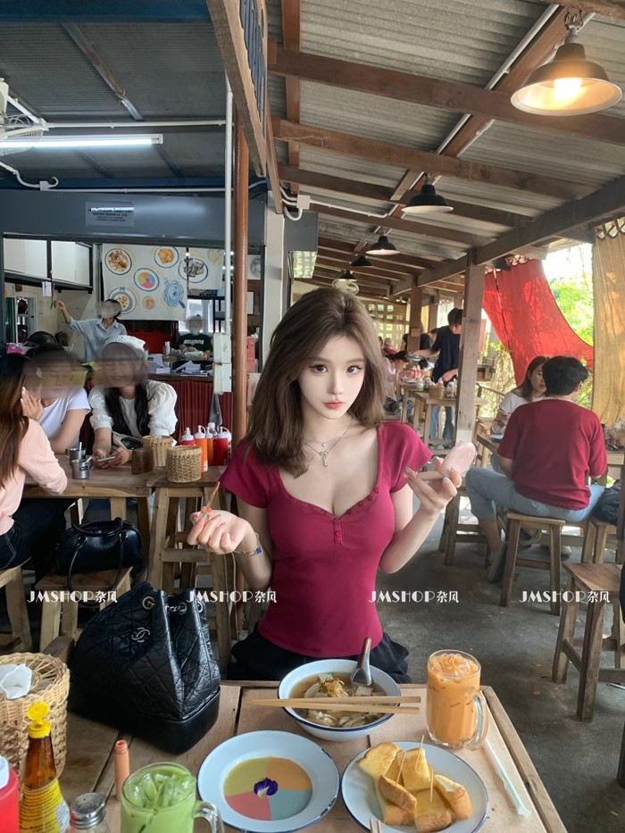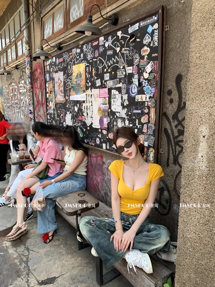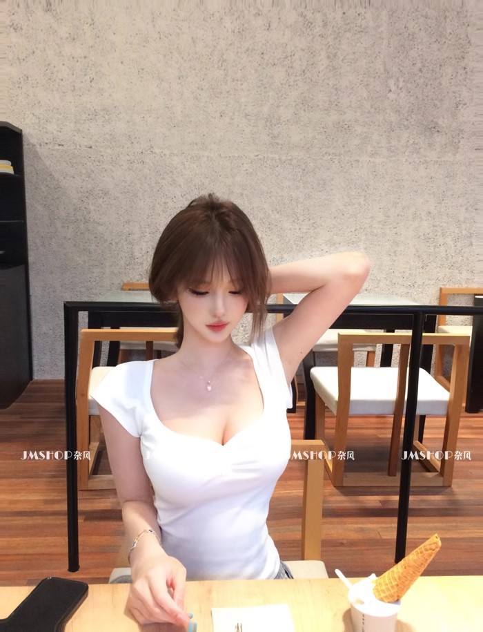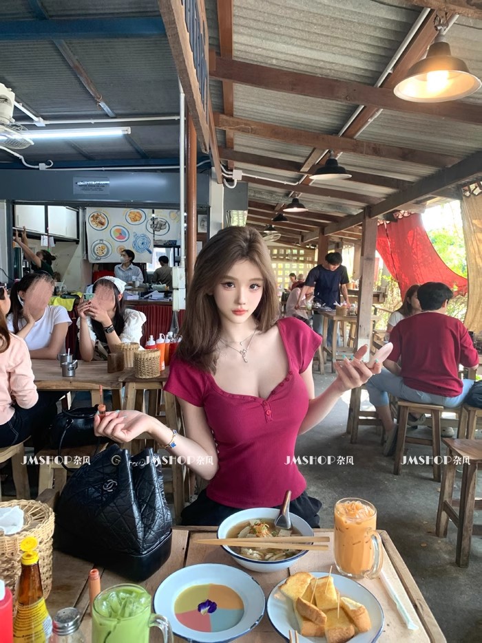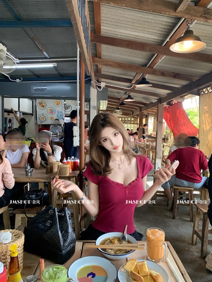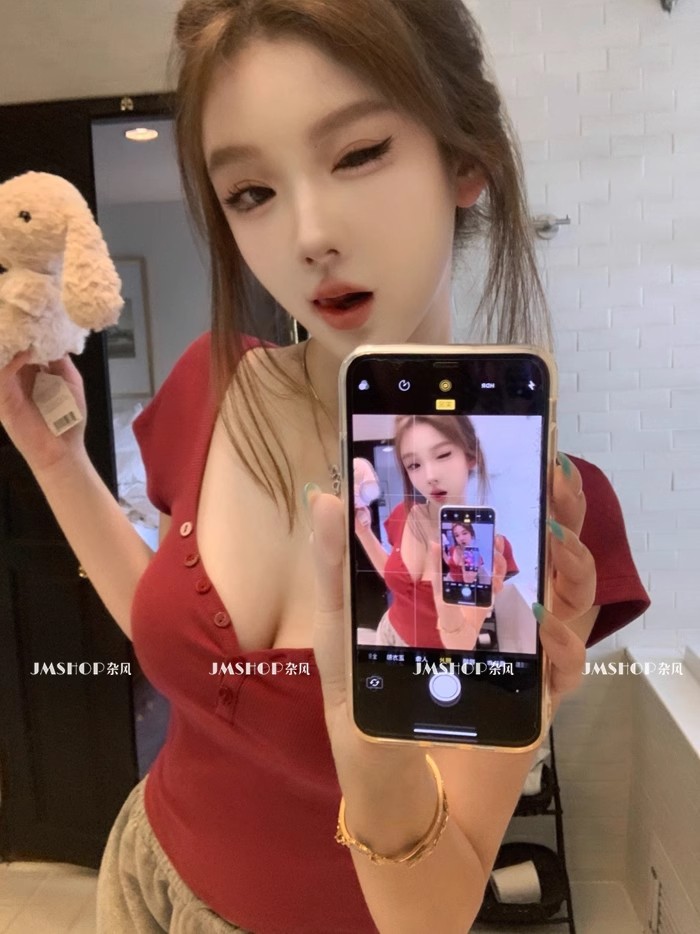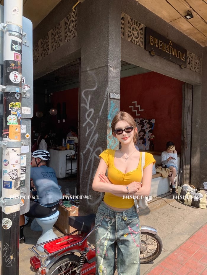 순수한 욕망 스타일 섹시한 뜨거운 소녀 로우 넥 V 넥 아름답고 독특하고 아름답고 세련된 여성용 여름 슬림 반팔 티셔츠스토어 가기