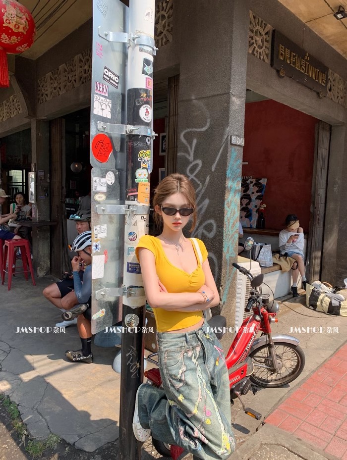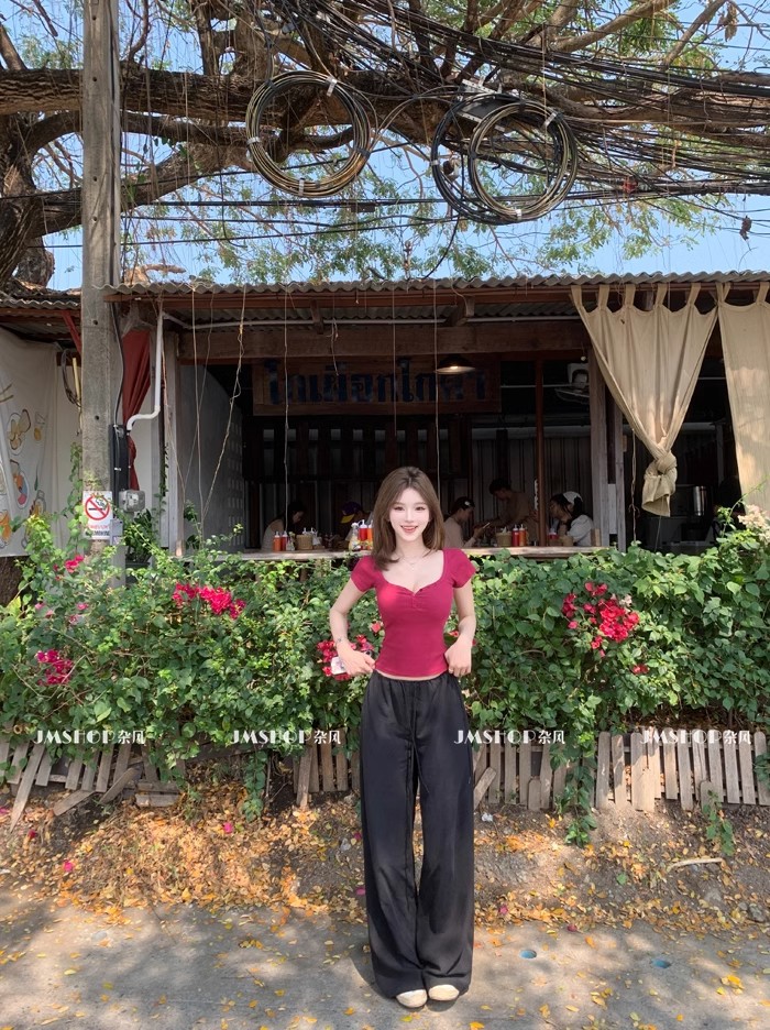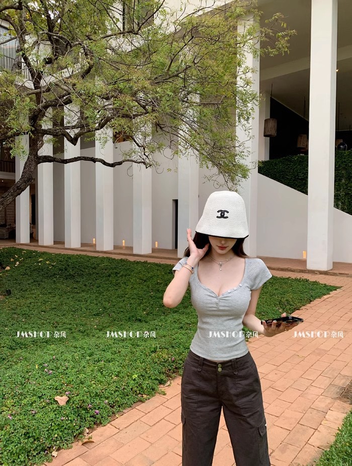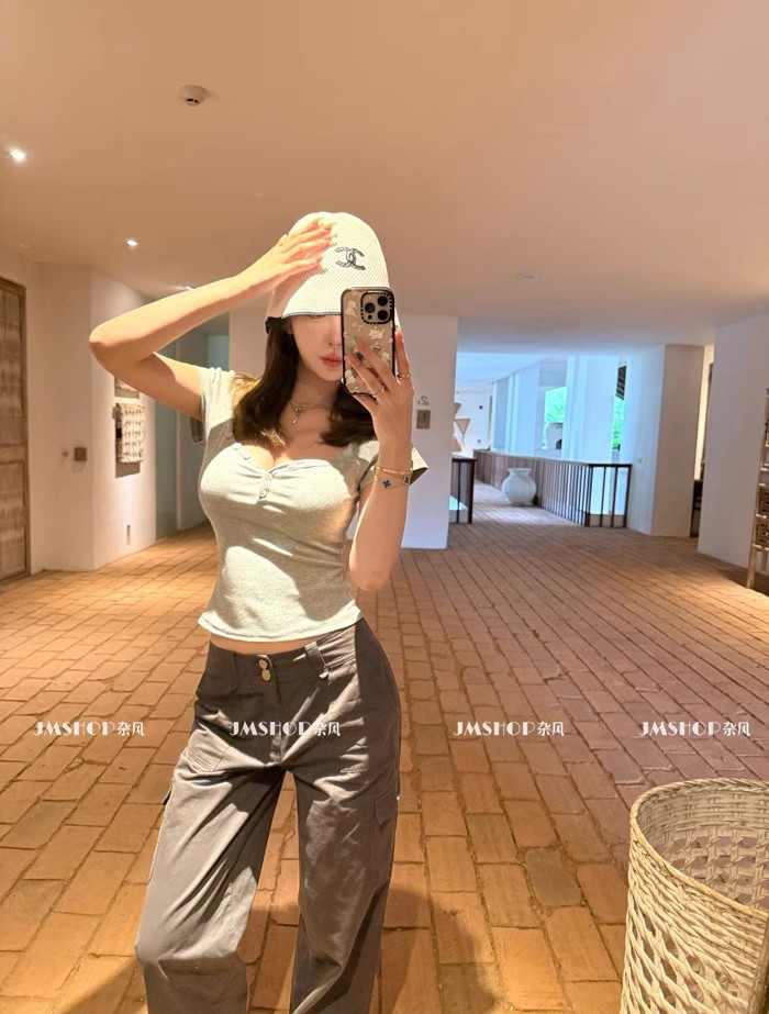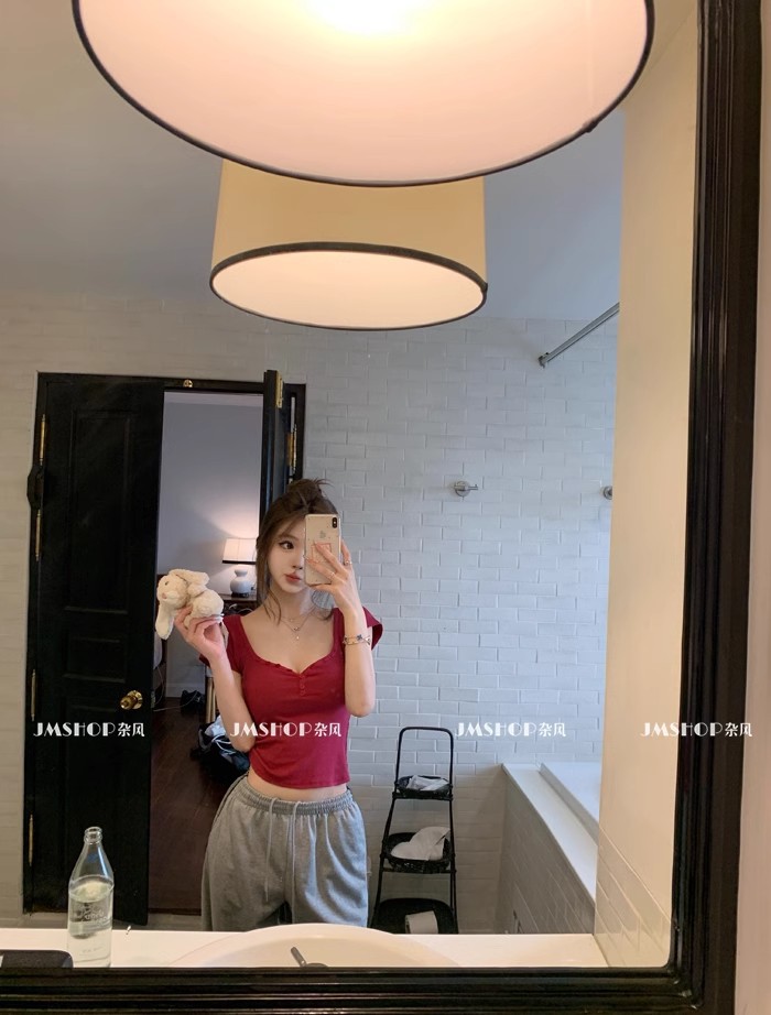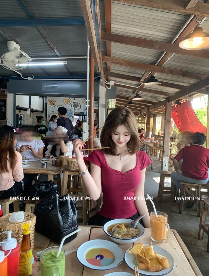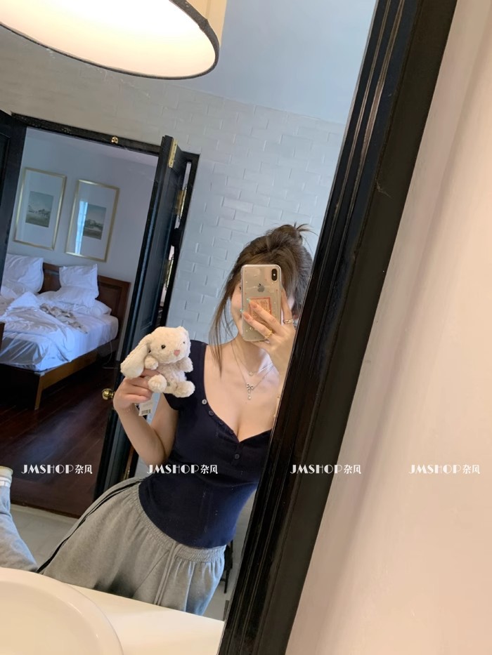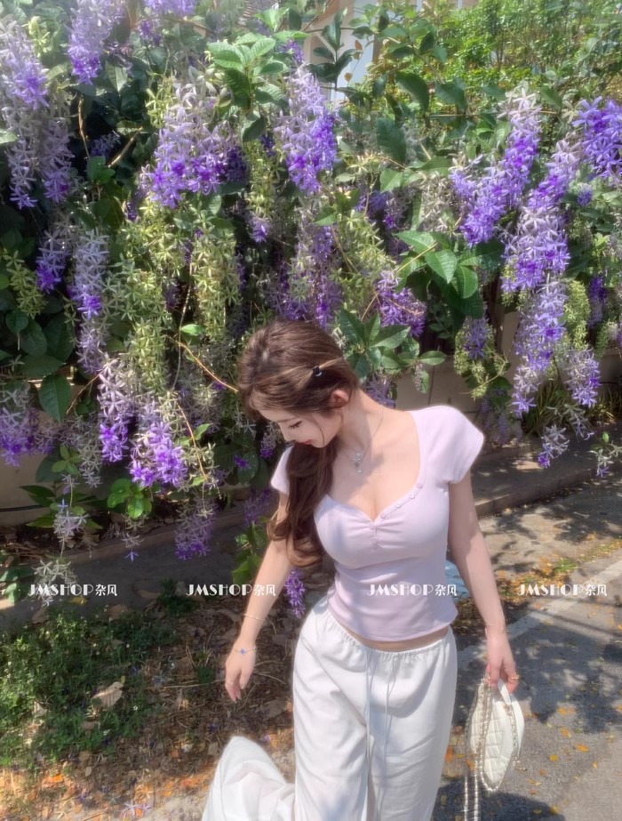 순수한 욕망 스타일 섹시한 뜨거운 소녀 로우 넥 V 넥 아름답고 독특하고 아름답고 세련된 여성용 여름 슬림 반팔 티셔츠스토어 가기