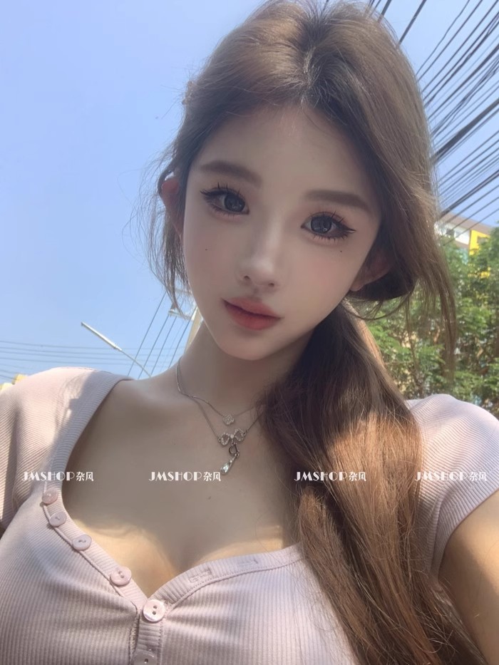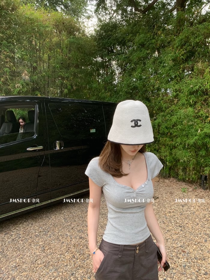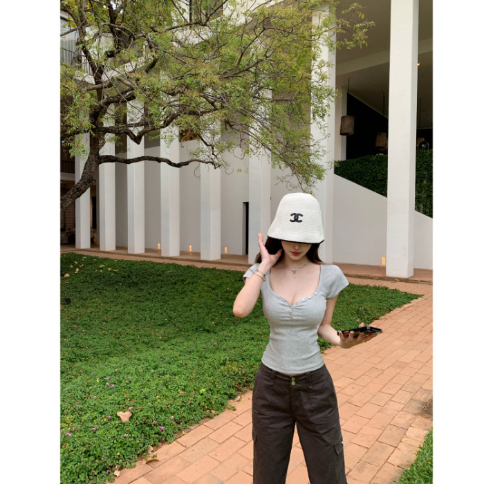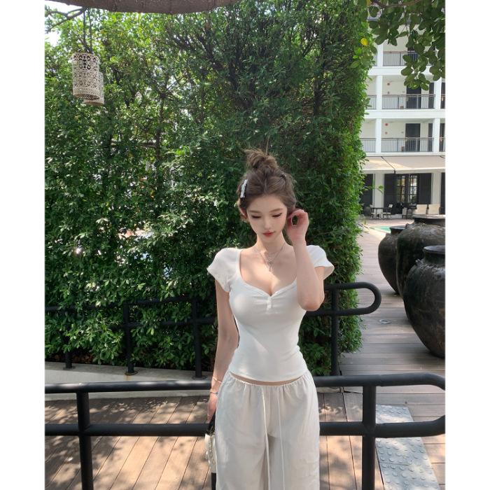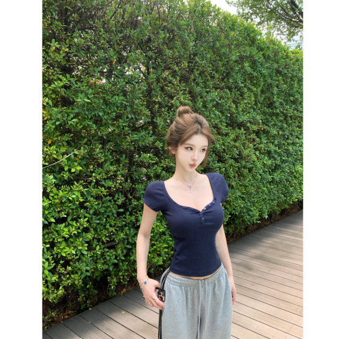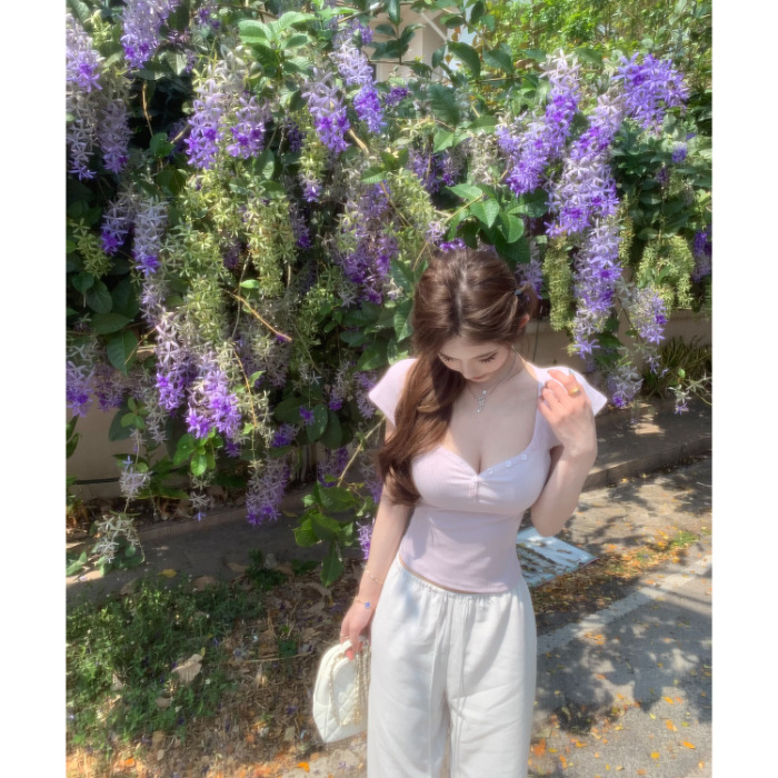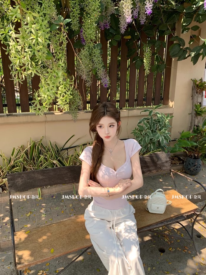 순수한 욕망 스타일 섹시한 뜨거운 소녀 로우 넥 V 넥 아름답고 독특하고 아름답고 세련된 여성용 여름 슬림 반팔 티셔츠