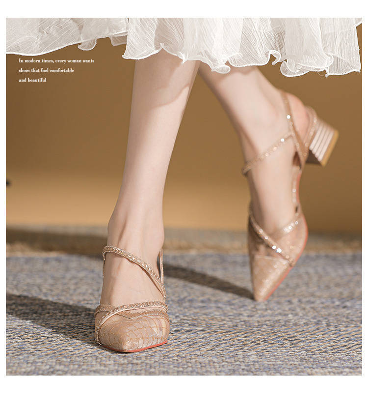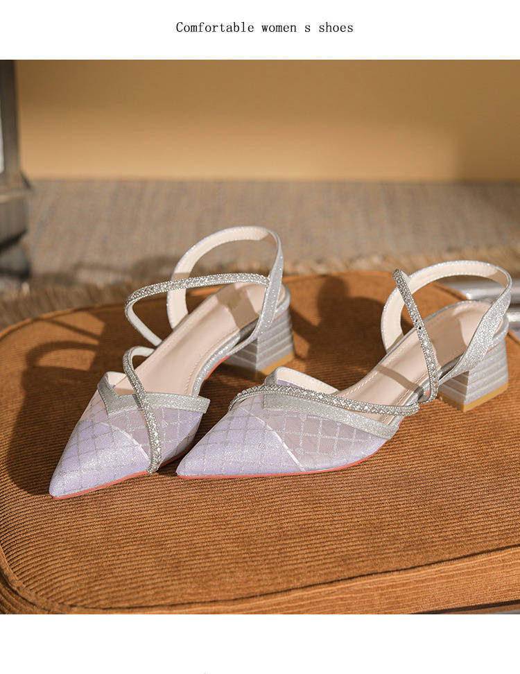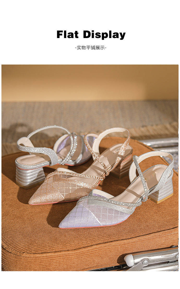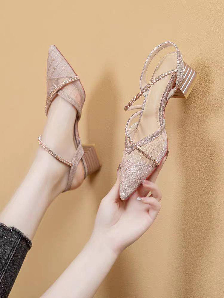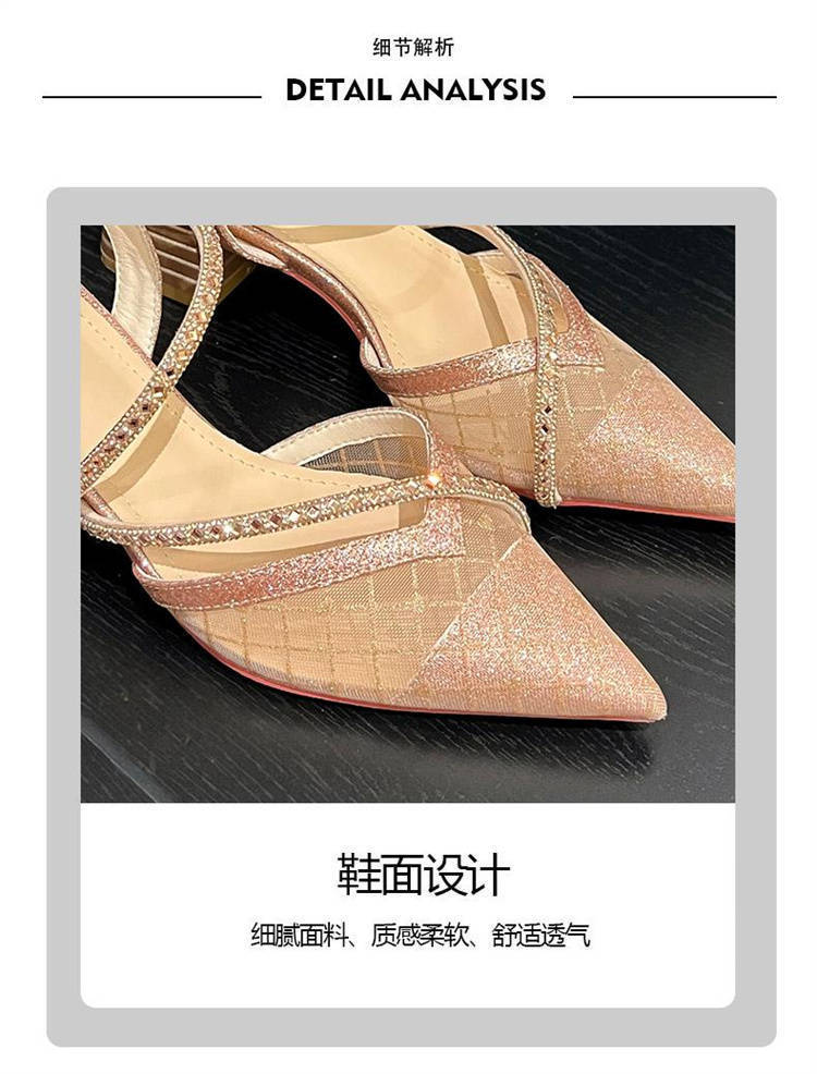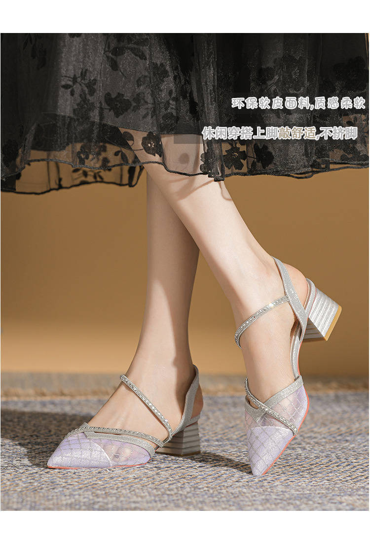 여성을위한 메쉬 두꺼운 굽 라인 석 하이힐 프렌치 로우 힐 포인티드 토 신발 2025 여름 신작 Baotou 원 스트랩 샌들