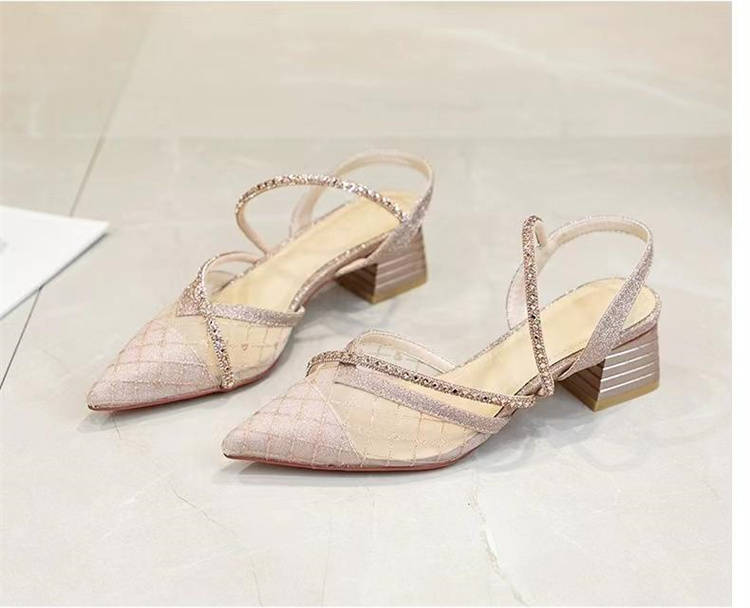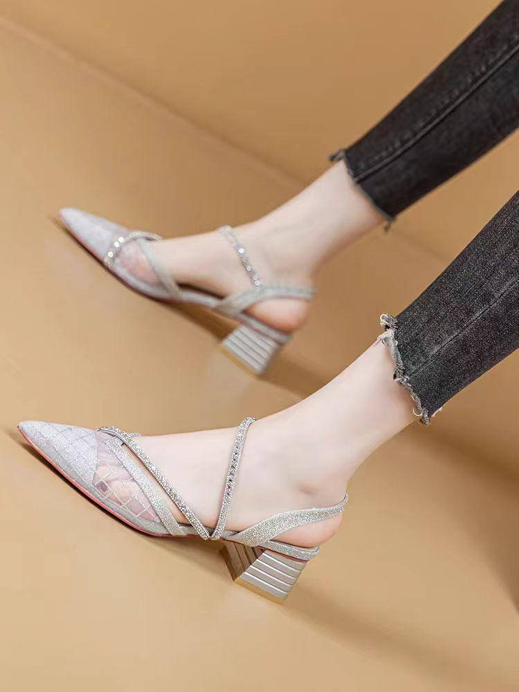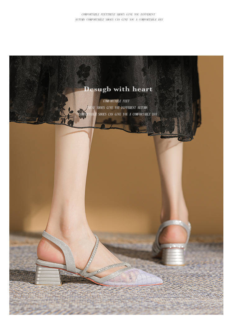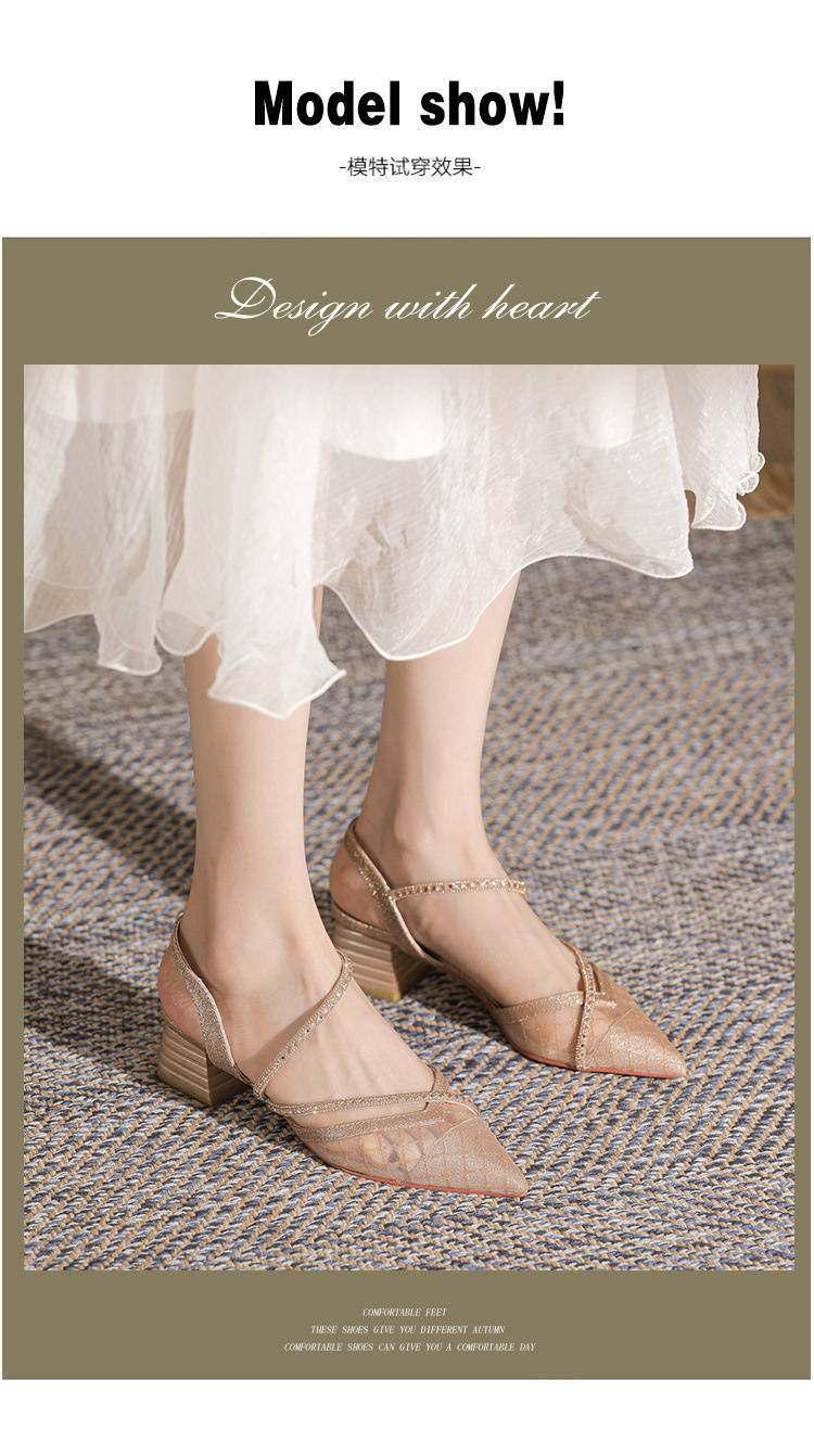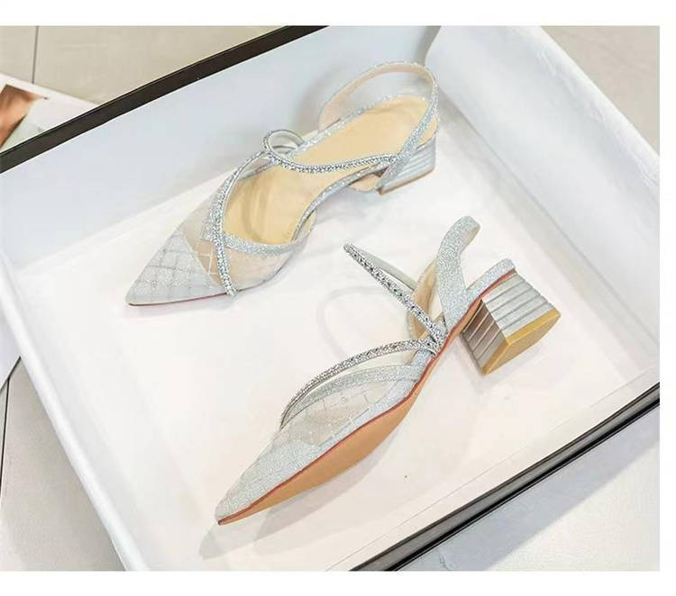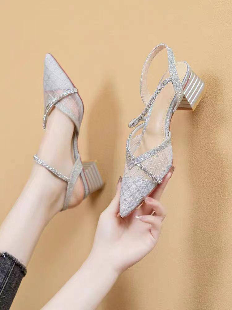 여성을위한 메쉬 두꺼운 굽 라인 석 하이힐 프렌치 로우 힐 포인티드 토 신발 2025 여름 신작 Baotou 원 스트랩 샌들