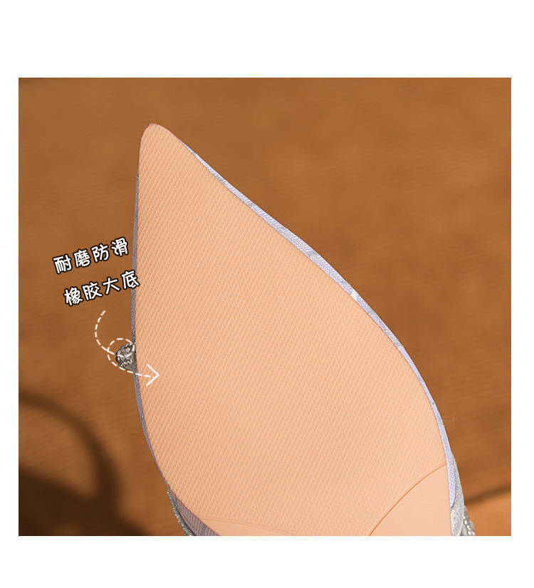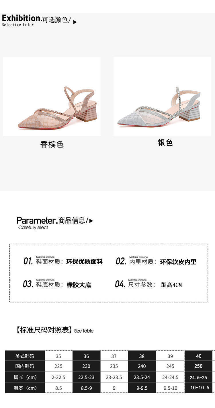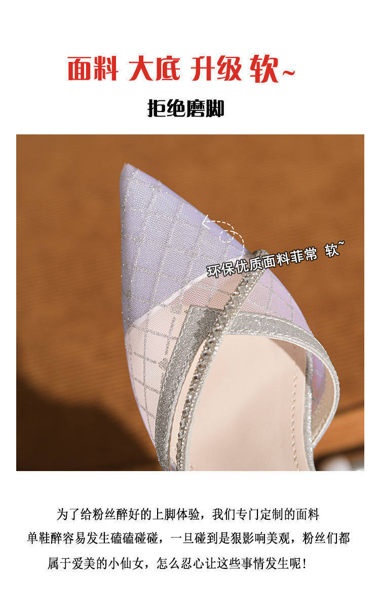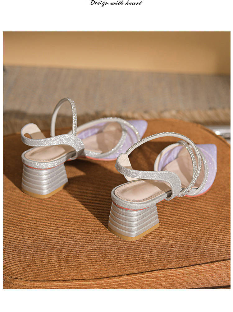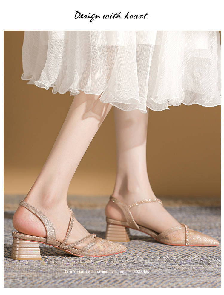 여성을위한 메쉬 두꺼운 굽 라인 석 하이힐 프렌치 로우 힐 포인티드 토 신발 2025 여름 신작 Baotou 원 스트랩 샌들