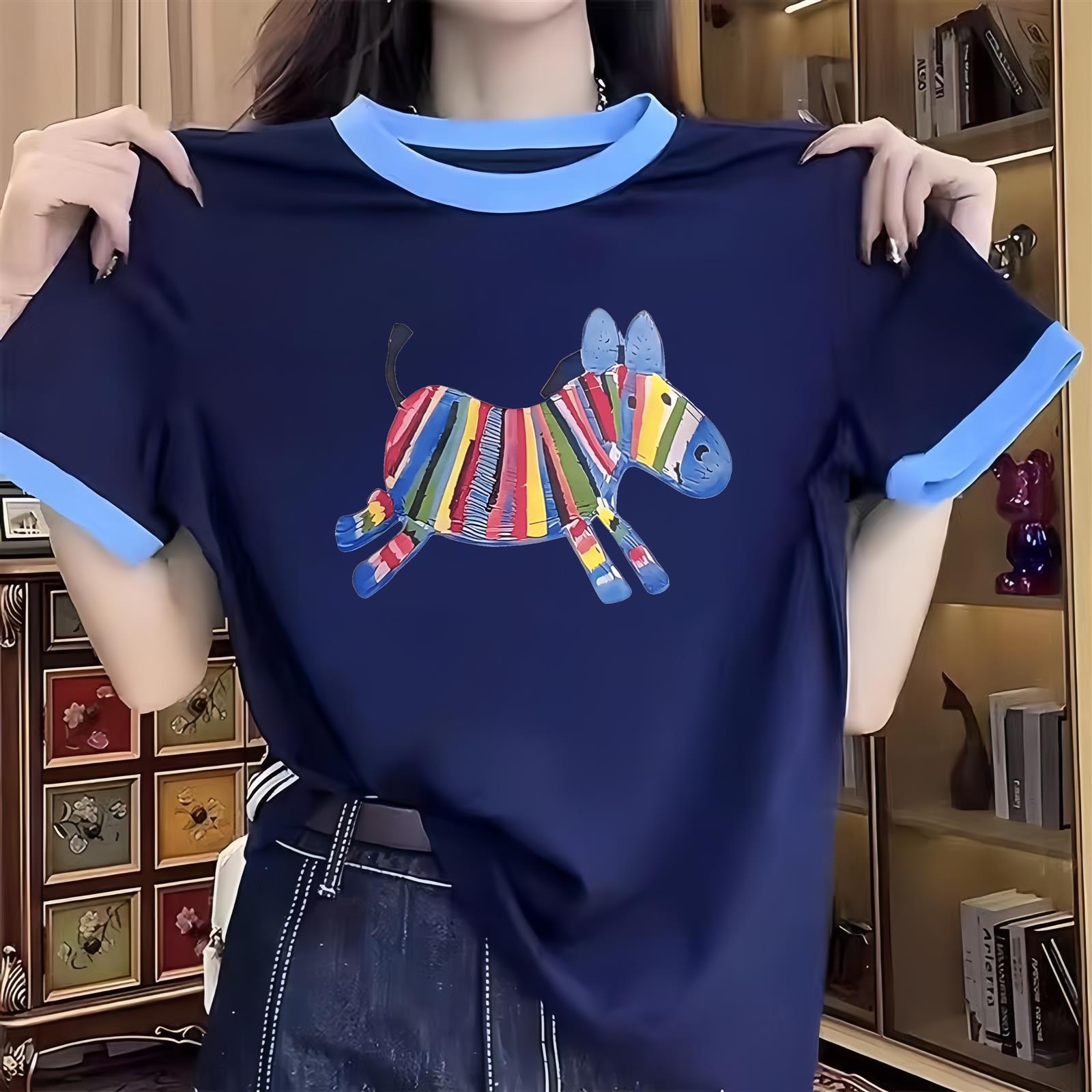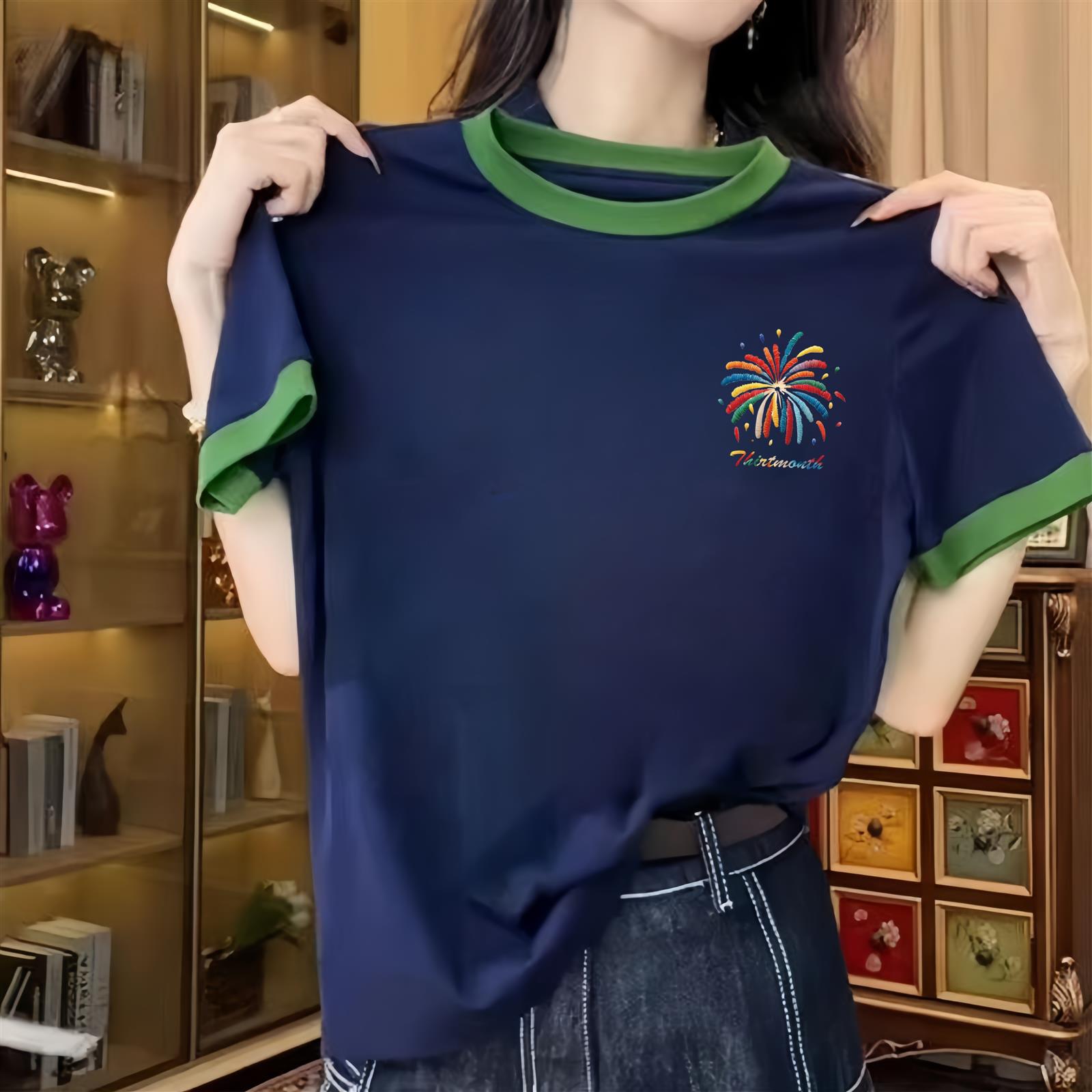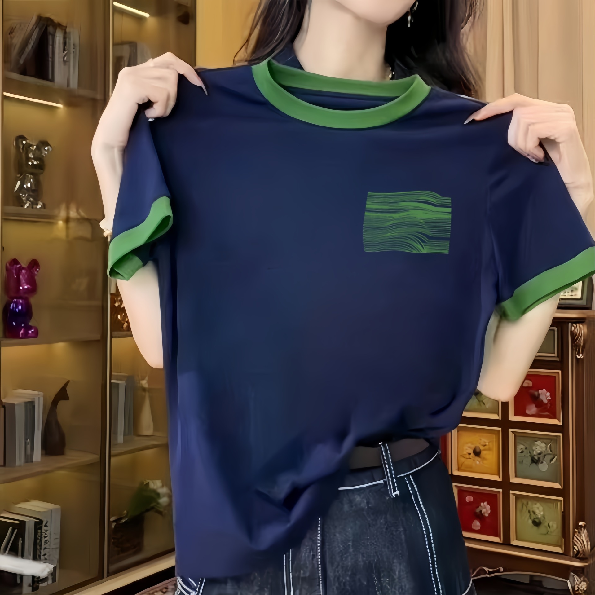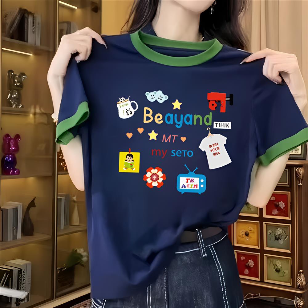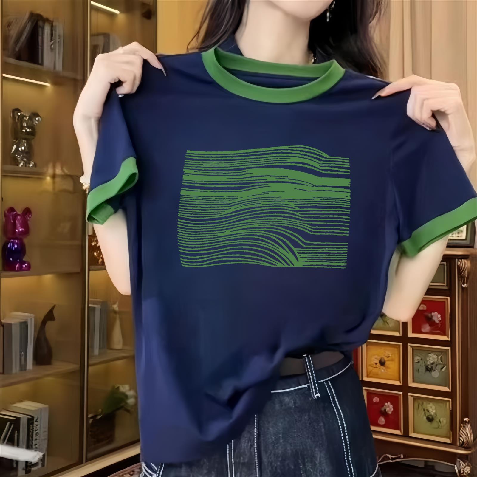 여성을 위한 순면 오른쪽 어깨 슬리밍 대비 색상 반팔 티셔츠 2025 새로운 핫 스타일 서양식 프린트 패션 다용도 탑 의류스토어 가기