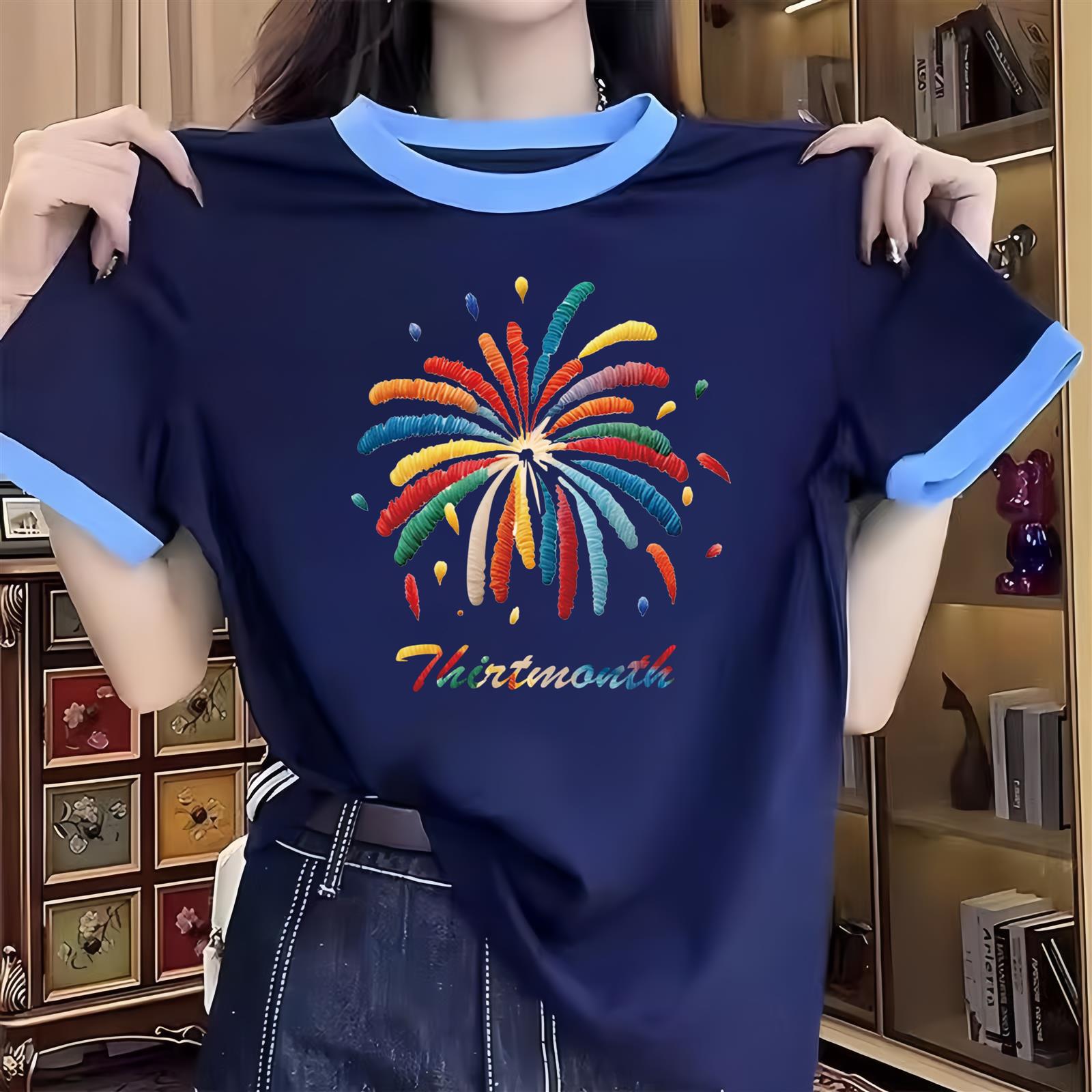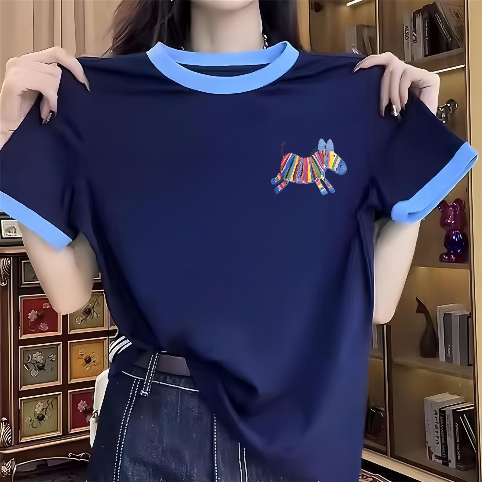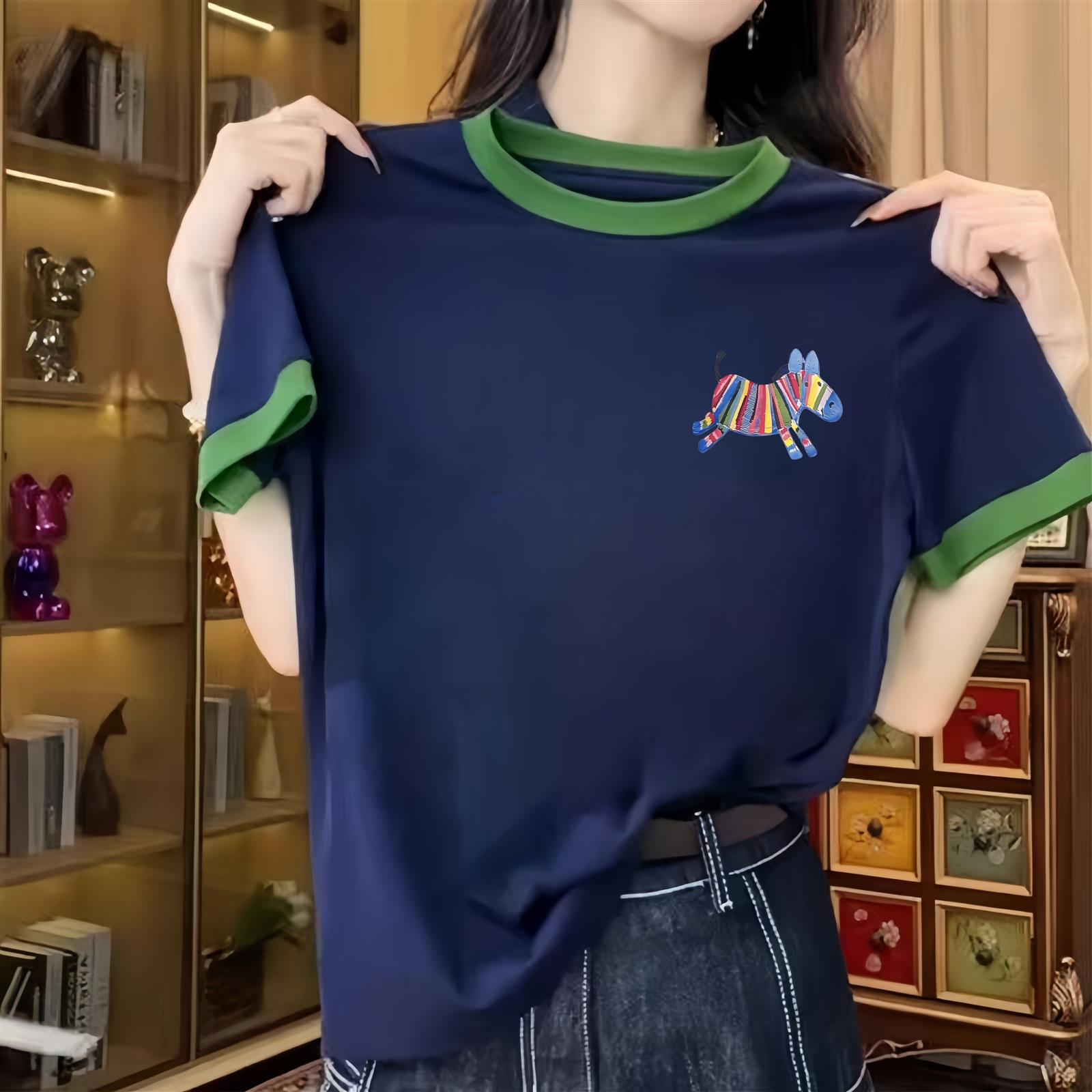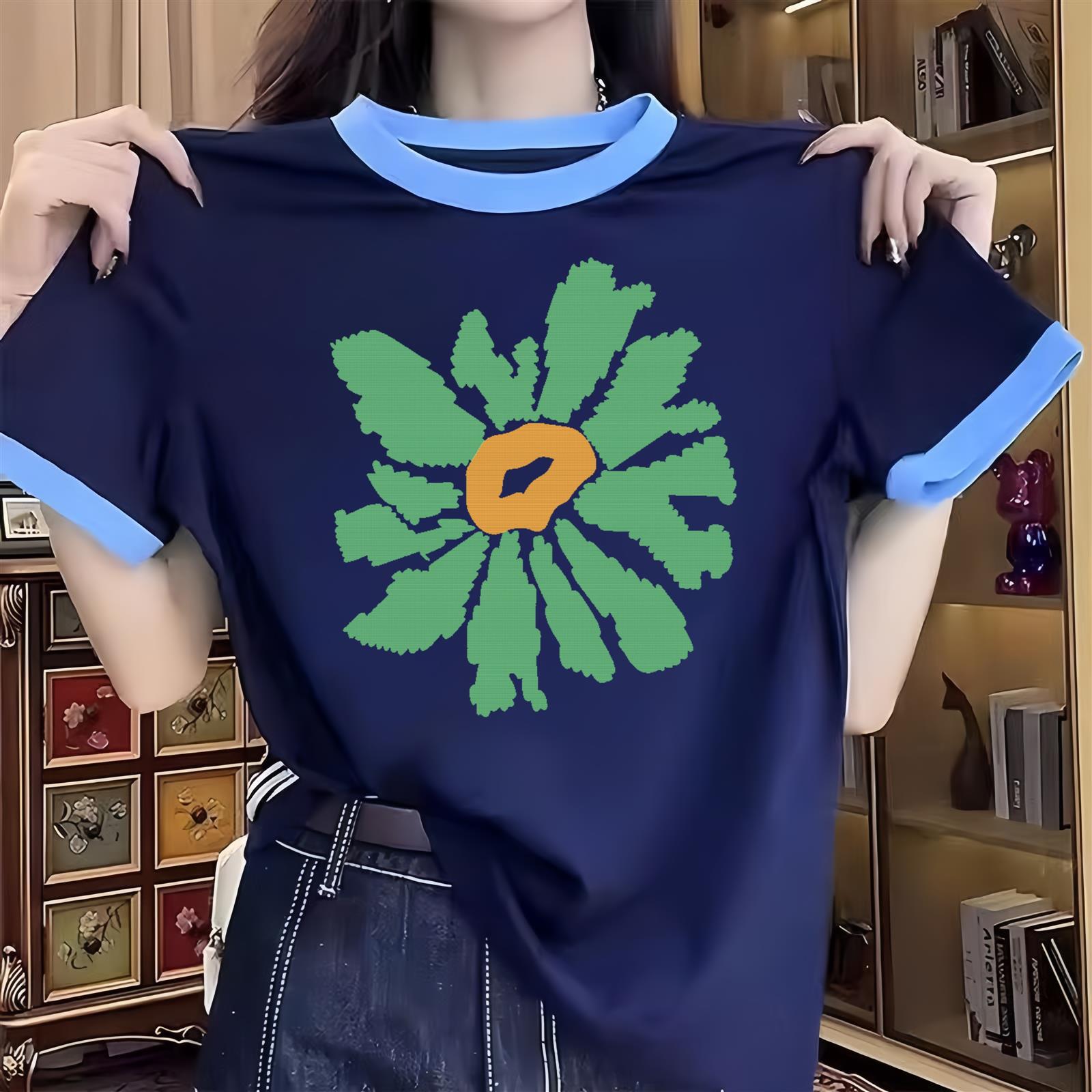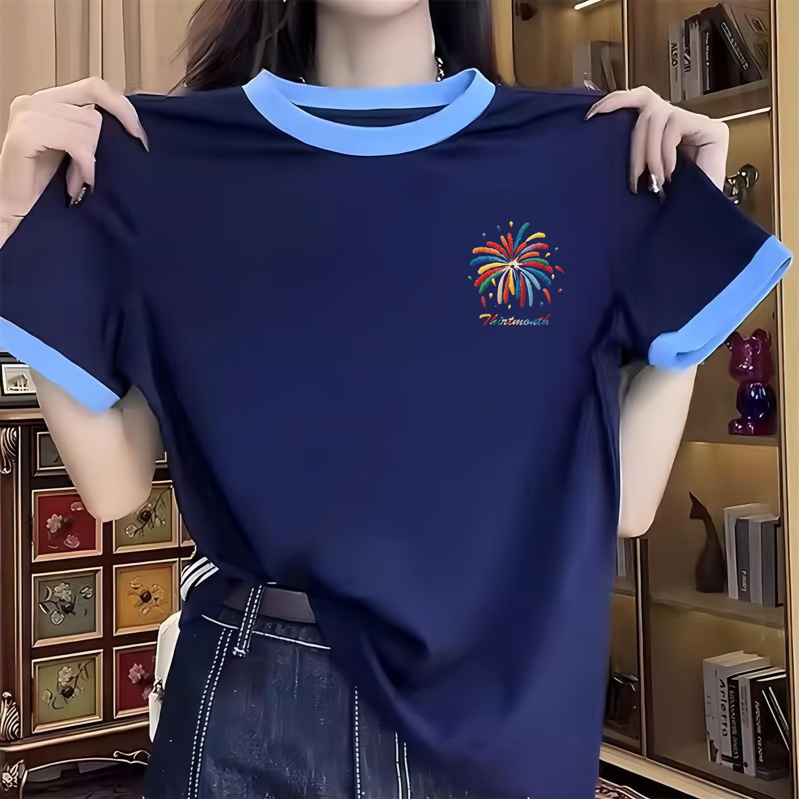 여성을 위한 순면 오른쪽 어깨 슬리밍 대비 색상 반팔 티셔츠 2025 새로운 핫 스타일 서양식 프린트 패션 다용도 탑 의류스토어 가기