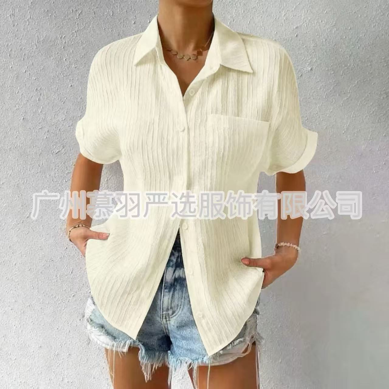 카디건 의류 2023 스플 라이스 포켓 반팔 솔리드 컬러 캐주얼 라펠 라글란 슬리브 셔츠 반팔 여성 의류스토어 가기