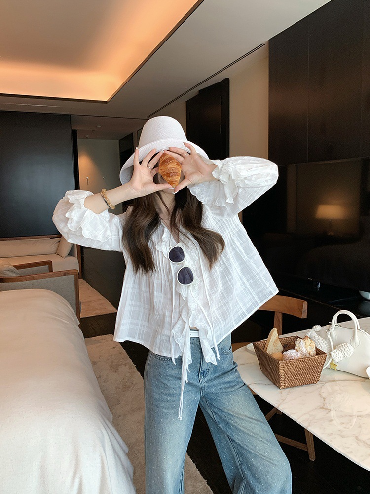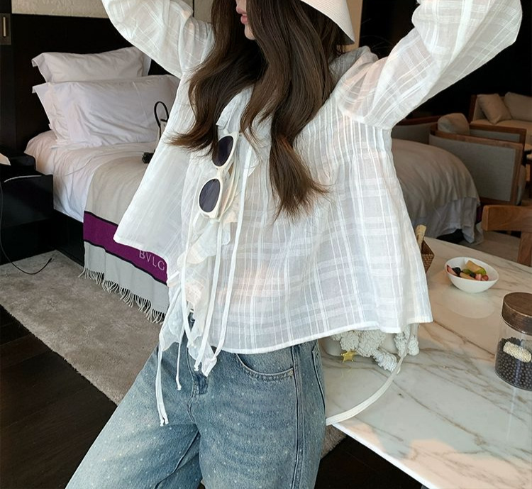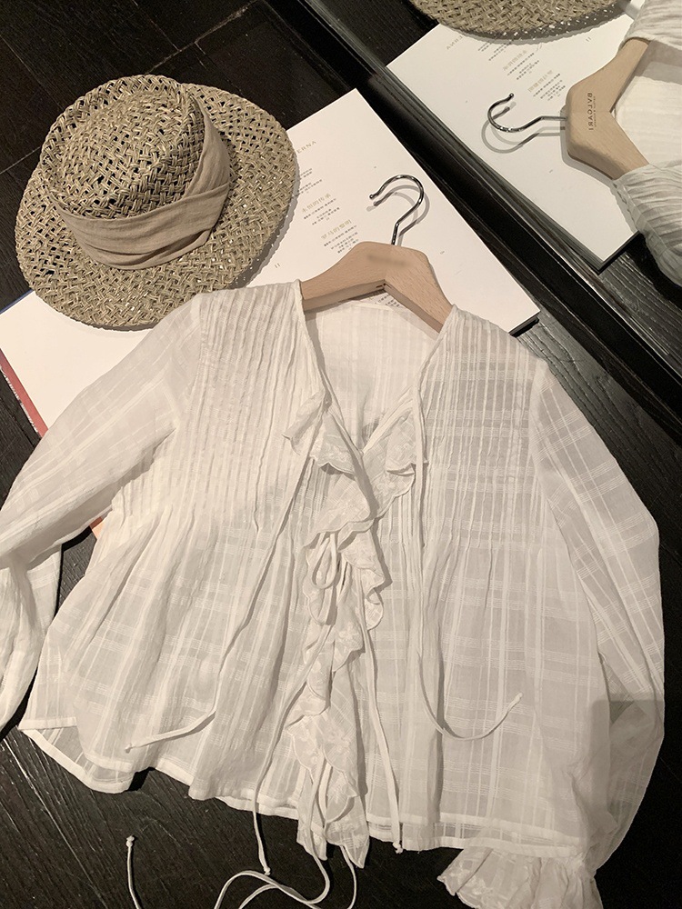 세나홀리데이* 러플자수셔츠 여성 여름 얇은 자외선 차단 에어컨 셔츠 짧은 흰색 셔츠