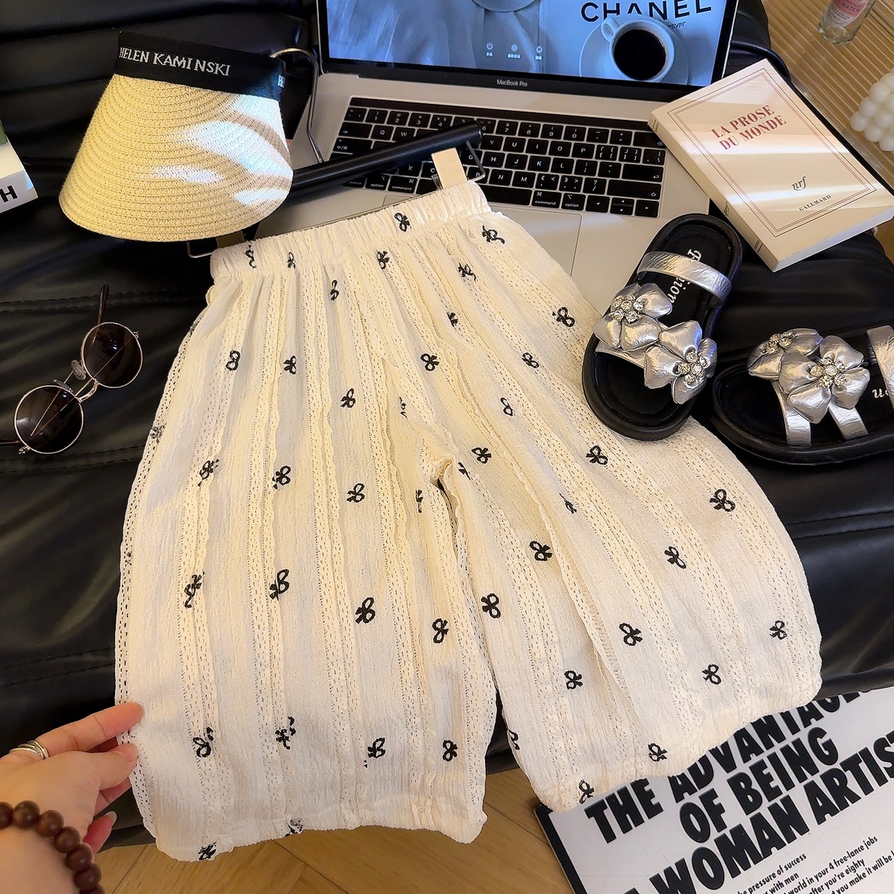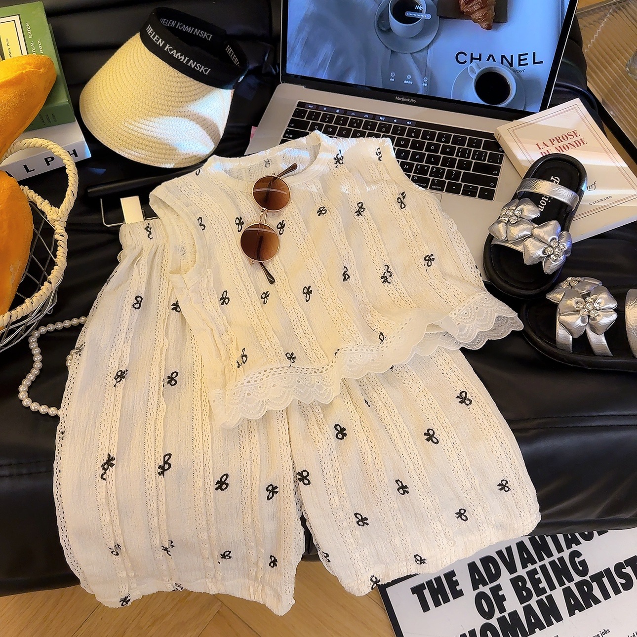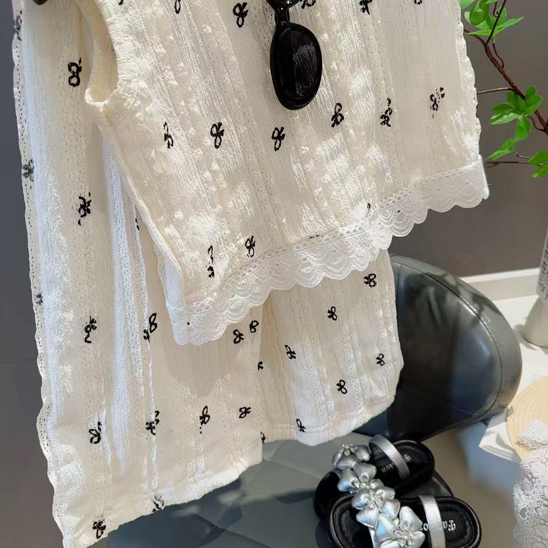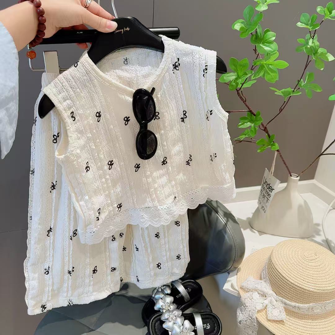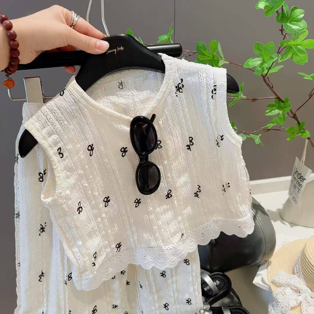 여름 신작 어린이 중공 레이스 조끼 정장 소녀 한국 스타일 유행 탑 와이드 레그 팬츠 패션 아동 의류 A
